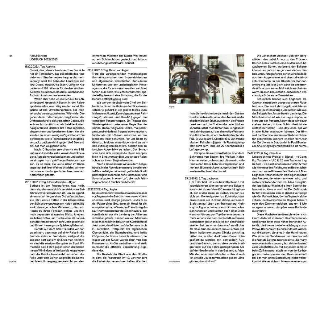 Die Sahara ist die größte Wüste der Welt, voller Sandmeere, bis zum Horizont reichender Kiesebenen, Sandsteingebirge und 3000 Meter hoher Vulkane. Im Dezember 2022 und Jänner 2023 hat die Fotografin Barbara Seyr gemeinsam mit dem Schriftsteller Raoul Schrott und seinem Team eine Reise dorthin unternommen. Von Algier bis nach Tamanrasset, vom Mittelmeer bis an den Sahel. Was sie dabei entdeckten, erfuhren und erlebten, haben sie in einem Logbuch festgehalten. Dieser Band ist ein auf- und anregendes fotografisches und literarisches Portrait dieser "Letzten Wüste". "Wüste bedeutet 'einsam, leer, roh und grob'. Ich mag die Weite, die das Wort mit dem englischen vast verbindet, und das Öde; bloß, weshalb? Eines aber ist die Wüste nicht, unförmig: im Gegenteil, in ihr kommen die ursprünglichen Formationen der Erde zum Vorschein, lange bevor sie begrünt und kultiviert wurden. Warum ich das mag, weiß ich."