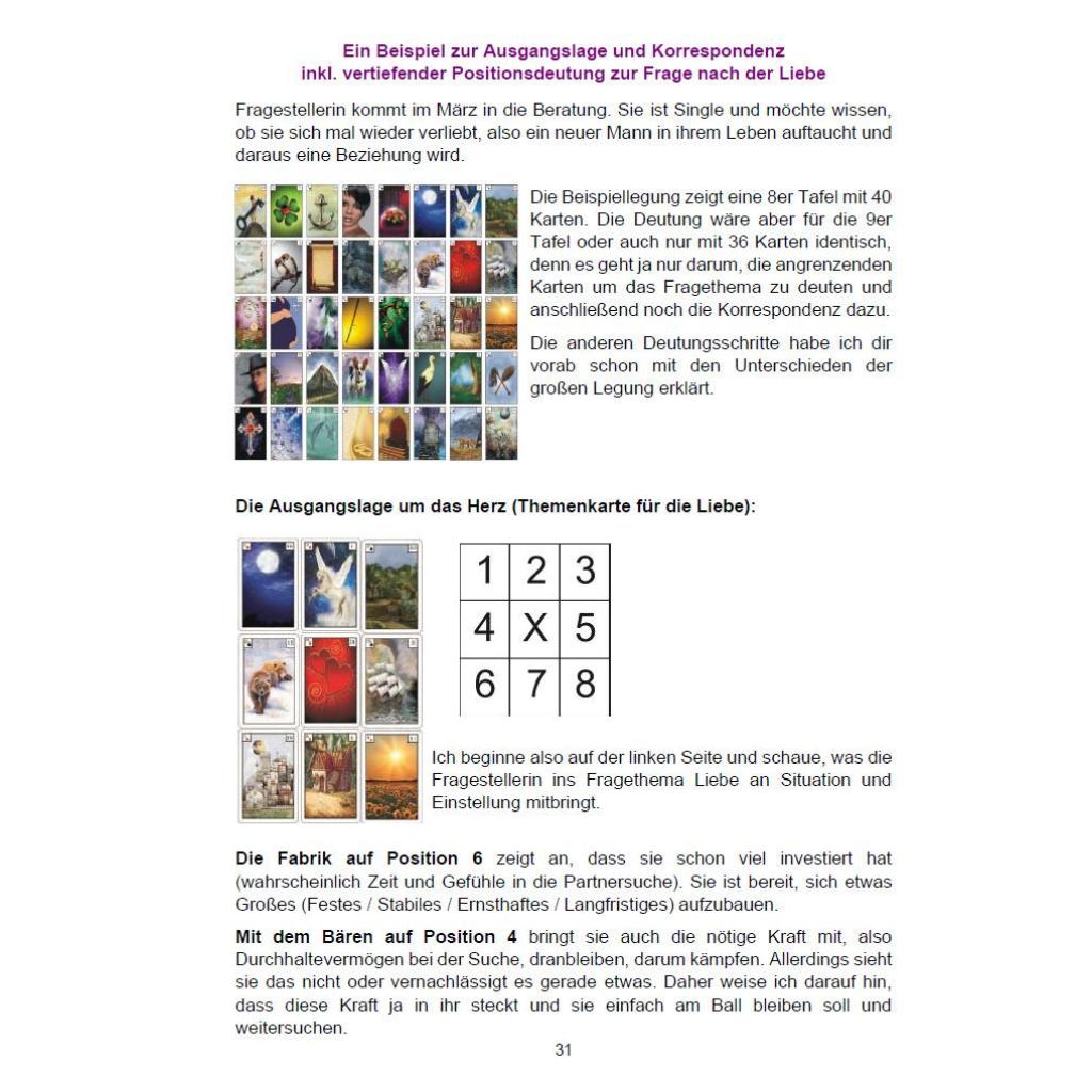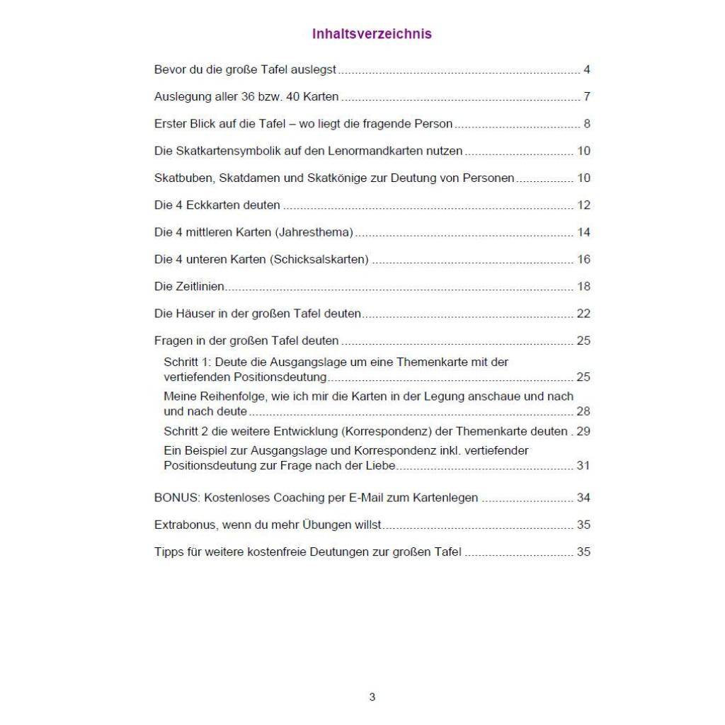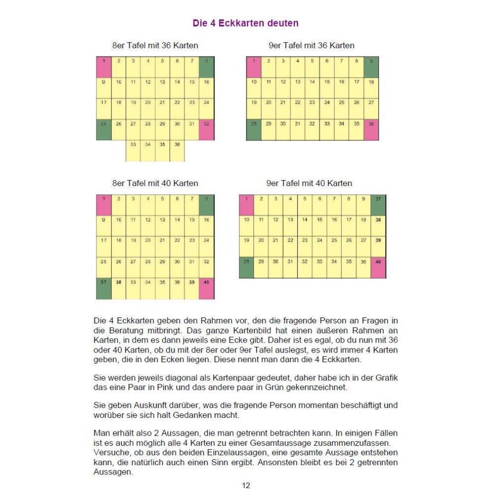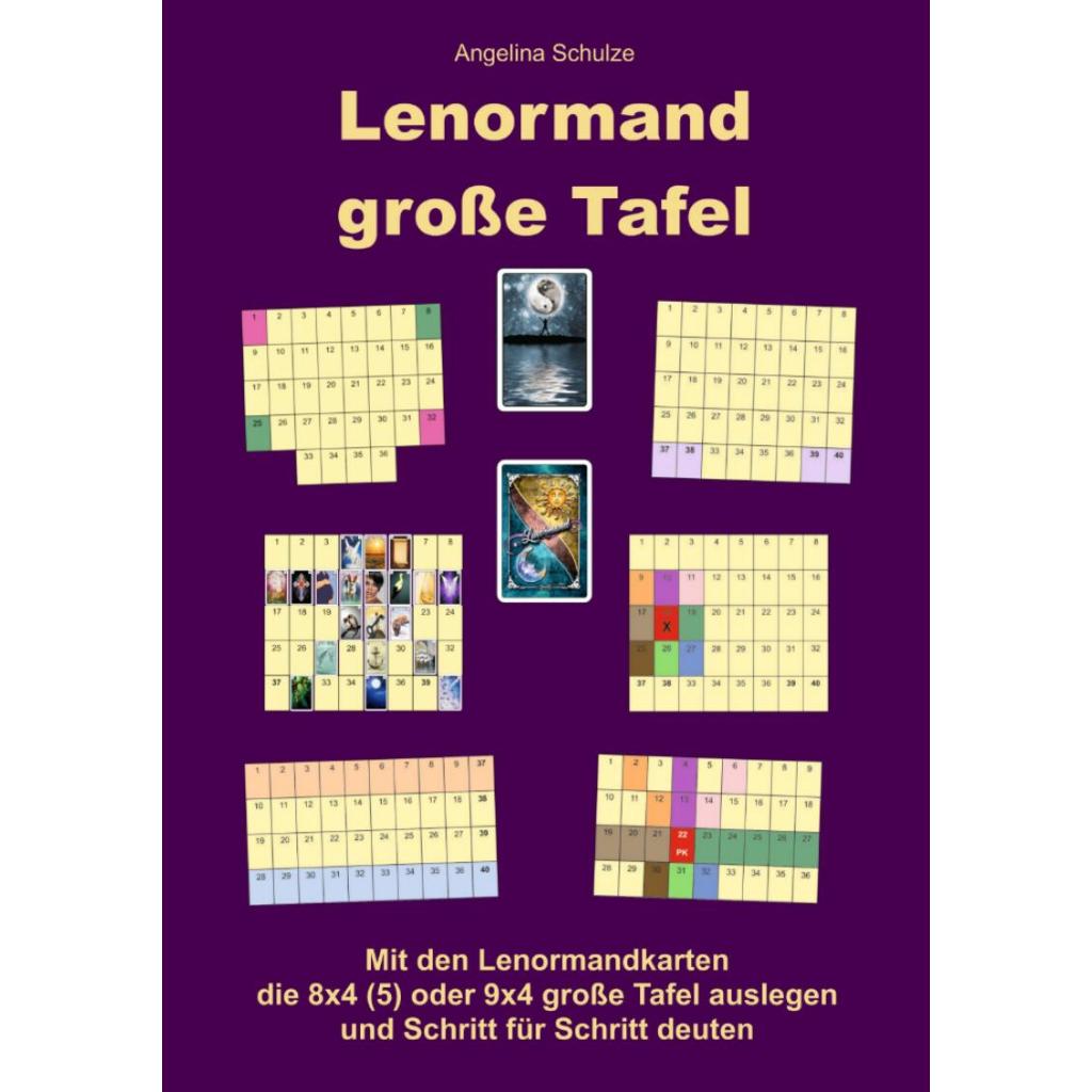 Kartenlegen lernen und deuten der großen Tafel mit den Lenormandkarten noch einfacher gemacht! So sind Freude und Faszination beim Deuten gleich zu Beginn an deiner Seite. Du bekommst hier eine Anleitung, die dir Schritt für Schritt die Deutungen der großen Tafel erklärt. Die einzelnen Seiten geben dir einen schnellen Überblick, was du wo und wie deuten kannst. Folgende Tafeln werden in dieser Anleitung erklärt: * Große Tafel in 8 x 4 für 36 Lenormandkarten (erweitert um 4 Karten in Reihe 5) * Große Tafel in 8 x 5 für 40 Lenormandkarten * Große Tafel in 9 x 4 für 36 Lenormandkarten * Große Tafel in 9 x 4 für 40 Lenormandkarten (erweitert um 4 Karten in Spalte 10). Vorteile dieser neuen Aufbereitung der großen Tafel Lenormand: ** Die Seiten sind in Spirale gebunden , damit du es aufgeschlagen flach auf den Tisch legen oder auch einfach umschlagen kannst (wie bei einem Kalender). ** Alles in Farbe , damit du die einzelnen Deutungsschritte gut nachvollziehen kannst, da wichtige Positionen immer farblich gekennzeichnet sind. ** Um lange an den Übersichten Freude zu haben sind alle Seiten beidseitig mit einer glänzenden Schutzfolie überzogen. ** Das Papier ist mit 170g und mit der Schutzschicht griffiger als normales Buchpapier. ** Alle Deutungsschritte der großen Tafel sind übersichtlich, schnell erfassbar zusammengestellt und dazu ein Beispiel, welches die Deutung in der Praxis zeigt. Es wendet sich in erster Linie an Kartenleger, die für sich selbst die Lenormandkarten deuten oder für spätere Lebensberatungen das Kartenlegen lernen möchten und sich den Einstieg ins Karten deuten mit der Anleitung zur großen Tafel erleichtern wollen. Die folgenden Themen sind in diesem Buch enthalten: * Was vor dem Auslegen der großen Tafel wichtig ist * Wie du die große Tafel in den verschiedenen Varianten als 8er oder 9er Tafel mit 36 oder 40 Lenormandkarten auslegen kannst * Erster Blick auf die Legung: wo liegt die fragende Person? * Wie du die Skatkarten Symbolik mit Herz, Karo, Kreuz, Pik und auch die zusätzlichen Personen mit den Königen, Damen und Buben mit einbeziehen kannst * 4 Eckkarten deuten * Jahresthema deuten * 4 unteren Karten (Schicksalskarten) deuten * Zeitlinien mit Vergangenheit, Gegenwart und Zukunft deuten * Häuserdeutung * Wie du Fragen beantwortest (in 2 Schritten mit Ausgangslage und Korrespondenz inkl. vertiefender Positionsdeutung und Zeitangabe erklärt). * Beispiele zu den einzelnen Deutungsschritten * Tipps für weitere kostenfreie Beispiele Was dieses Buch nicht enthält sind Auflistungen, was die einzelnen Karten bedeuten. Nutze dafür bitte meinen Bonus, den es zu jedem Buch von mir mit dazu gibt. Im Bonusbereich bekommst du E-Mails mit Links zu Blogbeiträgen und kostenfreien Videos, in denen ich dir all das erkläre und auch weitere Beispiele der Deutungsschritte in kleinen und großen Legungen gebe. BONUS: Kostenfreier E-Mail Kurs der Lenormand Königsklasse mit Deutungen von Lenormandkarten, Kombinationen und vielen Tipps zum Kartenlegen lernen.