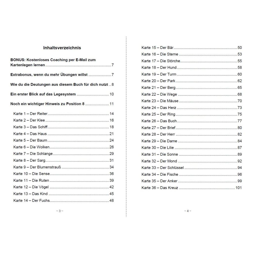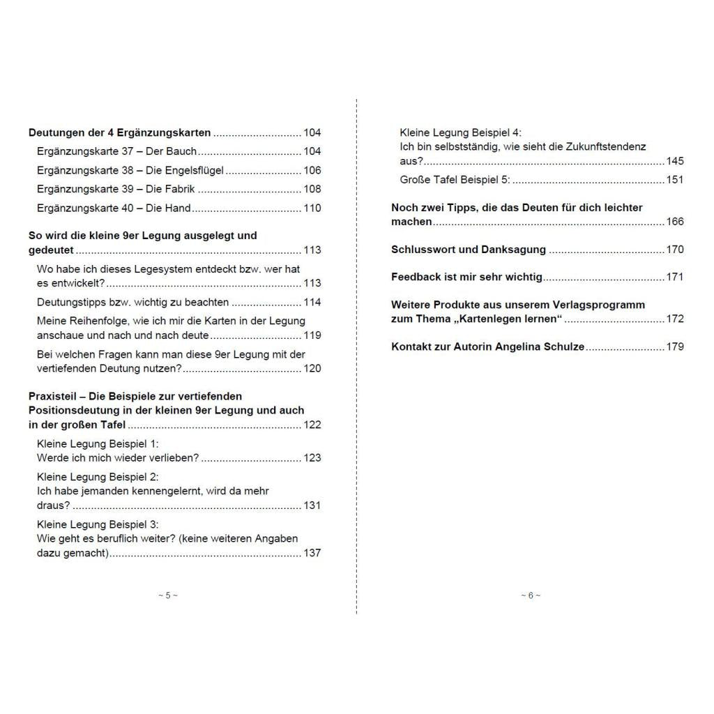 Kartenlegen mit den Lenormandkarten, um klare und helfende Antworten bei Fragen in der Lebensberatung zu erkennen. Schonend für die Augen in etwa A4 Format mit Schriftgröße Arial 16. Dieses Kartenlegen lernen Lenormand Buch wendet sich in erster Linie an Kartenleger, die für sich selbst die Lenormandkarten deuten oder es auch bereits in der Lebensberatung anbieten. Bei diesem Legesystem ziehst du 9 Karten und kannst es auch direkt in die große Tafel übertragen. Einmal das Deutungskonzept verstanden, ist es damit möglich, in kleinen und großen Legungen, so gut wie alle Fragen zu beantworten. Du bekommst durch die Karten wertvolle Hinweise, wo noch die Baustellen, also Probleme beim Fragethema sind, aber vor allem, was als Nächstes zu tun ist, wie der Ratschlag der geistigen Welt an dich ist (übermittelt durch die Lenormandkarten). Was dieses Legesystem dir an Antworten ermöglicht * Du deutest zunächst, was ins Fragethema mitgebracht wird, so gesehen wie ein Rucksack, der im Gepäck dabei ist. * Dann schaust du dir die Gedanken und Gefühle zum Thema an. * Wie sieht die derzeitige Situation aus (die Gegenwart deuten)? * Was ist der Ratschlag und sollte als Nächstes getan werden? * Welche Zukunft ist durch das eigene Handeln möglich bzw. was sollte man auch berücksichtigen und zusammen mit dem Ratschlag tun? * Welche Zukunft entsteht durch das Handeln und die Reaktionen von anderen (aus dem Umfeld) und worauf solltest du dich einstellen, weil es dir entweder helfend oder störend entgegenkommt. * Das Ergebnis: worauf läuft alles hinaus, was bekommst du am Ende bzw. hast du dir selbst erschaffen? Um dir zu zeigen, wie einfach du mit meinen Deutungen eine Legung deuten kannst, gibt es 3 wichtige Elemente in diesem Buch. 1. Du kannst jede einzelne Kartenposition in diesem kleinen Legesystem nachlesen. Besonders für Anfänger ist das sehr hilfreich, da du die Deutung nur ablesen und ein wenig an deine Frage anpassen brauchst und schon hast du eine treffende und hilfreiche Antwort. Fortgeschrittene können diesen Teil natürlich überspringen und ihre eigene Deutung und Intuition in die Antworten einfließen lassen. 2. Erfahre, wie die Legung funktioniert. Mache es einfach nach und staune, wie gut man diese erkenntnisreiche Legung bei allen möglichen Fragen in der Lebensberatung einsetzen kann. 3. Abgerundet wird das Buch mit 5 Legebeispielen, wovon 4 die Praxis in der kleinen 9er Legung zeigen. Das Beispiel 5 zeigt dir die Anwendung in der großen Tafel, also wie du das Deutungskonzept ins große Kartenblatt überträgst und dort zu deinen hilfreichen Antworten kommst. BONUS: Kostenfreier E-Mail Kurs der Lenormand Königsklasse mit Deutungen von Lenormandkarten, Kombinationen und vielen Tipps zum Kartenlegen lernen. EXTRABONUS: Kostenfreier E-Mail-Video Kurs der Lenormand Power. Hier gibt es unbekannte und neue Legungen und Übungen für dich, alles per Video erklärt, inkl. meiner Deutungen zum Kartenlegen lernen.