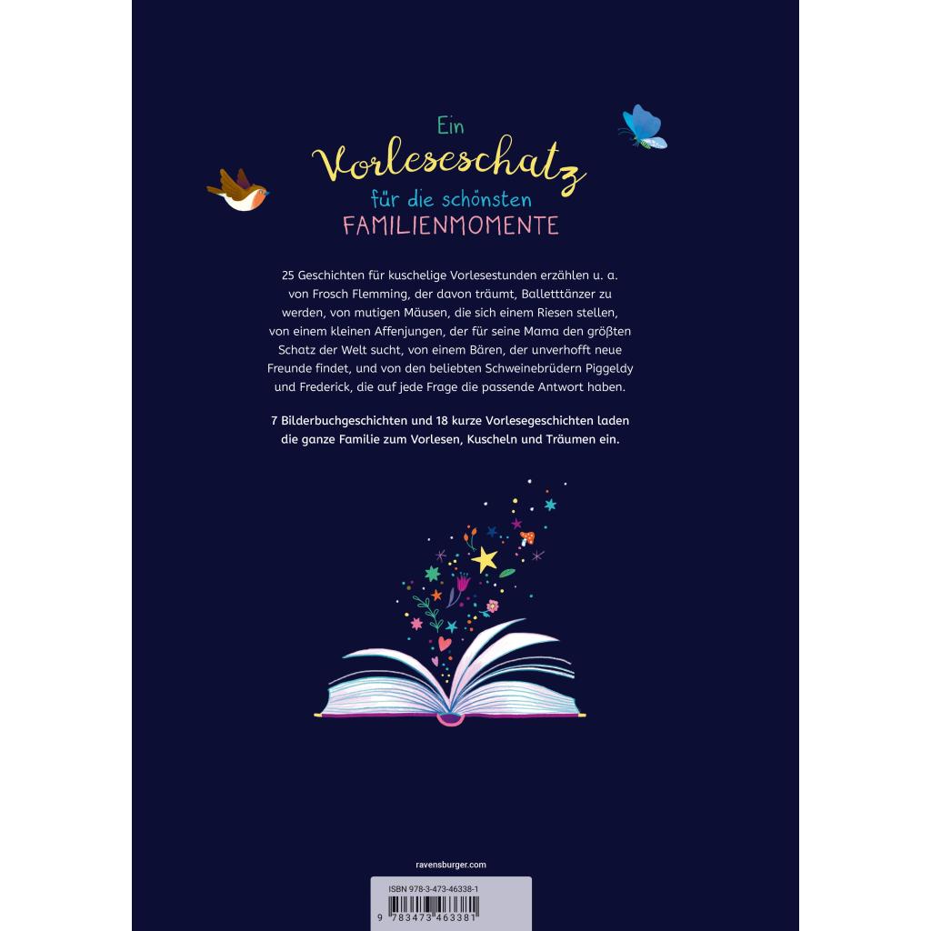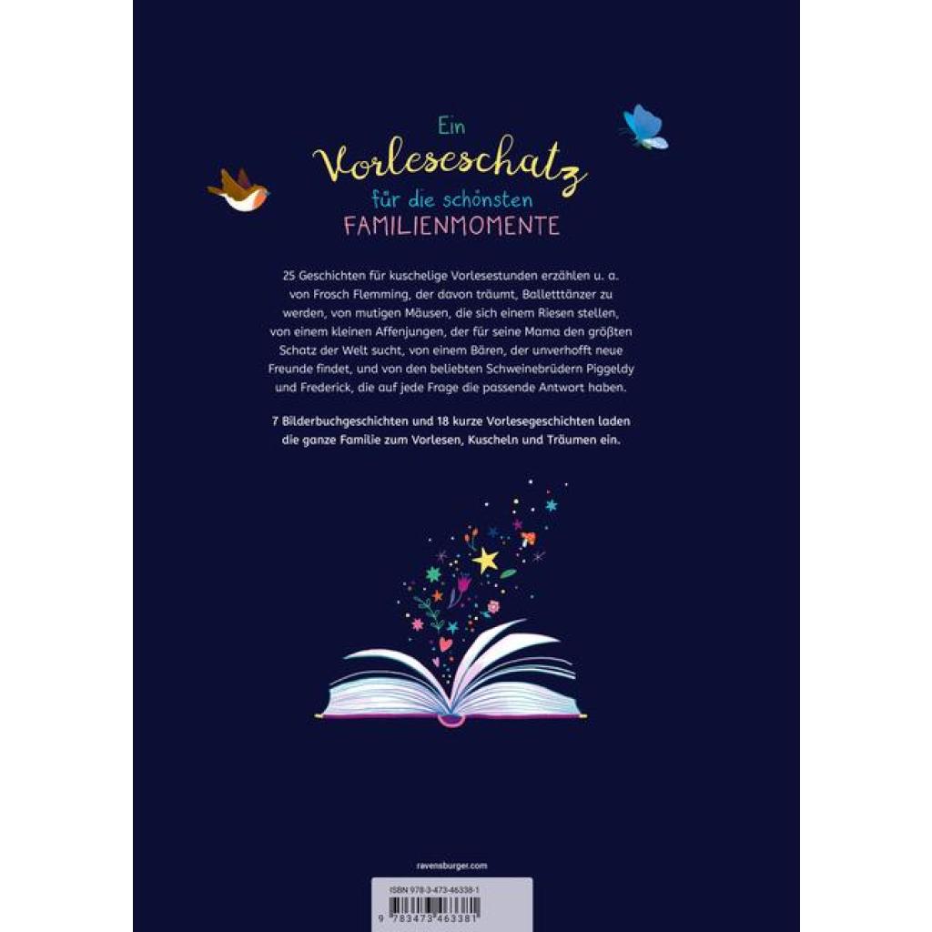Ein Vorleseschatz für kuschelige Familienmomente Ein dickes Vorlesebuch mit acht Bilderbuchgeschichten zum Immer-wieder-Vorlesen, denn in dieser Sammlung findet garantiert jedes Kind seine Lieblingsgeschichte. Die Geschichten erzählen von mutigen Tieren, einfallsreichen Kindern, von einem tanzenden Frosch, von klugen Schweinen und vom allergrößten Schatz, den man sich nur vorstellen kann. Weil Familienzeit die wichtigste Zeit ist! Der Sammelband enthält Bilderbuch- und Vorlesegeschichten von vielen bekannten Autorinnen und Autoren, die Klein und Groß mitnehmen auf eine Reise ins Land der Träume und der Fantasie. Dort treffen wir u.a. einen Frosch, der davon träumt, Balletttänzer zu werden, drei mutige Mäuse, die sich einem Riesen stellen, einen kleinen Affenjungen, der für seine Mama den größten Schatz der Welt sucht, einen Bären, der unverhofft neue Freunde findet, die beliebten Schweinebrüder Piggeldy und Frederick, die auf jede Frage die passende Antwort haben, uvm.