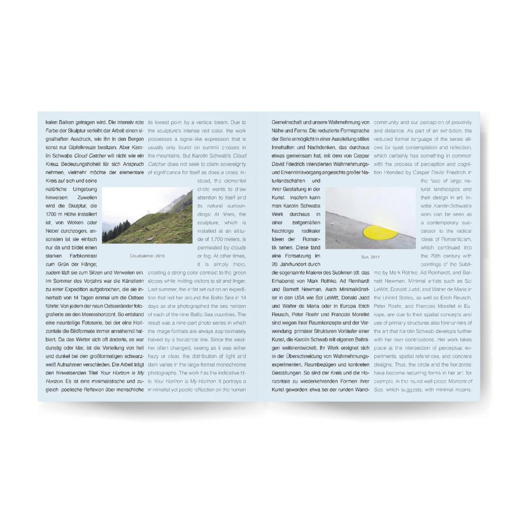 Wenn es so etwas gibt, wie das ästhetische Überraschungsmoment einer Skulptur, dann wäre es hier, dass die äußere Form der inneren einen Raum eröffnet, den man so bislang nicht wahrgenommen hat. Die Arbeiten, die Karolin Schwab für "inside out | outside in" zusammengetragen hat, macht dies zu einer der vielleicht bemerkenswertesten jüngeren Entdeckungen im Bereich Land-Art. Denn die junge Berliner Künstlerin nutzt Landschaft als eine Art Framework für die Wahrnehmung von Fläche, Struktur und Raum. Ihre Arbeiten erscheinen auf den ersten Blick zunächst wie einzeln verstreute "land marks" einer imaginären Landkarte, die sich von der Ostsee über die Schweizer Alpen bis nach Virginia erstreckt. Schaut man jedoch genauer hin, ergeben sie eine faszinierende tour d'horizon, die elementare Fragen der Natur-Betrachtung reflektieren. Und dabei mitunter zu überraschenden Schlüssen kommt, wie diese kleine handschriftliche Notiz zeigt: Schwabs Arbeiten fesseln nicht nur durch die bestechend schlichte Form, sie tun es auch, weil sich dahinter eine intensive Auseinandersetzung mit physikalischen Gegebenheiten verbirgt, wie der räumlichen Auswirkung von "Zeit", dem Wahrnehmen von Form, und, selbstredend, der Bedeutung der Perspektive dafür. In einer ihrer früheren Arbeiten hat Karolin Schwab dazu ein Experiment des britischen Autors Edward Abbott zitiert, der diesen komplexen Zusammenhang anschaulich erläutert: "Place a penny on the middle of one of your tables in space, look down from the top of it. It will look like a circle. But then, draw back to the edge of the table, and gradually lower your head and thus your eye (...) and you will find the penny more and more oval; and at the least (...) a straight line. (aus: Edward Abbott, "Flatland", 1884) Schwab bezeichnete Abbotts Überlegung mal als Schlüsselerlebnis. Und es sieht so aus, als würde sie den spielerischen Umgang mit Perspektive auch jetzt wieder wie ein unsichtbarer, roter Faden fortsetzen. Was sie daran so fasziniert? Nun, darüber gibt eine andere Notiz Auskunft. Denn: "Other ways of seeing lead to other ways of knowing." "inside out | outside in" entpuppt sich so als gelungene Dekonstruktion des cartesianischen Raums und zugleich formgewordenen Gegenentwurf. Die lose eingestreuten Notizen und Gedankensplitter tun das Ihre dazu, die Plastiken aus dem Bild- in den Sprachraum zu verlängern. Nicht, dass die Arbeiten das gebraucht hätten. Dennoch. Missen möchte man sie auf keinen Fall.