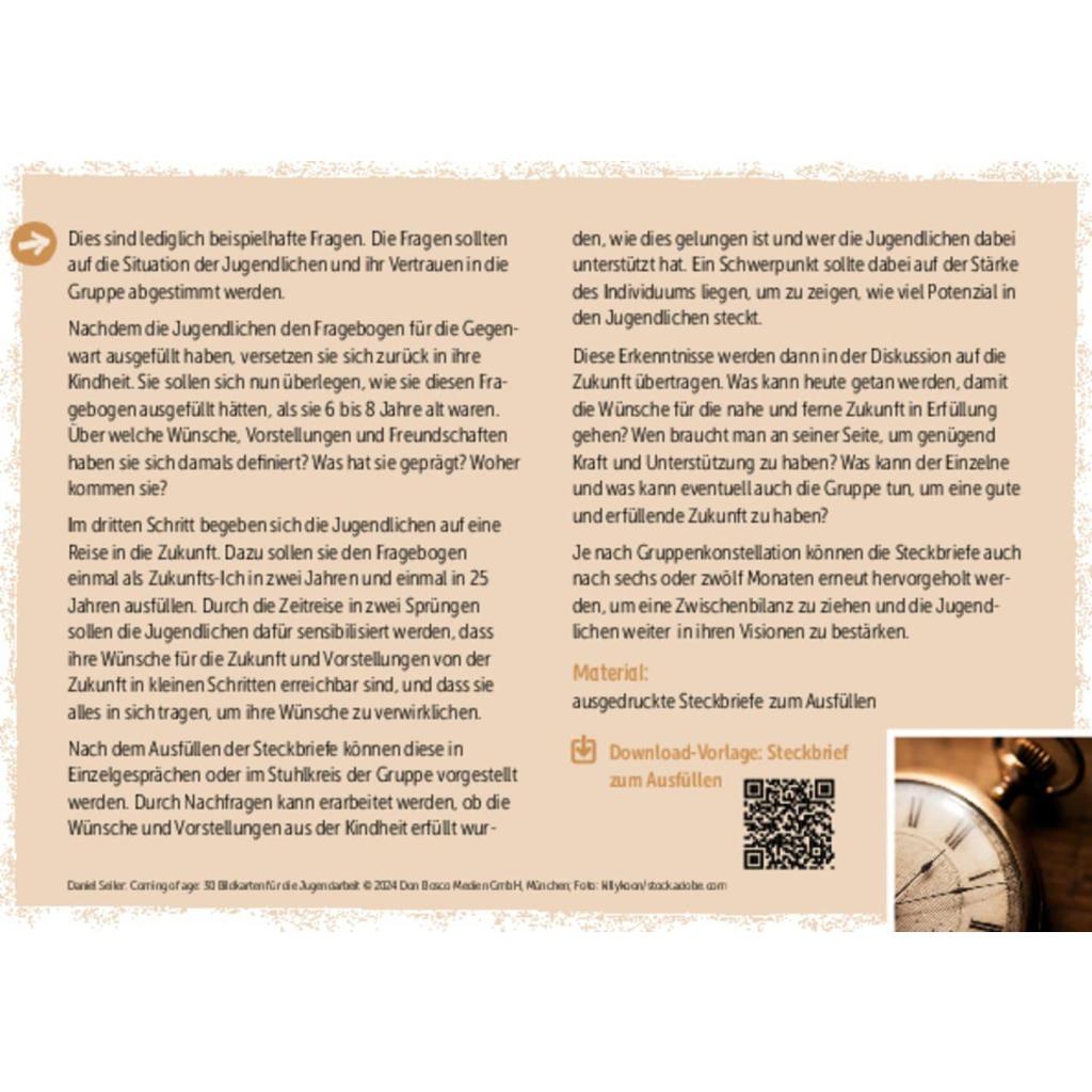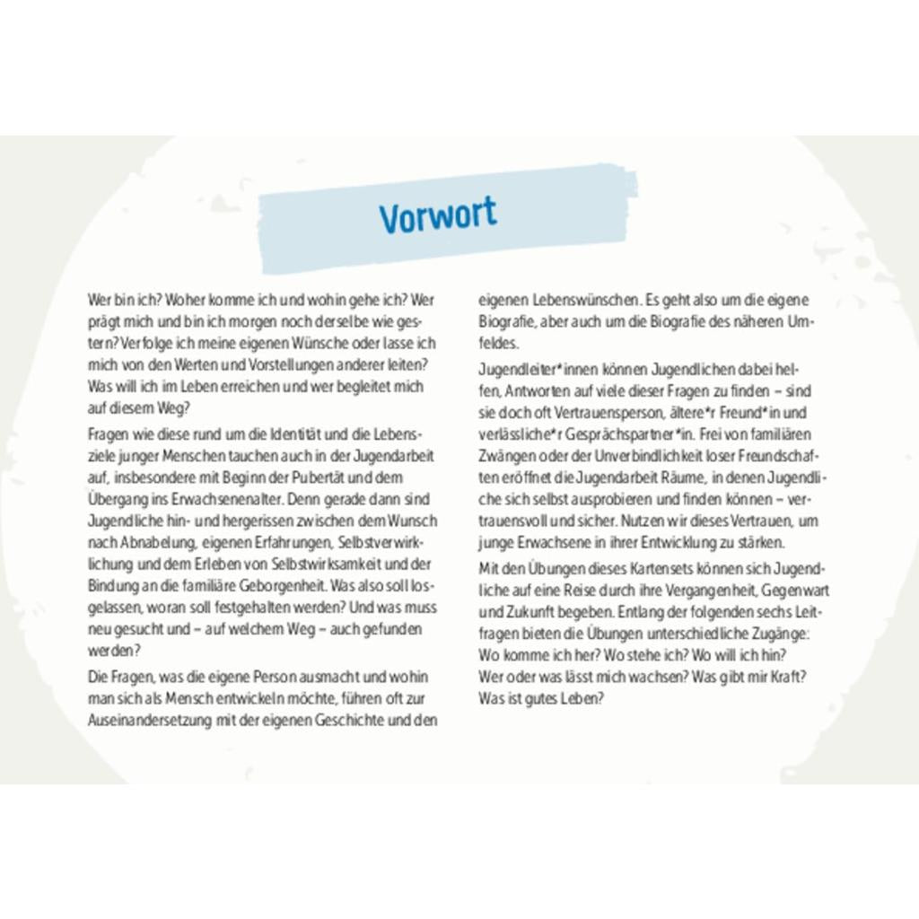 | Keyword: | adoleszenz; bildkarten; biografiearbeit; biografiearbeit methoden; identitätsfindung; lebenswünsche; persönlichkeitsentwicklung coaching; pubertät; pädagogische projekte in der jugendarbeit; selbstfindung; selbstreflexion; selbstzweifel; teenager beratung; werte im leben; zukunftswünsche |
