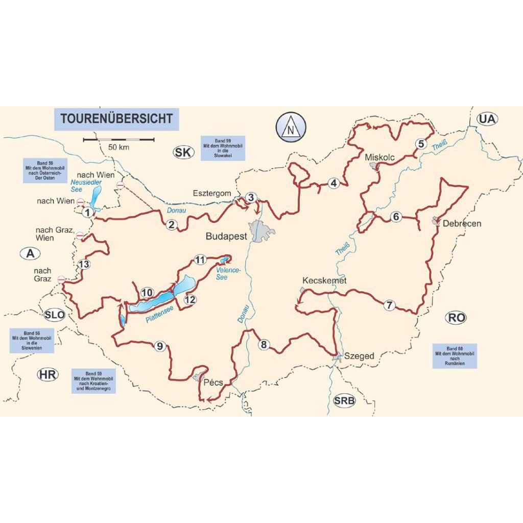 TOURENKARTEN Folgen Sie uns auf rund 4100 km in 13 Touren (rot markiert) - durch weite Ebenen und herrliche Mittelgebirgsregionen mit über190 durchnummerierten Übernachtungsplätzen - frei oder offiziell; zu den bekanntesten und vielen unbekannten Natur- und Kulturschätzen. NATUR ERLEBEN, WANDERN Unternehmen Sie mit uns erholsame Spaziergänge durch herrliche Parkanlagen sowie leichte und anspruchsvolle Wanderungen. Lassen Sie sich entführen in die bisweilen schier enendlichen Weiten der Pußta mit all ihren kleinen Geheimnissen. KULTURSCHÄTZE, STÄDTE Streifen Sie durch romantische mittelalterliche Städte und idyllische Dörfer, in denen das Brauchtum noch gepflegt wird wie in alten Zeiten; mit eindrucksvollen altehrwürdigen Bauwerken, imposanten Kirchen, trutzigen Burgen als Zeugen einer bewegten Geschichte. WASSER ERLEBEN, BADEN Der berühmte warme Balaton, der Velencesee und Flüsse wie Donau und Theiß laden zum Baden, Fischen oder Bootfahren ein. Viele herrlich warme Thermalbäder versprechen Entspannung und Erholung. Kindern und Junggebliebenen bieten die Spaßbäder pures Badevergnügen. WOMO-SERVICE Freies Übernachten ist kein Problem. Wir beschreiben aber auch die schönsten Campingplätze an den Touren sowie viele Brunnen zur einfachen Trinkwasserversorgung. Wir leiten Sie zu spannenden Sehenswürdigkeiten und natürlich zu den verschiedenen Stellplätzen.
