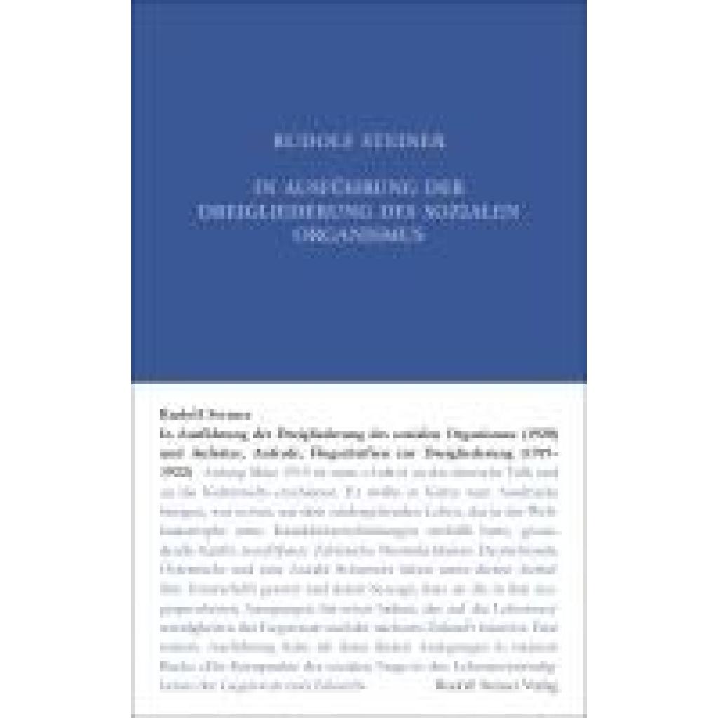 Das Schrifttum zur Dreigliederung - jetzt chronologisch geordnet Die letzte Ausgabe des Bandes GA 24 ist 1982 erschienen. Für die neue, dritte Auflage wurde er vollständig überarbeitet; die Schrift 'Gedanken während der Zeit des Krieges' wurde zusammen mit weiteren Texten zum Weltkriegsgeschehen ausgegliedert und dem in der Gesamtausgabe erschienenen Band GA 19 zugeordnet. Der Band trägt neu den Titel, den Rudolf Steiner selbst seiner 1920 zusammengestellten Aufsatzsammlung gegeben hat. Eine weitere wesentliche Neuerung ist die chronologische Anordnung der in dem Band GA 24 abgedruckten Aufsätze. So lässt sich nun der Weg von Rudolf Steiners öffentlichem Kampf für die Dreigliederung Jahr für Jahr mitverfolgen. Alle Texte wurden sorgfältig mit der Ausgabe letzter Hand verglichen und, wo nötig, rückkorrigiert. Beim Aufsatz 'Staatspolitik oder Menschheitspolitik' wird neu der französische Erstdruck publiziert, gefolgt von der deutschen Manuskriptfassung. Dem Band ist am Ende ein Verzeichnis aller Aufsätze Rudolf Steiners zu sozialen Fragen und zu Zeitfragen beigegeben. Weitere Dokumente wie Titelseiten und Abbildungen von Erstdrucken vervollständigen die Ausgabe.