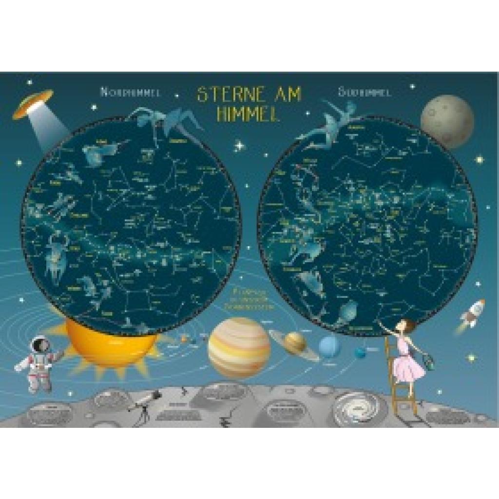 Sterne am Himmel: Sternenkarte für Kinder Die illustrierte Karte zeigt den Blick in den Himmel vom Nordpol und vom Südpol aus in zwei Hemisphären. Dabei werden Sternbilder, unter anderem Großer Bär, Kassiopeia, Orion, Großer Hund, Centaurus, Crux, Carina und Grosser Wagen, gezeigt. Die 12 Sternzeichen oder Tierkreiszeichen sind durch Illustrationen dargestellt. Neben den Hemisphären mit der Milchstraße wird unser Sonnensystem mit seinen 8 Planeten gezeigt. Weitere Himmelskörpern, Nebel, Sternhaufen, Galaxien und unserer Milchstraße werden leicht verständlich erklärt. Diese Sternkarte für Kinder ist der ideale Wandschmuck für jedes Kinder- und Jugendzimmer. Sie ist in drei Größen erhältlich: 140x100cm (nur Deutsch), 130x93cm (Deutsch und Englisch), 100x70cm (Deutsch und Englisch), gerollt
