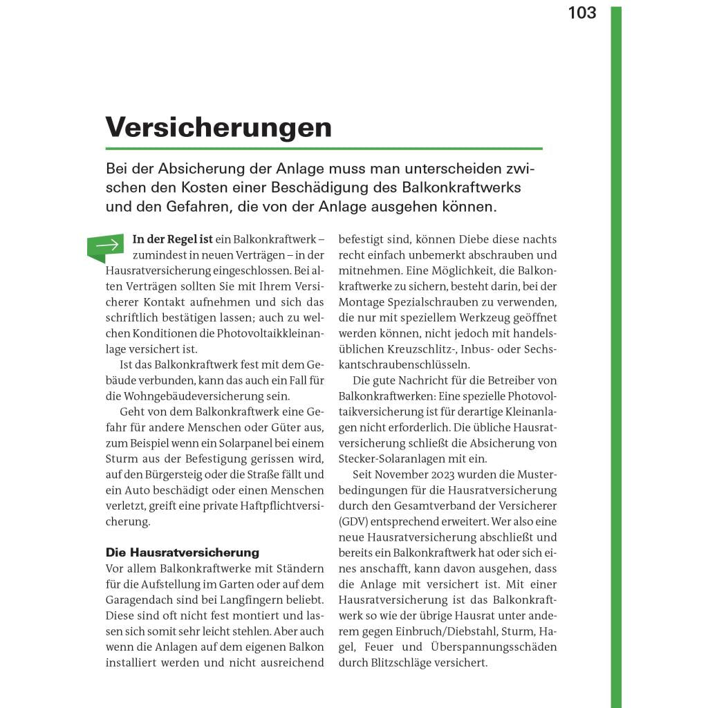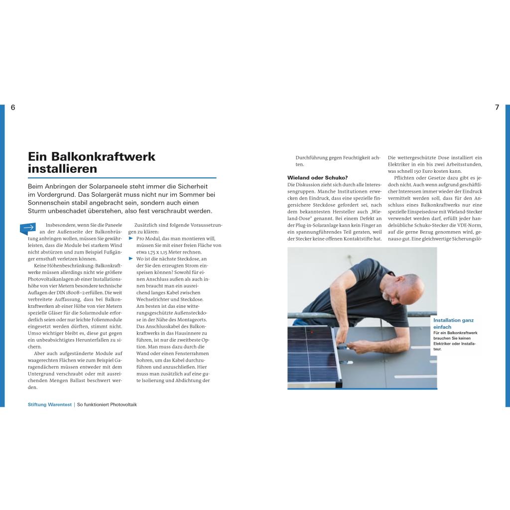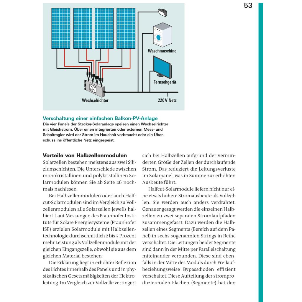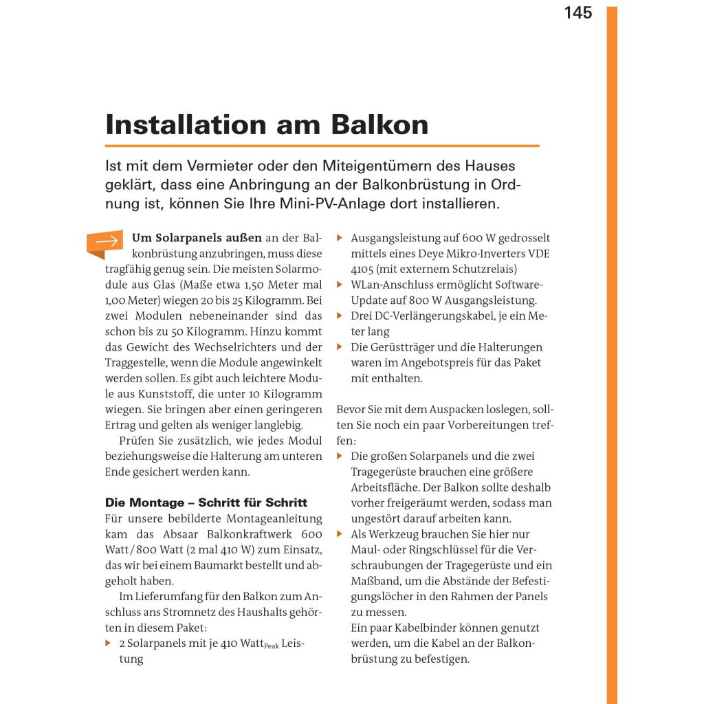 Solarstrom für alle - Stromkosten sparen mit Sonnenenergie Sie können oder wollen keine komplette Photovoltaikanlage auf dem eigenen Dach installieren? Dann sind sogenannte Steckersolaranlagen, auch Balkonkraftwerke genannt, eine preiswerte und einfach zu handhabende Alternative für Sie. In diesem Ratgeber erfahren Sie, wie Sie Ihren eigenen Strom erzeugen und eine kleine Solarstromanlage auf Ihrem Balkon, Garagendach oder Ihrer Terrasse selbst installieren können. Solarpanele für den Balkon sind prädestiniert für Heimwerker, denn sie müssen nicht vom Elektriker angeschlossen werden und die Genehmigung des Vermieters oder der Eigentümergemeinschaft kann nur in besonderen Fällen verweigert werden. Balkonkraftwerke können bis zu 20 Prozent des Grundbedarfs an Strom decken. Die Musterrechnungen im Handbuch helfen Ihnen, die beste und günstigste Lösung für Ihren persönlichen Bedarf zu finden, egal ob Sie Photovoltaikmodule an der Balkonbrüstung befestigen oder auf dem Flachdach einer Garage aufstellen wollen. Je nach Leistung hat sich eine Balkonsolaranlage innerhalb von sechs bis neun Jahren amortisiert. Das Buch unterstützt Sie nicht nur bei der Planung und Auswahl des für Sie geeigneten Solarkraftwerks, sondern auch bei der Umsetzung mit detaillierten Anleitungen zu Installation, Betrieb und Wartung. Außerdem berät Sie der Leitfaden bei allen technischen und rechtlichen Fragen. - Strom erzeugen mit Solarenergie - Ökobilanz von Solarstrom und Technik - Wie Balkonkraftwerke funktionieren - Module, Wechselrichter, Leistung, Ertrag, Stand der Technik - Voraussetzungen für den Betrieb - Recht & Gesetz, Gewährleistung & Garantie, Versicherungen, Förderung - PV-Anlage planen - Stromverbrauch und -bedarf, Kaufen, Bastler & Recycler - Balkonkraftwerk installieren - Optimierung, Montageanleitung - Die Solaranlage optimal nutzen - Pufferspeicher, Smart Home, Pflege & Wartung