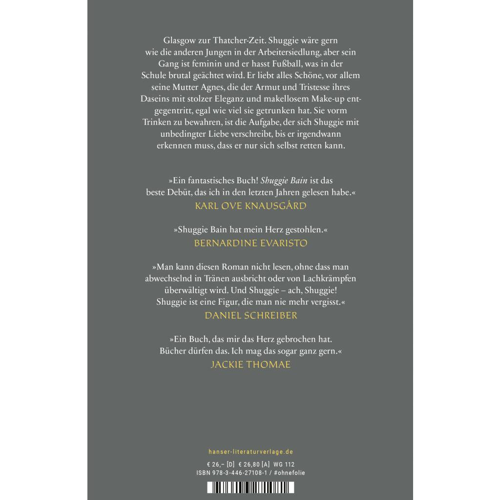 | Keyword: | #ohnefolie; 1980; Alkohol; Arbeiterfamilie; Arbeitslosigkeit; Armut; Bergwerke; Booker-Prize; Familie; Fürsorge; Gewalt; Glasgow; Hoffnung; Industrie; Klasse; Kohleregion; Liebe; Mutter; Schottland; Sucht; Taxifahrer; Thatcher; Zärtlichkeit; homosexuell; prekär; schwul |