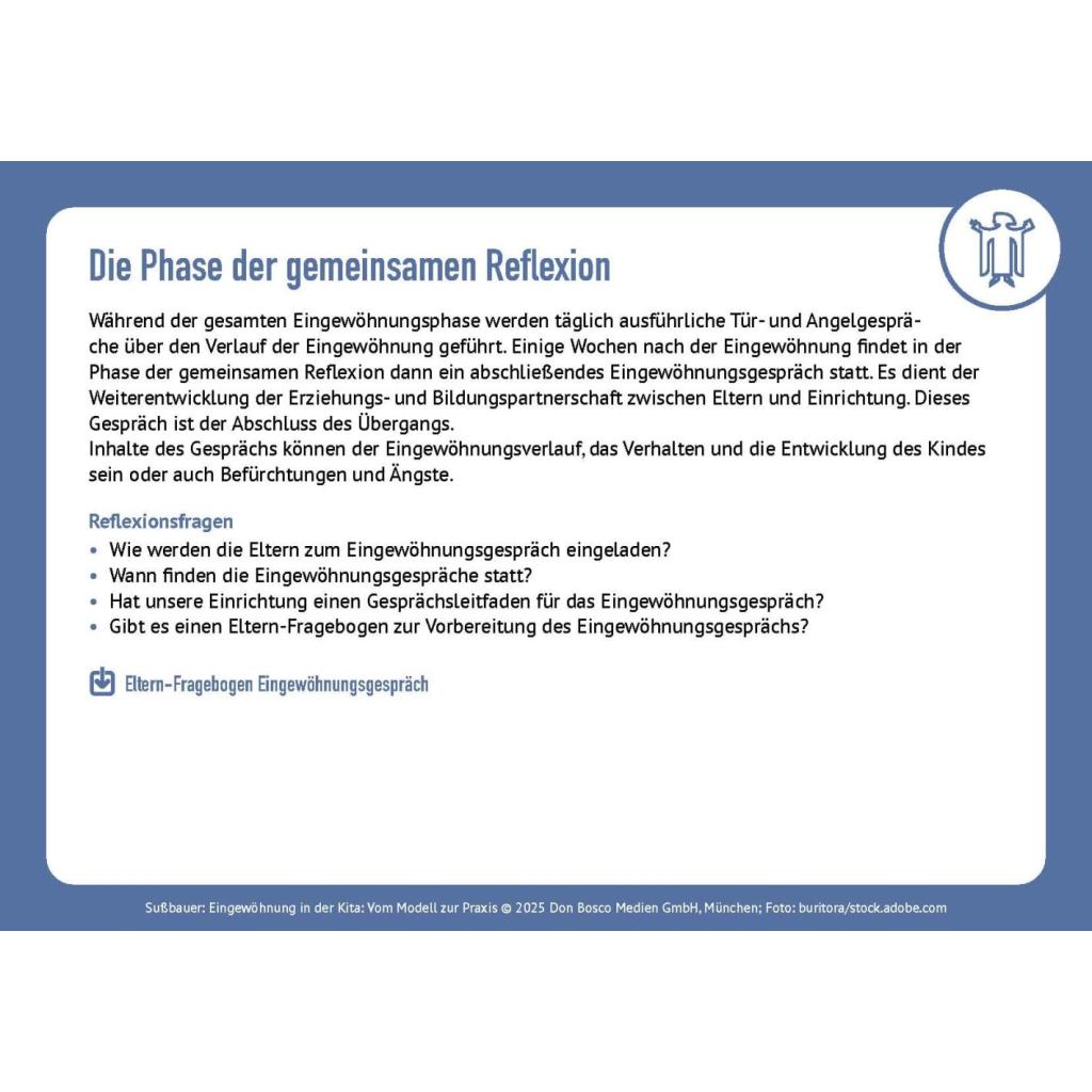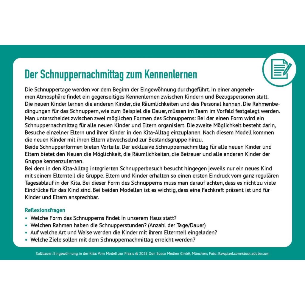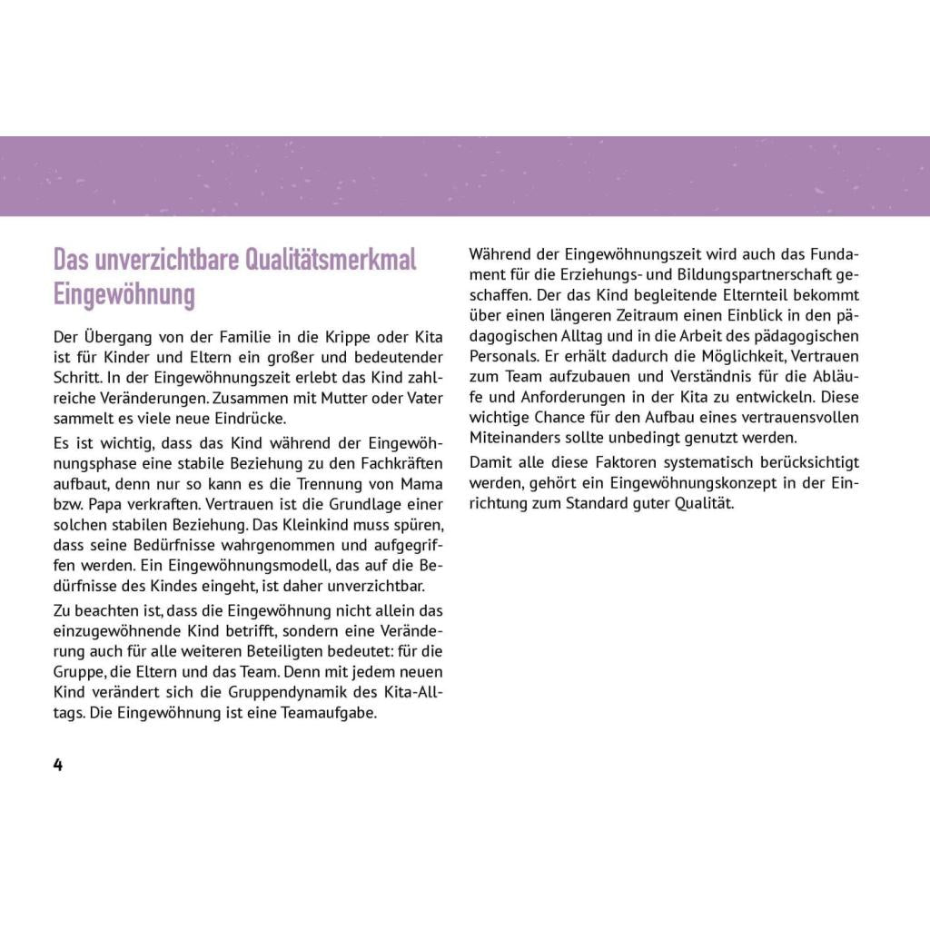 | Keyword: | eingewöhnung berliner modell; eingewöhnung kita; eingewöhnungsphase kita; elternarbeit; impulskarten; kita eingewöhnung ablauf; kita eingewöhnung tipps; krippeneingewöhnung; methodenkarten; münchner modell eingewöhnung; partizipative eingewöhnung; qualitätsmanagement kita; reflexionsfragen; tagesmutter eingewöhnung; tübinger modell eingewöhnung |