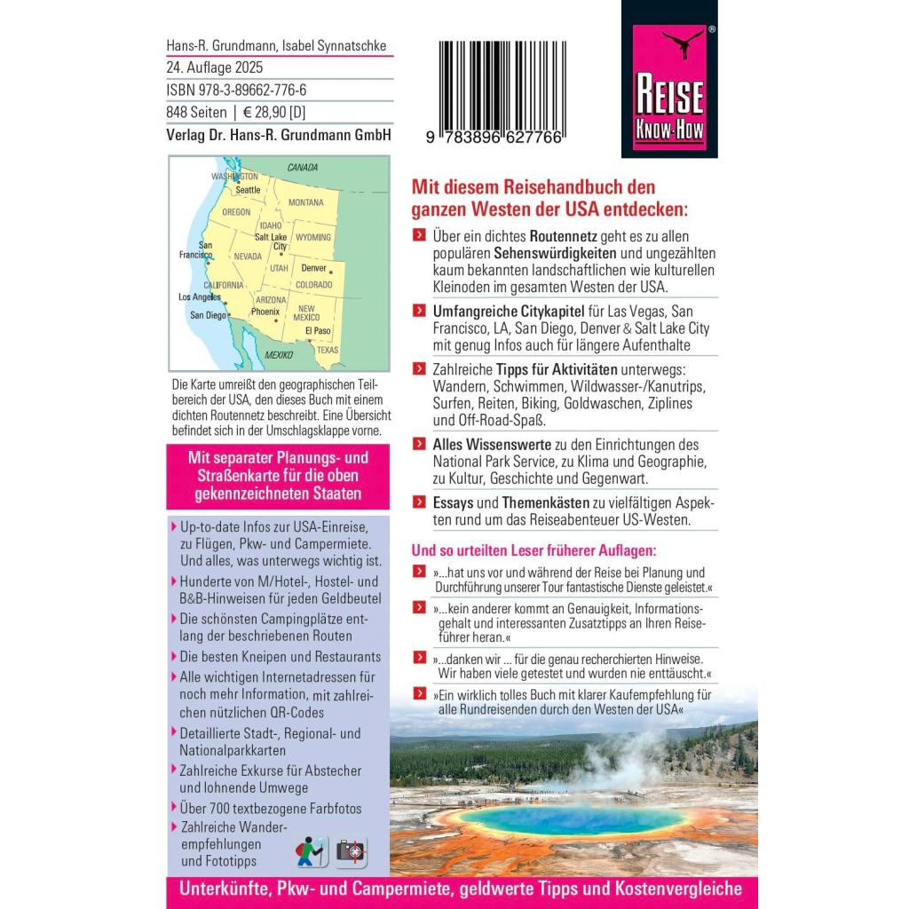 Der Westen der USA lockt nicht nur mit Highlights wie San Francisco und Los Angeles, Grand Canyon und Yellowstone Park, Las Vegas und dem Wilden Westen. Grandiose Landschaften und Naturwunder, präkolumbische Relikte und die Kultur der indigenen Völker, wildromantische Küsten, glasklare Seen und Flüsse machen das Reisen auch abseits der üblichen Pfade zum Erlebnis. Dieses Buch führt den Leser über ein dichtes Netz von Reiserouten zu allen populären Sehenswürdigkeiten und unzähligen kaum bekannten Kleinoden in den elf Weststaaten. Der Aufbau des reisepraktischen Teils folgt dem zeitlichen Ablauf vom Erwägen einer USA-Reise über die konkrete Planung und Vorbereitung bis hin zum touristischen Alltag unterwegs. Der Leser findet Kostenvergleiche und Entscheidungshilfen, zahlreiche praxisbezogene Tipps und Hinweise.