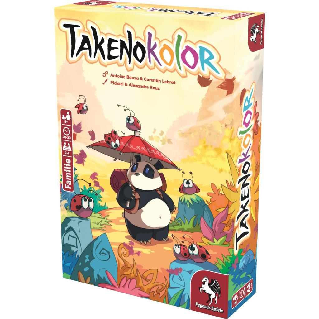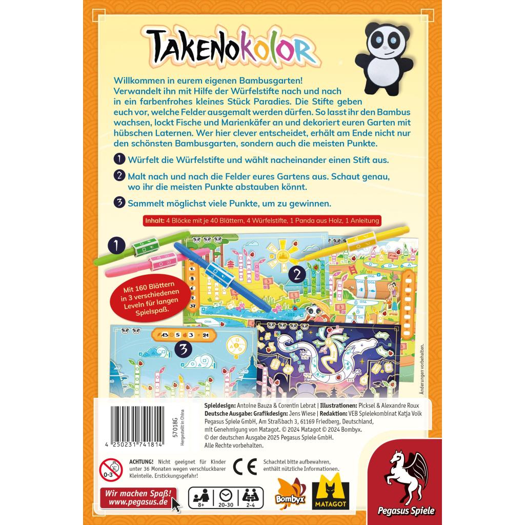 Das bunte Bambusparadies wächst und gedeiht, prächtige Wasserspiele und dekorative Laternen schmücken den Garten. Mit etwas Geschick und Glück werden dort bald auch Marienkäfer und Fische ihr neues Zuhause finden. In dem Roll-&-Write-Spiel Takenokolor haben alle Spielenden ihren eigenen Garten vor sich ausliegen. Damit sich dieser zu einem bunten Bambusparadies mit vielen Siegpunkten verwandelt, müssen die freien Felder ausgemalt werden. Welche Farbe bzw. welches Symbol gefüllt werden darf, geben Würfelstifte vor, die zu Beginn jeder Runde geworfen werden. Reihum dürfen sich dann nacheinander alle einen dieser Stifte aussuchen und die Farb-Symbol-Kombination ausmalen, die der gewählte Würfelstift zeigt. Alle vier Spielpläne unterschieden sich dabei nicht nur optisch, sondern auch durch leicht modifizierte Spezialregeln und verschiedene Schwierigkeitsgrade.
