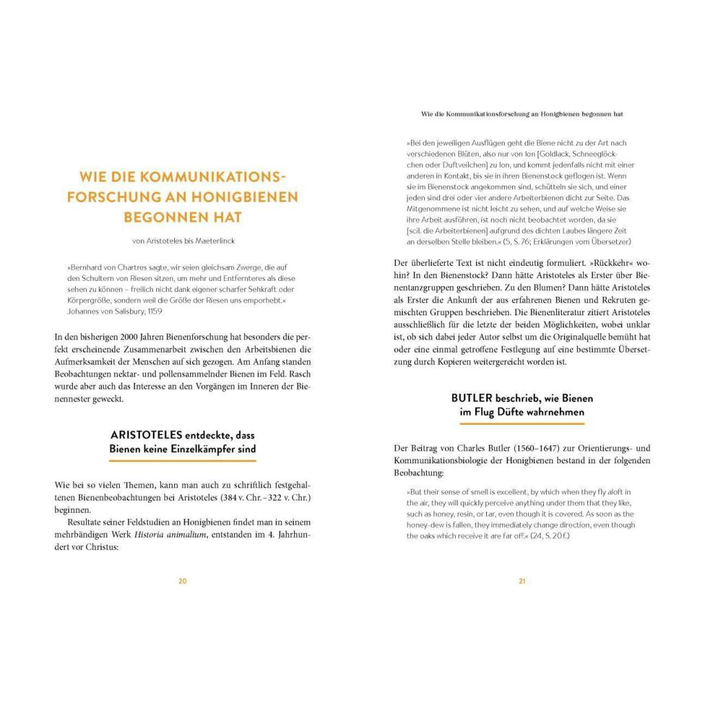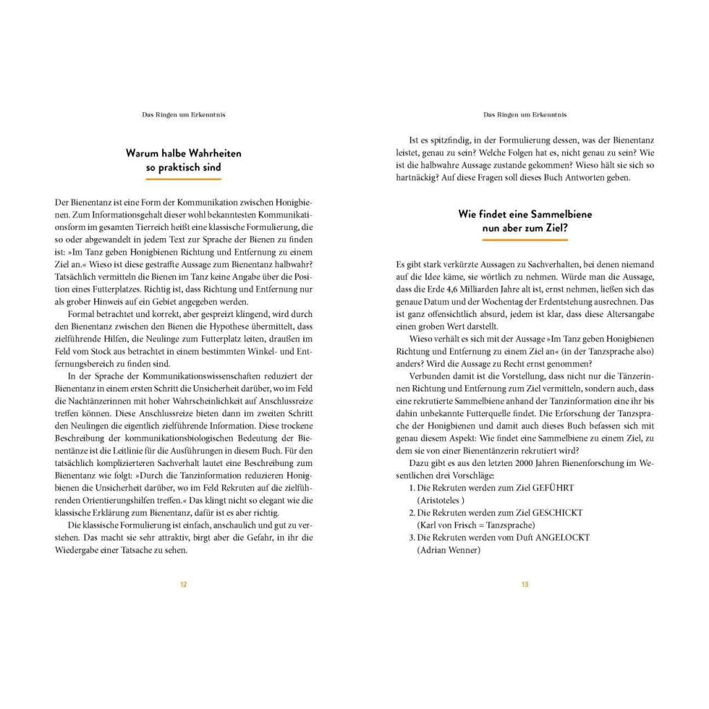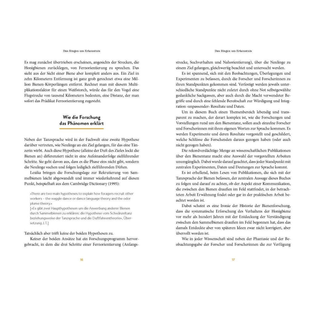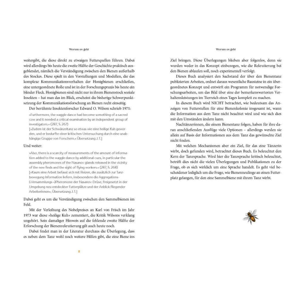 Spannende und überraschende Erkenntnisse zur Kommunikation von Bienen In der Geschichte der Bienenforschung haben Wissenschaftler tief in das Innenleben von Bienenstaaten geblickt und viel über das Verhalten der Tiere gelernt. Berühmt geworden ist vor allem ihr Schwänzeltanz. Doch neueste Erkenntnisse zeigen: Auch außerhalb des Stockes sind Bienen soziale Insekten, die miteinander kommunizieren. Für Laien und Profis unterhaltsam aufbereitet, beleuchtet Deutschlands renommiertester Bienenforscher Jürgen Tautz in diesem Buch mit frischem Blick nicht nur die faszinierende Tanzsprache, sondern befasst sich auch mit weiteren spannenden Phänomenen im Informationsaustausch zwischen Bienen. Vom Autor des Bestsellers Honigbienen - Geheimnisvolle Waldbewohner Die Sprache der Bienen stellt erstmals die Verständigung unter Bienen vollständig zusammen. Hat sich die Kommunikationsbiologie in der Bienenforschung bisher stark auf die Verständigung innerhalb des Bienenstocks konzentriert, richtet dieses Buch das Augenmerk ebenso darauf, wie Bienen außerhalb des Stocks kommunizieren. So erfährt der Leser auch, über welche Schritte Bienenneulinge an einen Futterplatz gelangen, für den eine Sammelbiene mit ihrem Tanz wirbt. Das Buch analysiert den Stand der über den Bienentanz veröffentlichten Arbeiten der letzten 100 Jahre und ordnet deren wesentliche Bausteine in ein übergeordnetes Konzept. Darüber hinaus erklärt ein historischer Abriss der Forschungsgeschichte zur "Bienensprache", warum sich einige widersprüchliche und unvollständige Hypothesen bis heute halten konnten. Ein frischer Blickwinkel auf eine der bemerkenswertesten Verhaltensleistungen im Tierreich Die Betrachtung aus einem neuen Blickwinkel führt zu bisher unbekannten Einsichten. Zugleich wird durch diese neue Perspektive deutlich, wie groß unsere Wissenslücken zur Sprache der Bienen noch immer sind und welche Forschungsarbeiten angestoßen werden müssen, um das Bild über eine der bemerkenswertesten Verhaltensleistungen im Tierreich eines Tages komplett zu machen.