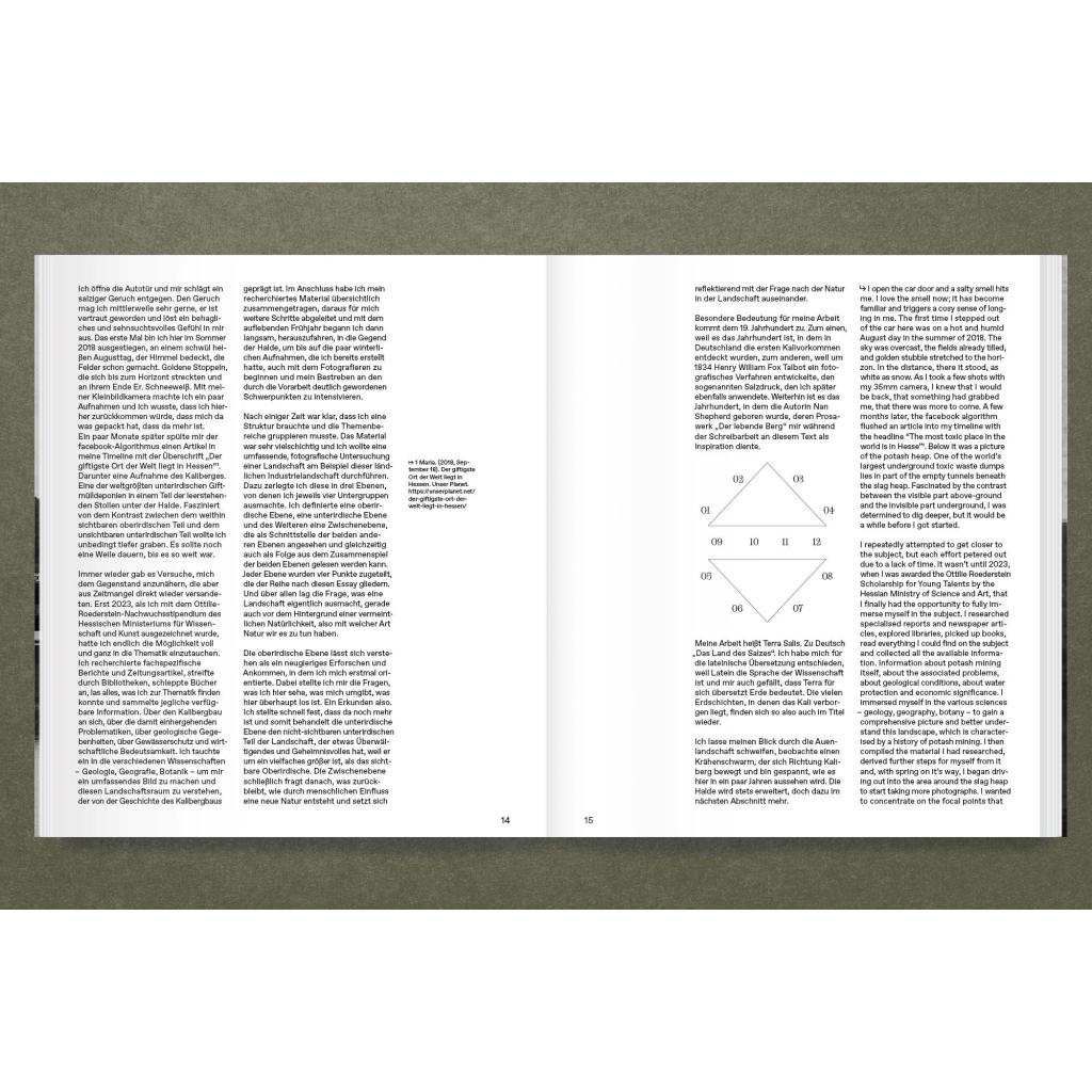 "Terra Salis" ist eine fotografische Auseinandersetzung mit dem komplexen Themenfeld des Kali-Bergbaus im osthessischen Heringen an der Werra. Der Fokus liegt nicht nur auf der äußeren Dimension des größten Salzberges in Deutschland, sondern auch auf den transformatorischen Prozessen der umliegenden Landschaft und den Auswirkungen der industriellen Nutzung auf natürliche Lebensräume. Dabei werden zentrale Fragen zur Konstruktion von Landschaft und Natur sowie zur Legitimität menschlicher Eingriffe in diese Räume aufgeworfen. Das abgebaute Kali findet vorwiegend als Düngemittel in der Landwirtschaft Verwendung, während das verbleibende Salz das visuelle und kulturelle Erscheinungsbild einer ganzen Region prägt. Teile des unterirdischen Stollensystems dienen als Deponie für giftige Abfälle aus aller Welt, wodurch Heringen an der Werra als einer der giftigsten Orte weltweit gilt. Zudem hat die Einleitung von Kaliabwässern zur Entstehung eines künstlichen Binnensalz-Standorts geführt, der eine charakteristische Flora von Salzpflanzen hervorgebracht hat. Die Werra, einst ein ökologisch vielfältiger Fluss, ist heute infolge dieser Aktivitäten der salzigste Fluss Europas. Gleichzeitig spielt die Kali-Industrie eine zentrale Rolle als bedeutender Wirtschaftsfaktor und Hauptarbeitgeber der Region. Die Arbeit gliedert sich in zwölf Werkgruppen, die in drei Ebenen (eine oberirdische, eine unterirdische und eine verbindende Zwischenebene) strukturiert sind und verschiedene Aspekte des Themas beleuchten. Unterschiedliche fotografische Techniken und Materialien kommen zum Einsatz, um ein vielschichtiges Verständnis dieser komplexen Thematik zu ermöglichen.
