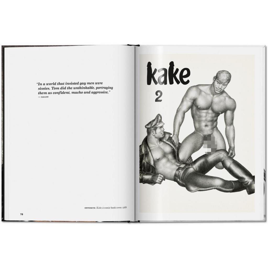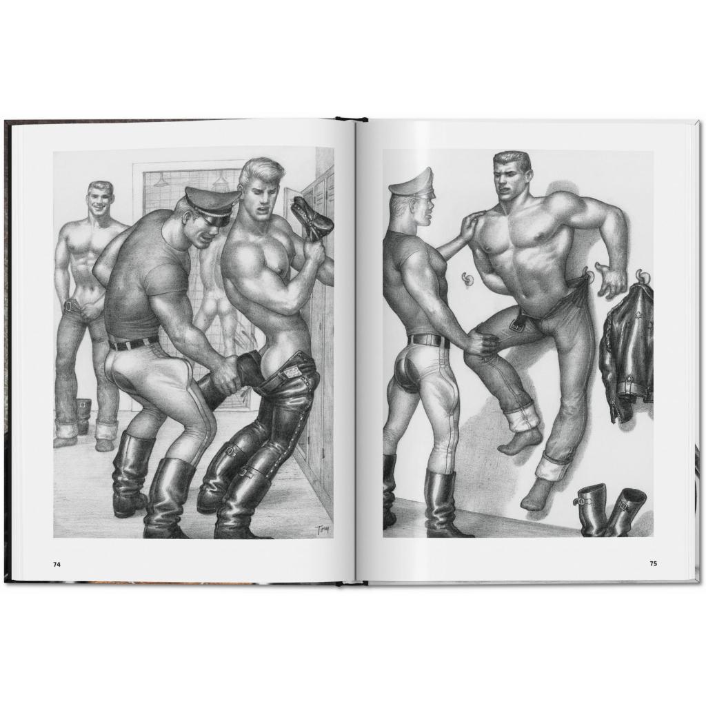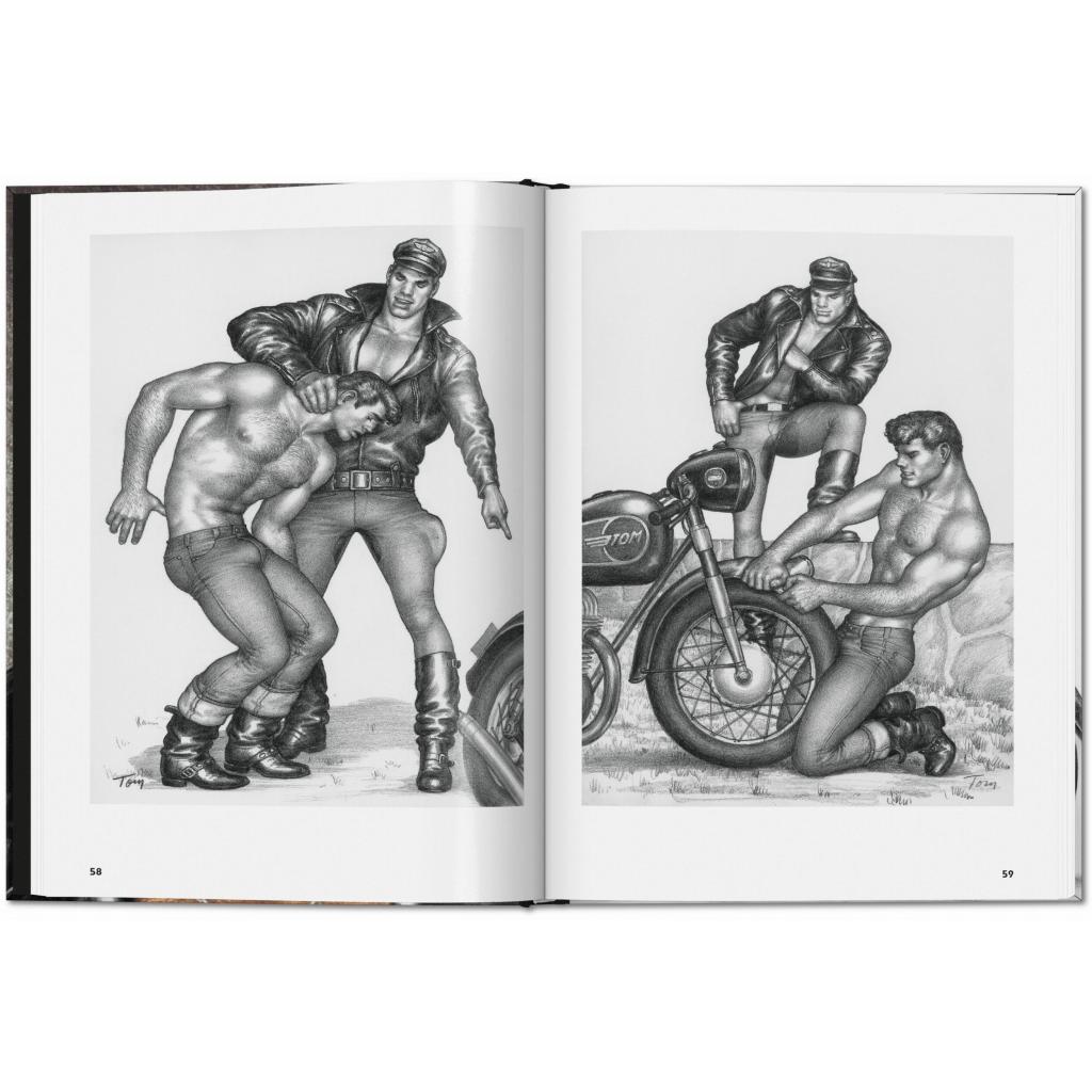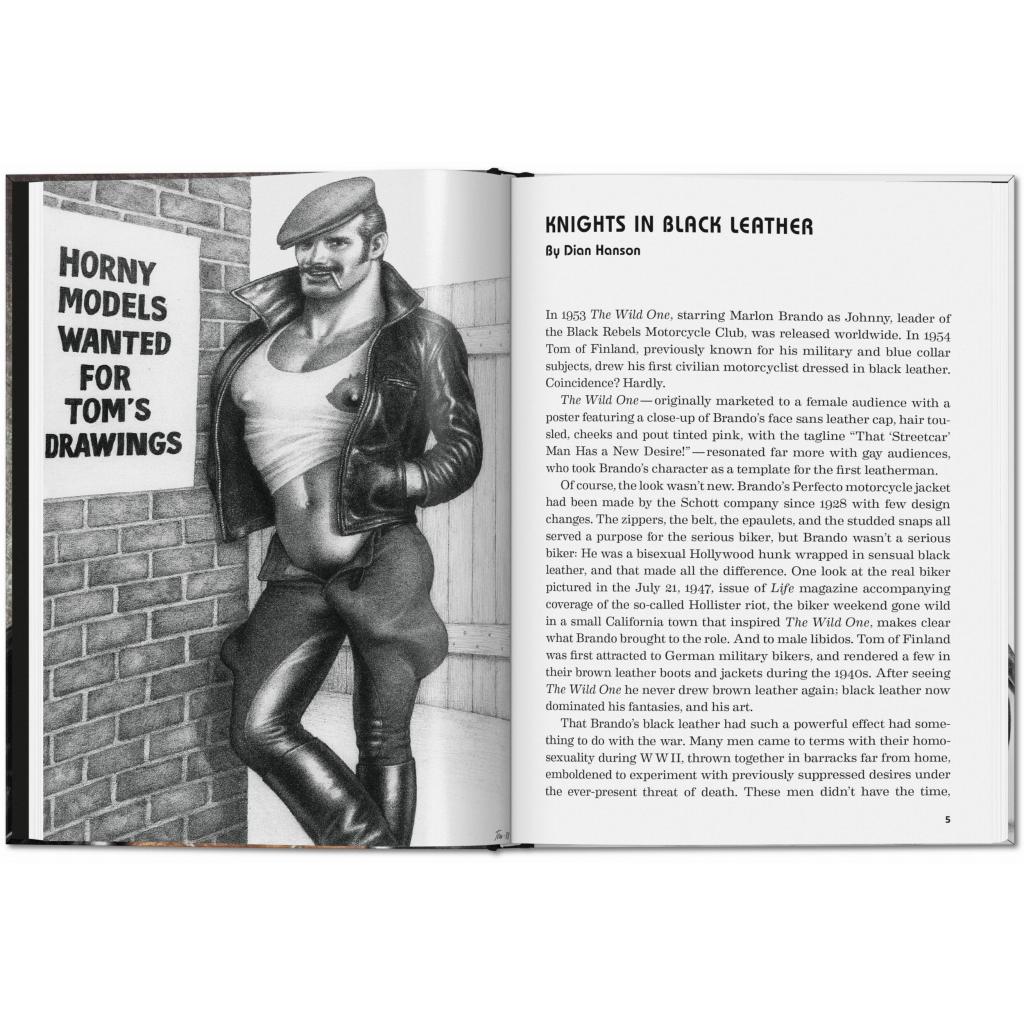 Marlon Brando warf sich 1953 in eine schwarzlederne Perfecto-Biker-Jacke, hautenge Jeans und Chopper-Stiefel, setzte sich eine Fliegermütze auf und spielte in Der Wilde Johnny, den höhnischen Anführer des Black Rebel Motorcycle Club. Im Jahr darauf verzichtete Tom of Finland in seinen Kunstwerken auf braunes Leder und schuf sich seine eigenen Wilden: muskulöse, hypermaskuline Rebellen , nun in schwarzes Leder gepresst und natürlich mit ordentlich PS zwischen den Beinen. Diesen Look übernahm noch im gleichen Jahr der Satyrs Motorcycle Club, der erste Club schwuler Biker - und ließ auf diese Weise Toms Fantasiewelt Wirklichkeit werden. Tom wäre natürlich nicht Tom gewesen, hätte er seinen neuen Schwulen-Ikonen keine eigene Note verliehen, indem er ihnen lederne Reithosen, kniehohe Stiefel und dazu Ledermützen verpasste und jedem Motorrad den Markennamen "Tom" auf den Tank schrieb. Toms Biker erschienen im Winter 1968 erstmals als zwei "Motorradburschen" in Physique Pictorial . Ein weiterer schaffte es auf die Titelseite der April-Ausgabe von 1960. Von da an beherrschten Biker den Inhalt von PP , sowohl in Würdigung seiner amerikanischen Leserschaft als auch infolge seiner eigenen wachsenden Besessenheit. Als er nach einer durchgängigen Figur suchte, seinem persönlichen Alter ego, erfand er 1968 Kake, den Inbegriff des Bikers in Lederkluft , und erzählte dessen wilde Geschichten in jeweils 26 Einzelbildern. Tom kleidete sich schließlich selbst wie Kake und trat bis zu seinem Lebensende in schwarzer Lederjacke, weißem T-Shirt, Jeans und hohen Stiefeln auf. The Little Book of Tom: Bikers enthält Toms früheste Werke für Physique Pictorial , Kake im Biker-Outfit und knisternd heiße Bikerbilder auf kompakten 192 Seiten - voll von harten Kerlen , die sich mit anderen harten Typen in schwarzem Leder verlustieren. Und zwar, ja, auf Motorrädern.