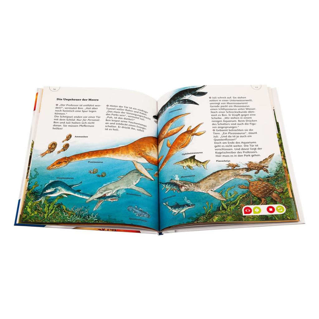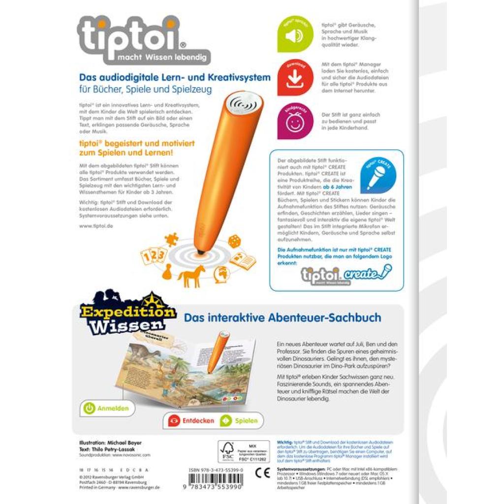 Komm mit in den Dinopark! Juli, Ben und Professor Pfeffernuss reisen nach Nordamerika. Hier soll ein neuer Dinopark eröffnet werden. Eine frische Dinosaurierspur deutet darauf hin, dass eine Dinoart überlebt haben könnte. Bei ihrer abenteuerlichen Suche durch den Park kommen die Kinder nach und nach mit Hilfe der Hinweise des tiptoi-Stiftes hinter das Geheimnis der Dinospur. Eingebettet in eine spannende Geschichte erfahren junge Leser Wissenswertes über die Welt der Dinosaurier. tiptoi-Stift nicht enthalten. Muss separat erworben werden.