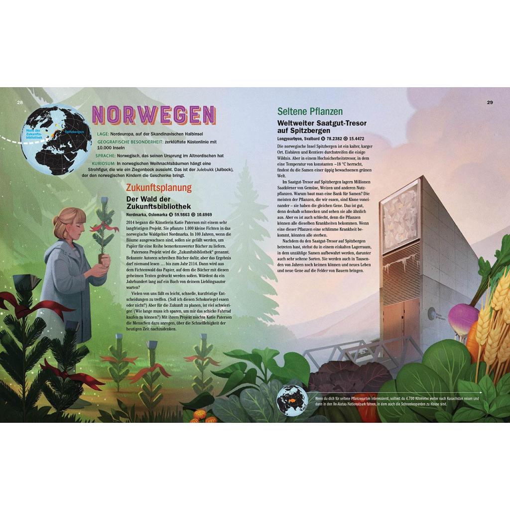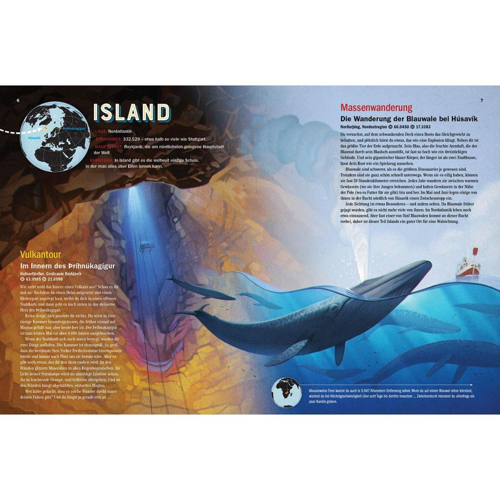 Das Buch ist bei deiner Buchhandlung vor Ort und bei vielen Online-Buchshops erhältlich!+ Bücher, die Kinder gerne lesen wollen + Beliebtes Thema: Unsere Erde + Spannende Sachbücher + Durchgehend detailreich farbig illustriert + Leicht verständliche Texte + Großformatiges Hardcover + Komm mit auf eine außergewöhnliche Expedition: Dieser Atlas zeigt dir die 100 geheimnisvollsten Orte der Welt! Erkunde das "Tor zur Hölle" in Turkmenistan, den Quallensee in Mikronesien und die immerwährenden Gewitter in einer Bucht in Venezuela! Folge Millionen Jahre alten Dino-Spuren in Bolivien und lerne japanische Mönche kennen, die sich selbst mumifizieren. Lausche singenden Sanddünen in der Wüste Gobi und staune über riesige, von Menschen gemachte Zeichnungen in der Nazca-Wüste. Die sind so groß, dass man sie nur von einem Flugzeug aus überschauen kann. Worauf wartest du noch? Pack deine Sachen und begib dich auf den größten Abenteuertrip deines Lebens! Dieses spannende, reich illustrierte Sachbuch für Kinder ab 8 Jahren ist ein spannender Reiseführer zu den außergewöhnlichsten Orten der Welt. Mit Witz und Gespür für echte "Wow"-Momente erzählen Dylan Thuras und Rosemary Mosco von 100 faszinierenden Reisezielen in 47 Ländern. Das Buch enthält neben spektakulären Tatsachen auch geografische Koordinaten sowie eine Liste zur Reiseausrüstung für eigene Erkundungstouren und weitere Tipps für junge Abenteurer.