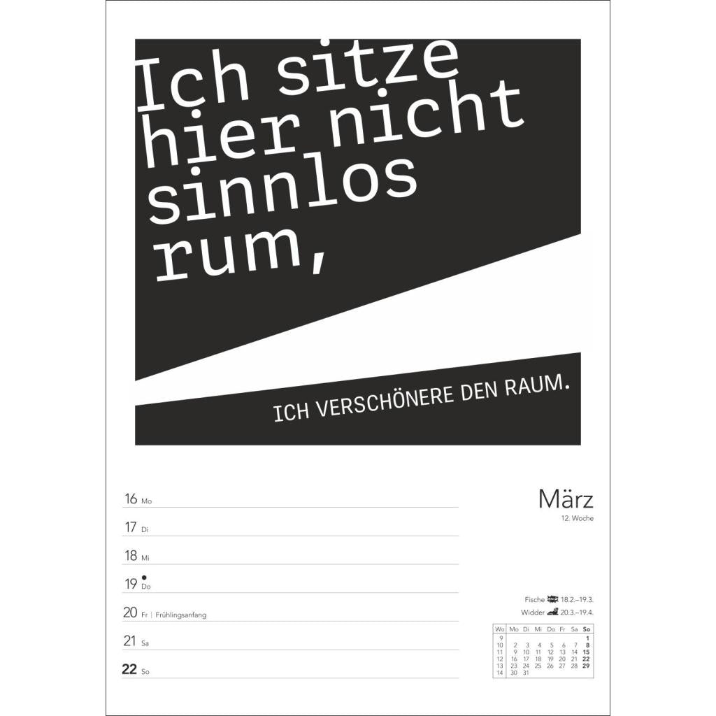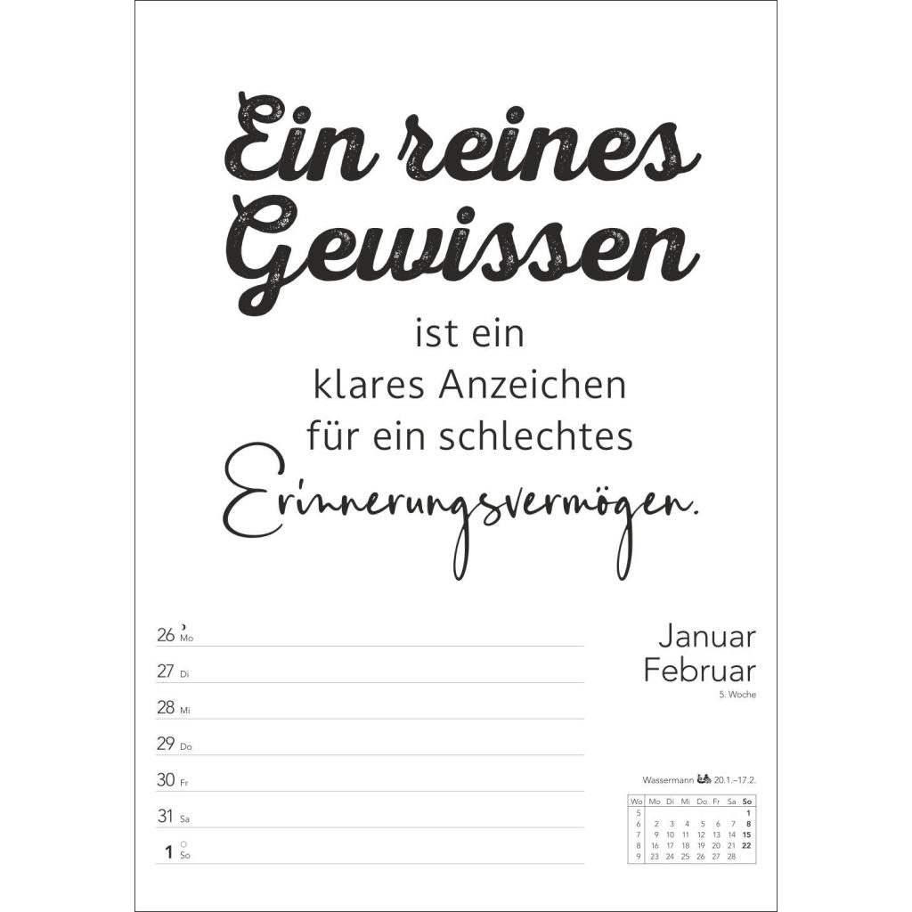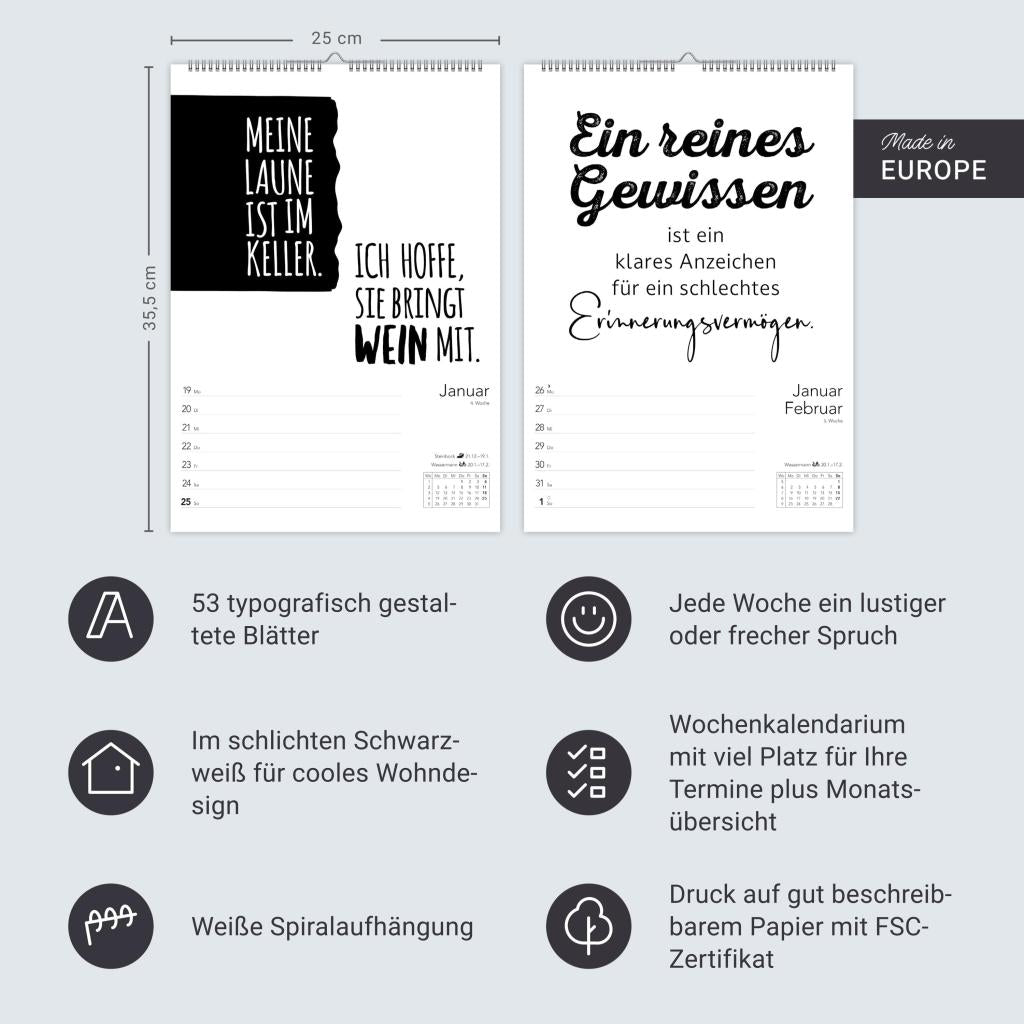 Praktischer Terminkalender zum Aufhängen mit coolen Sprüchen. Wochenkalender 2026 in schwarz-weiß gestaltet