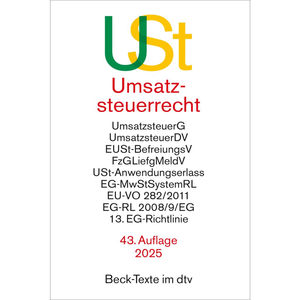 Umsatzsteuergesetz mit Umsatzsteuer-Durchführungsverordnung, Einfuhrumsatzsteuer-Befreiungsverordnung, Fahrzeuglieferungs-Meldepflichtverordnung, Umsatzsteuer-Anwendungserlass, Mehrwertsteuer-Systemrichtlinie, EU-Verordnung 282/2011, EG-Richtlinie2008/9/EG, 13. EG-Richtlinie. Textausgabe mit ausführlichem Sachregister. Rechtsstand: 15. Januar 2025 (Die Angaben zum Stand der Sammlung beziehen sich auf das Verkündungsdatum der maßgeblichen Veröffentlichungsblätter)