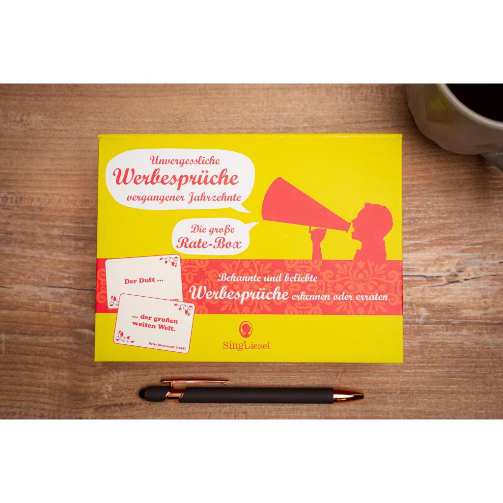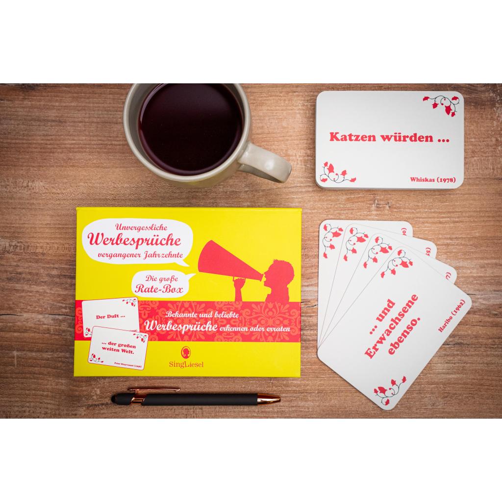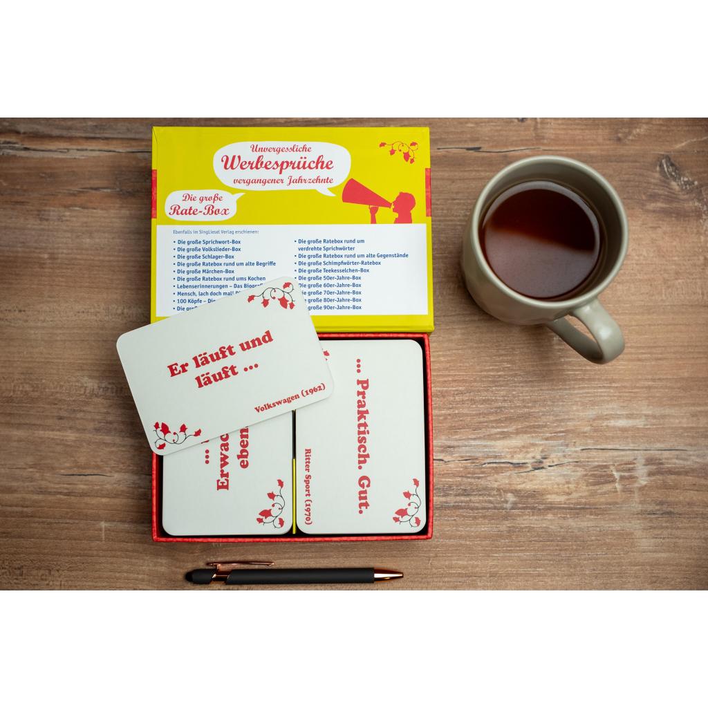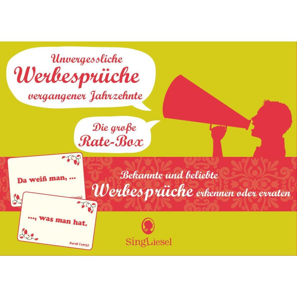 Die große Rate-Box "Unvergessliche Werbesprüche vergangener Jahrzehnte" enthält 100 Karten mit bekannten Werbesprüchen. Diese Sammlung unvergesslicher Werbesprüche ist ein unterhaltsames und bewährtes Gedächtnis- und Ratespiel. Die Spielidee ist einfach und bereitet deshalb immer wieder großen Spaß: Auf der Vorderseite der Karten ist nur der Anfang eines Werbespruchs zu sehen. Der zweite Teil des Werbespruchs kann aus dem Gedächtnis ergänzt oder erraten werden. Diese Spielidee macht natürlich auch umgekehrt Spaß. Beginnen Sie einfach mit dem Ende des Werbespruchs und erraten Sie den Anfang. Zu jedem Werbespruch erfahren Sie zudem das Ursprungsjahr, das manchmal überraschen wird. Die liebevolle nostalgische Gestaltung der Karten und das XXL-Format fördern die Freude an diesem vergnüglichen Ratespiel.
