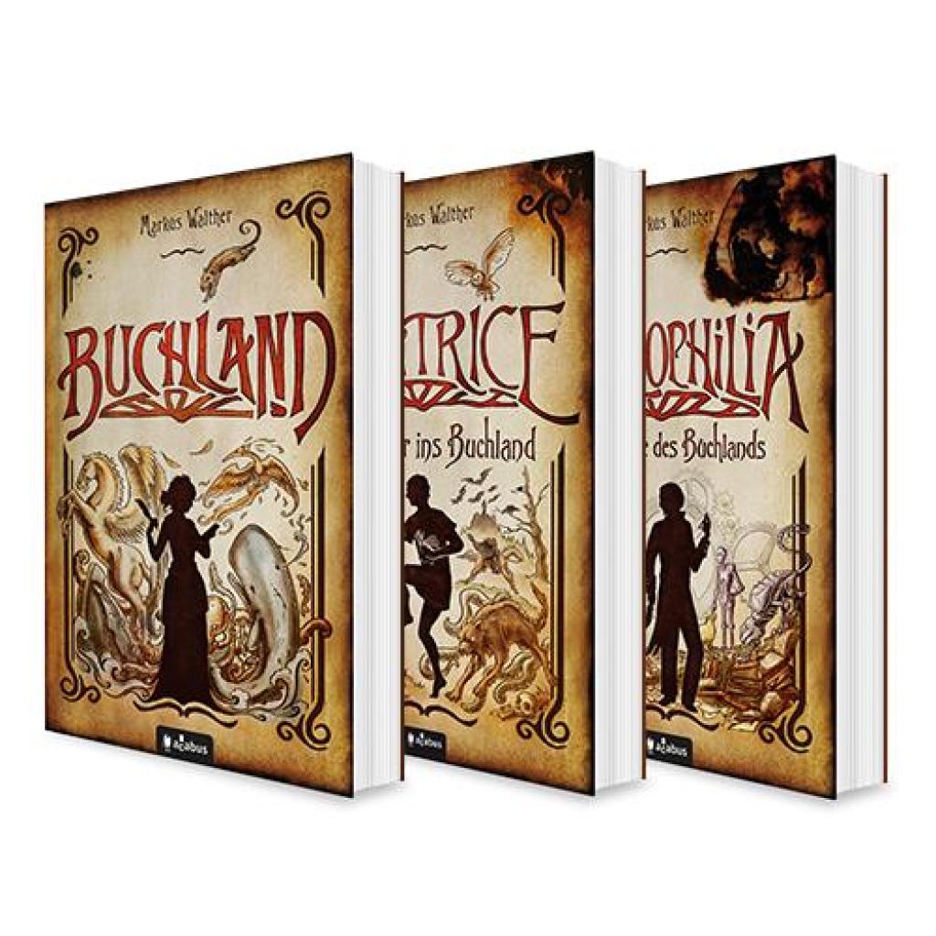 Markus Walthers Trilogie rund um Beatrice und ihre Abenteuer im "Buchland" - jetzt erstmals als Bundle erhältlich! Dieses Antiquariat ist nicht wie andere Buchläden! Das muss auch die gescheiterte Buchhändlerin Beatrice feststellen, als sie notgedrungen die Stelle im staubigen Antiquariat des ebenso verstaubt wirkenden Herrn Plana annimmt. Schnell merkt sie allerdings, dass dort so manches nicht mit rechten Dingen zugeht. Doch noch ehe Beatrice all diese Geheimnisse lüften kann, gerät ihr Mann Ingo in große Gefahr und Beatrice setzt alles daran, ihn zu retten. Zusammen mit Herrn Plana begibt sie sich auf eine abenteuerliche Reise quer durch das mysteriöse Buchland. Dort treffen sie nicht nur blinde Buchbinder, griechische Göttinnen und die ein oder andere Leseratte, auch der Tod höchstpersönlich kreuzt ihren Weg. Im zweiten Teil "Beatrice - Rückkehr ins Buchland" muss Beatrice in die tiefsten Regionen des Buchlands zurückkehren, als der kuriose Ladenbesitzer Quirinius ihr ein Angebot macht, das sie einfach nicht ablehnen kann ... Im dritten und letzten Band der Trilogie "Bibliophilia - Am Ende des Buchlands" will Beatrice neue Wege beschreiten und widmet sich ganz dem Familienleben. Doch die Vergangenheit holt sie wieder ein, als ein geheimnisvoller Uhrmacher namens Nemo in die Nachbarschaft zieht. Gemeinsam mit ihm und der Homunkula Chaya muss sie sich ein letztes Mal in der unendlichen Bibliothek behaupten, auf einer Reise zwischen Realität und Phantasie.