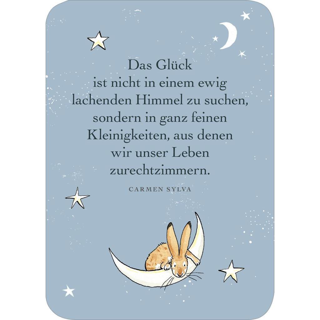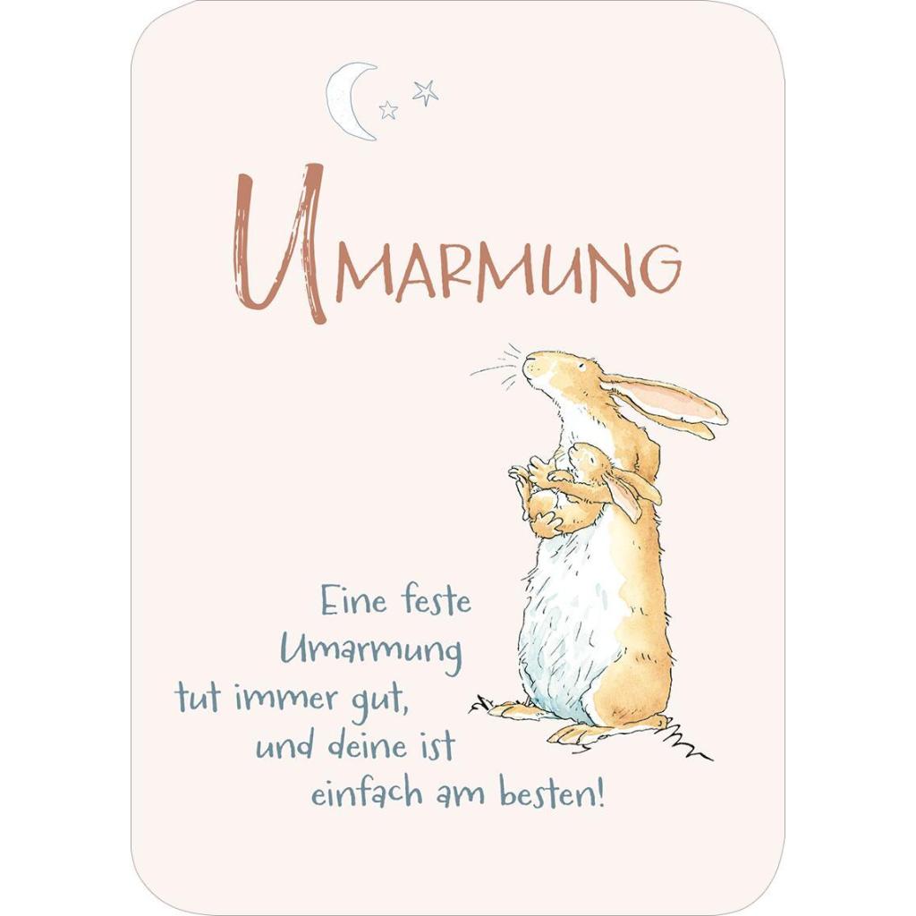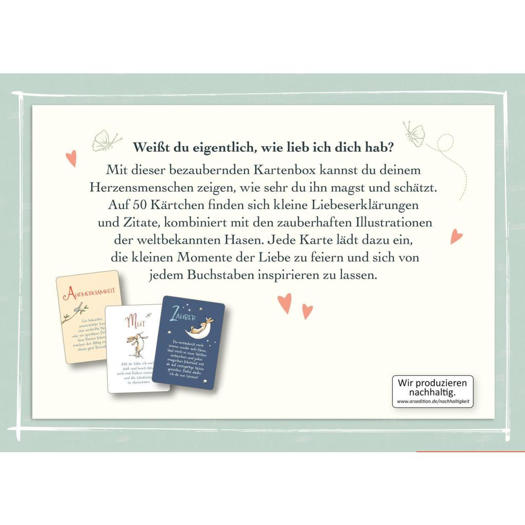 Weißt du eigentlich, wie lieb ich dich hab? Das ABC der Liebe auf 50 Karten Mit dieser bezaubernden Kartenbox kannst du deinen Herzensmenschen zeigen, wie sehr du sie magst und schätzt. Auf 50 Kärtchen finden sich kleine Liebeserklärungen, Zitate und Anregungen von A wie "Aufmerksamkeit" bis Z wie "Zuneigung", um die Liebe immer wieder neu zu genießen und zu feiern. Die weltbekannten Hasen aus dem Klassiker von Sam McBratney und Anita Jeram bieten dabei den perfekten Rahmen. Die Kärtchen können an Lieblingsmenschen verschenkt werden und sind auch im Regal ein toller Blickfang. Als kleine Aufmerksamkeit für einen bestimmten Anlass oder einfach so, um sich immer wieder neu von der Liebe inspirieren zu lassen. Wertiges Geschenk: 50 Karten, Größe 10,5 x 14,7 cm, gut beschreibbar, in hochwertiger Aufbewahrungsbox mit Bändchen zum Aufziehen Bezaubernde Illustrationen: Die weltbekannten Hasen lassen jedes Herz höherschlagen Ein Hoch auf die Liebe: Ein herzerwärmendes Geschenk für den Partner, die Partnerin, die beste Freundin oder für sich selbst Perfektes Geschenk: Von A bis Z bringen liebevolle Texte mehr Inspiration in den Alltag Kleine Liebeserklärung Egal ob zum Valentinstag, Geburtstag, Jahrestag oder einfach nur so - die Kartenbox ist eine wunderschöne Möglichkeit, die Liebe, das Leben und den Lieblingsmenschen zu feiern!