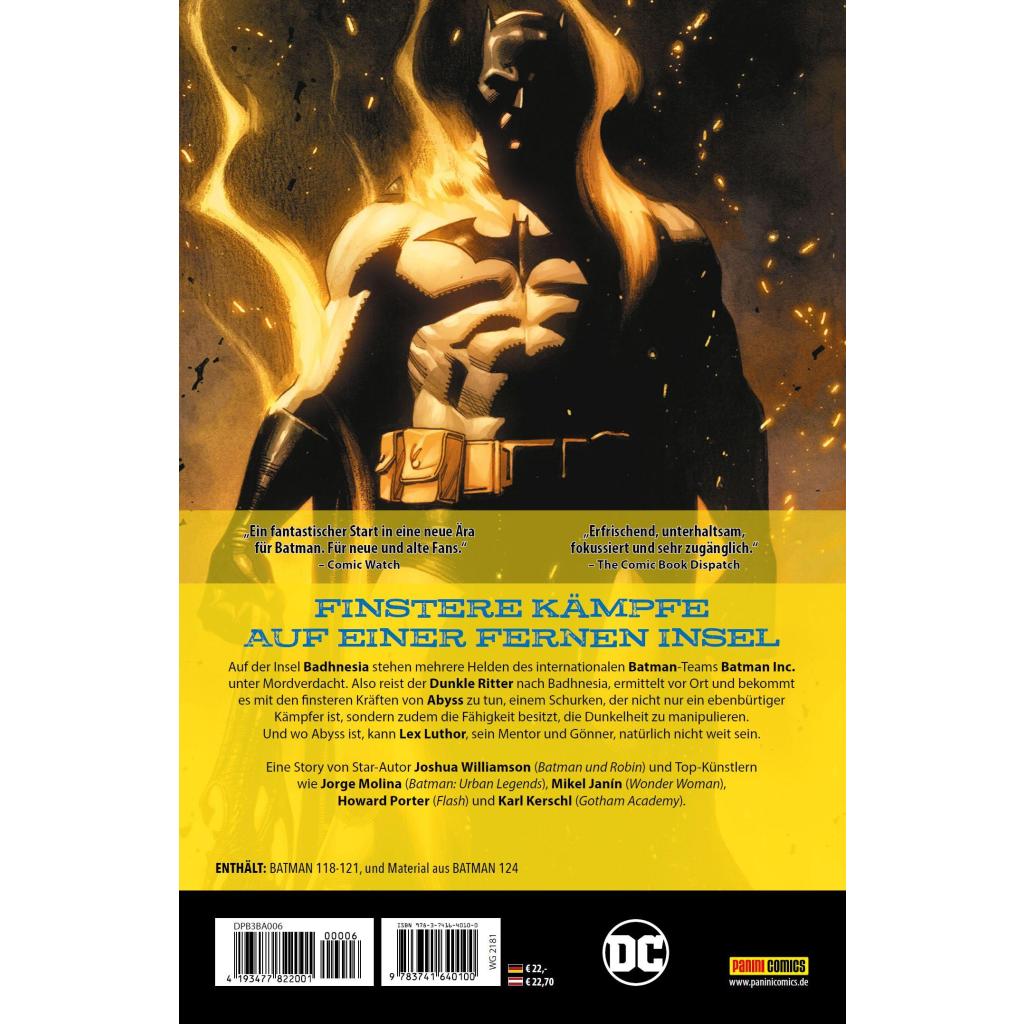 FINSTERE KÄMPFE AUF EINER FERNEN INSEL Auf der Insel Badhnesia stehen mehrere Helden des internationalen Batman-Teams Batman Inc. unter Mordverdacht. Also reist der Dunkle Ritter nach Badhnesia, ermittelt vor Ort und bekommt es mit den finsteren Kräften von Abyss zu tun, einem Schurken, der nicht nur ein ebenbürtiger Kämpfer ist, sondern zudem die Fähigkeit besitzt, die Dunkelheit zu manipulieren. Und wo Abyss ist, kann Lex Luthor, sein Mentor und Gönner, natürlich nicht weit sein. Eine Story von Star-Autor Joshua Williamson (Batman und Robin) und Top-Künstlern wie Jorge Molina (Batman: Urban Legends), Mikel Janín (Wonder Woman), Howard Porter (Flash) und Karl Kerschl (Gotham Academy). ENTHÄLT: BATMAN 118-121, und Material aus BATMAN 124