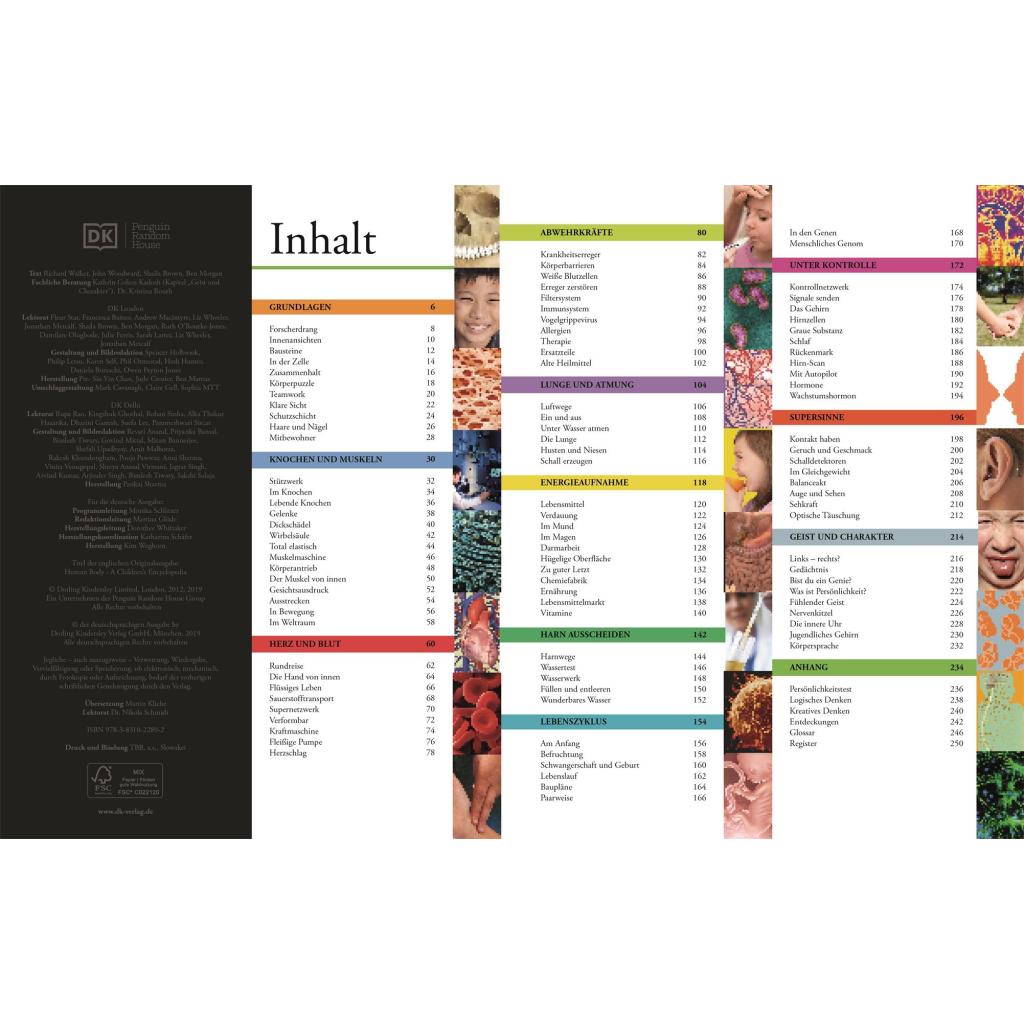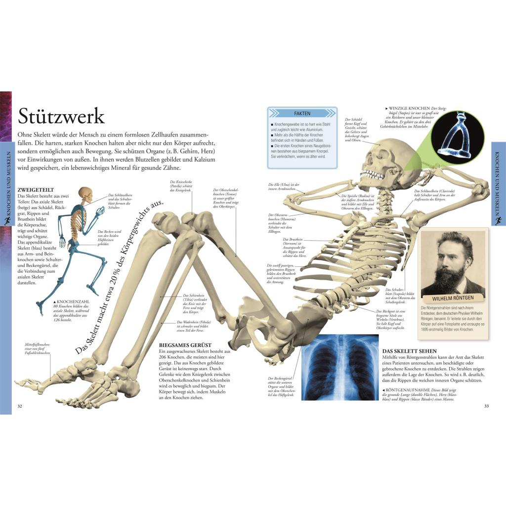 Expedition in den Körper: Der menschliche Körper für clevere Kids nimmt Kinder mit auf eine spannende Entdeckungsreise. Von Kopf bis Fuß erkundet dieses Buch Anatomie und Funktionsweise des Körpers. Aufregende Detailfotos und 3D-Grafiken ermöglichen dabei ungewöhnliche Einblicke und garantieren eine kurzweilige Wissensvermittlung. So macht das Thema Spaß! Eine Einführung erklärt Grundlagen des menschlichen Körpers. Die zehn folgenden Kapitel gehen ausführlich auf die Körpersysteme ein. Hier erfahren Kinder alles über Knochen, Muskeln, Blutbahnen und die Organe. Wie arbeitet die Lunge? Woraus besteht unser Blut? Wie gelangt das Essen vom Mund in den Magen? Wie denken wir? Keine dieser spannenden Fragen bleibt offen! Im Anhang regen ein Persönlichkeitstest und einige Rätsel zur intensiveren Beschäftigung mit dem Gelernten an. Eine Chronik der medizinischen Entdeckungen und ein Glossar mit wichtigen Begriffen fassen die wichtigsten Informationen noch einmal zusammen. Durch die unterschiedliche farbliche Kennzeichnung der Kapitel ist ein schnelles Nachschlagen möglich. Spektakuläre und zum Teil großformatige Fotos zeigen viele anatomische Details und machen das Buch visuell ansprechend. Alle Informationen sind altersgerecht aufbereitet und selbst schwierige Sachverhalte werden auf leicht verständliche Weise erklärt. Zahlreiche Infokästen vertiefen das Wissen noch zusätzlich. Faszinierende Zahlen und Fakten lockern die Texte zwischendurch auf. Eine perfekte Ergänzung zum Biologieunterricht und ideal für Referate!