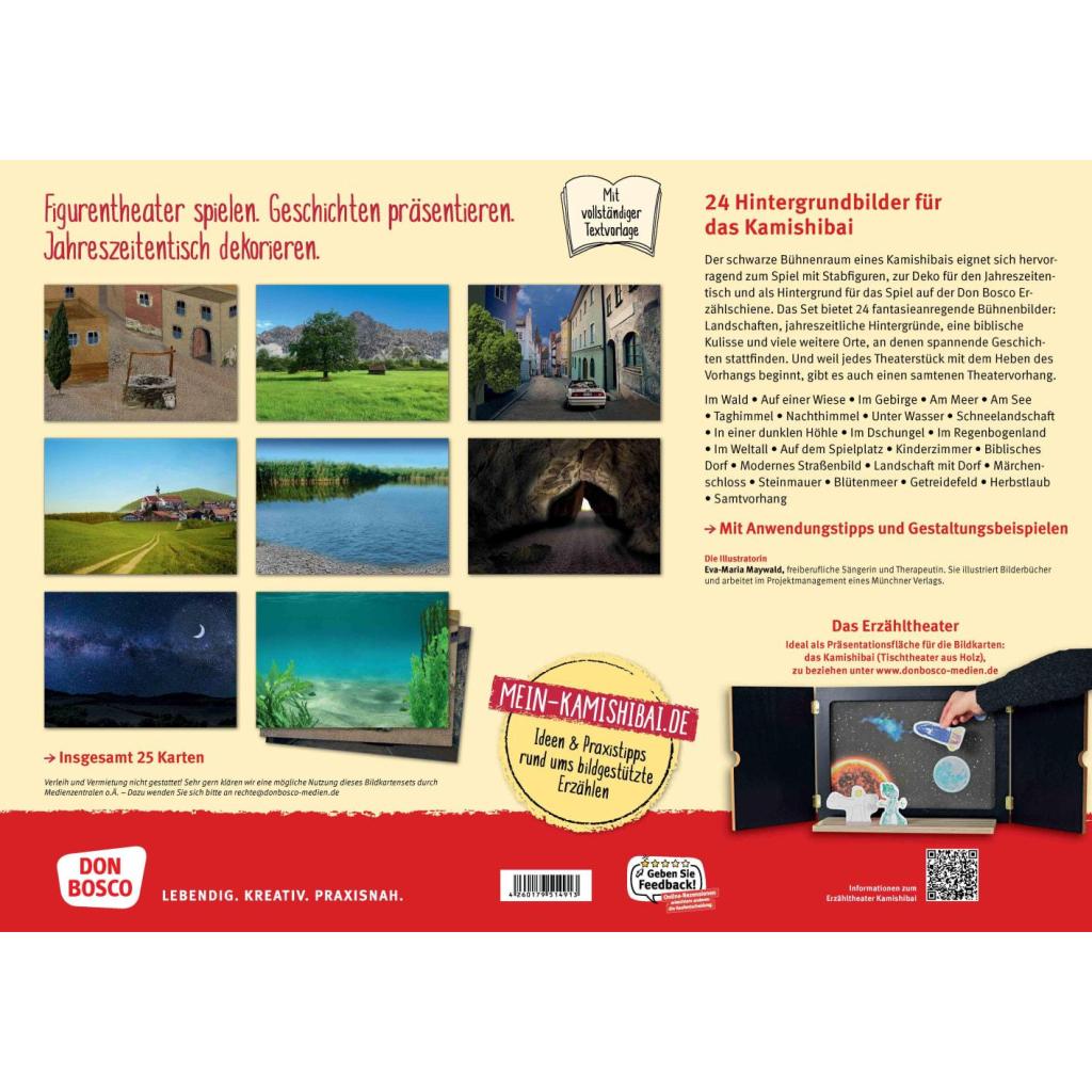 | Keyword: | Arbeitsmaterial; Erzähltheater; Präsentation; Dekoration; Bühnenbild; Landschaft; Kulisse; Papiertheater; Erzählschiene |