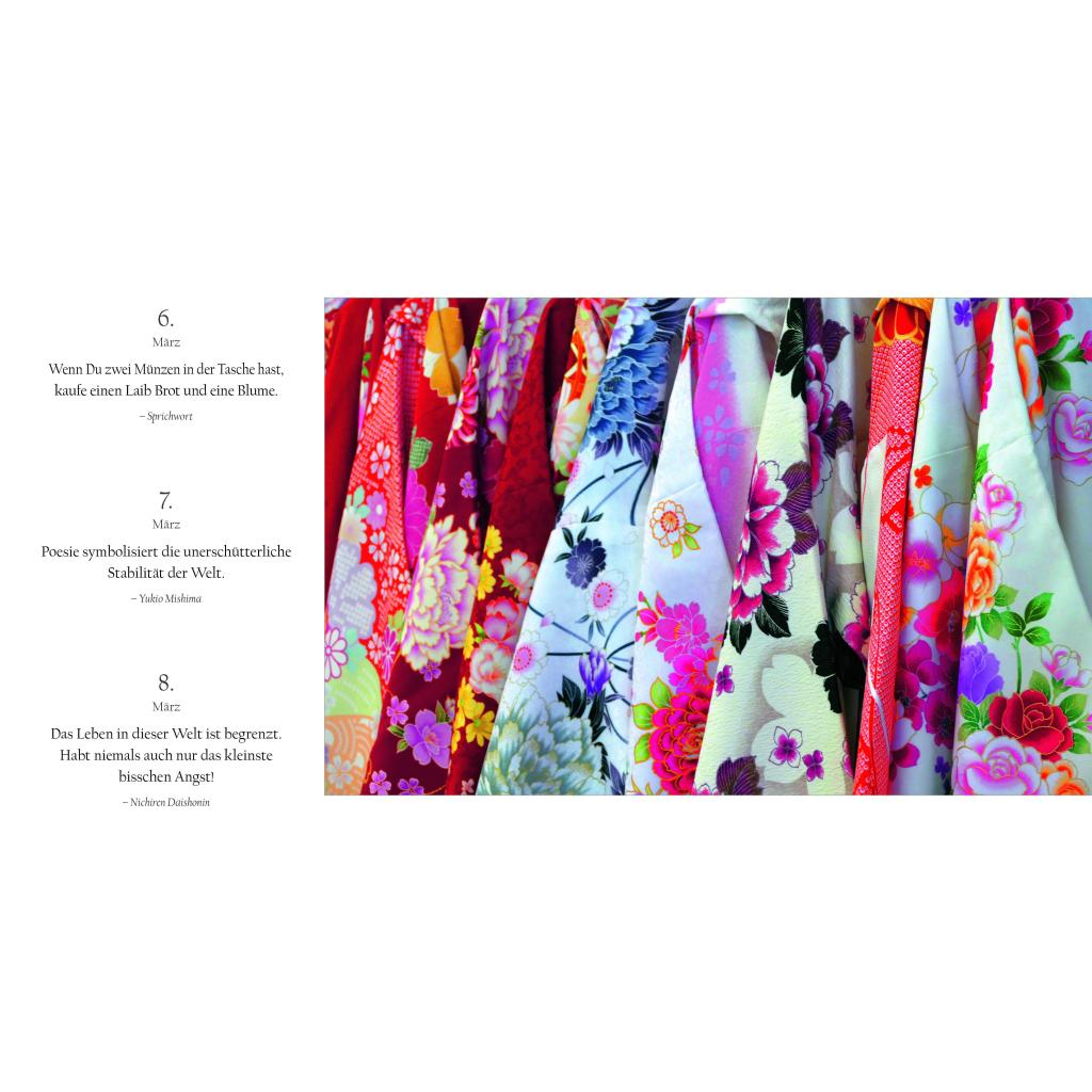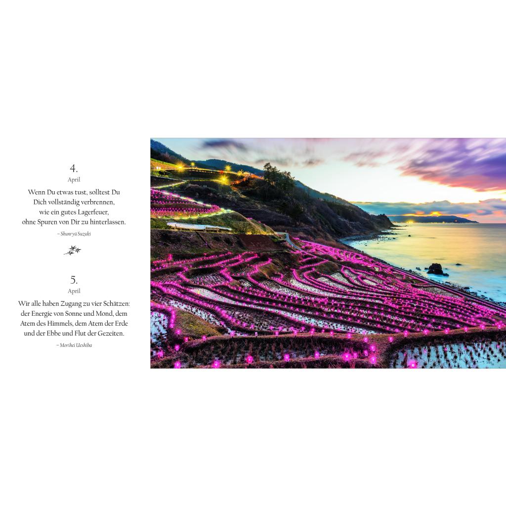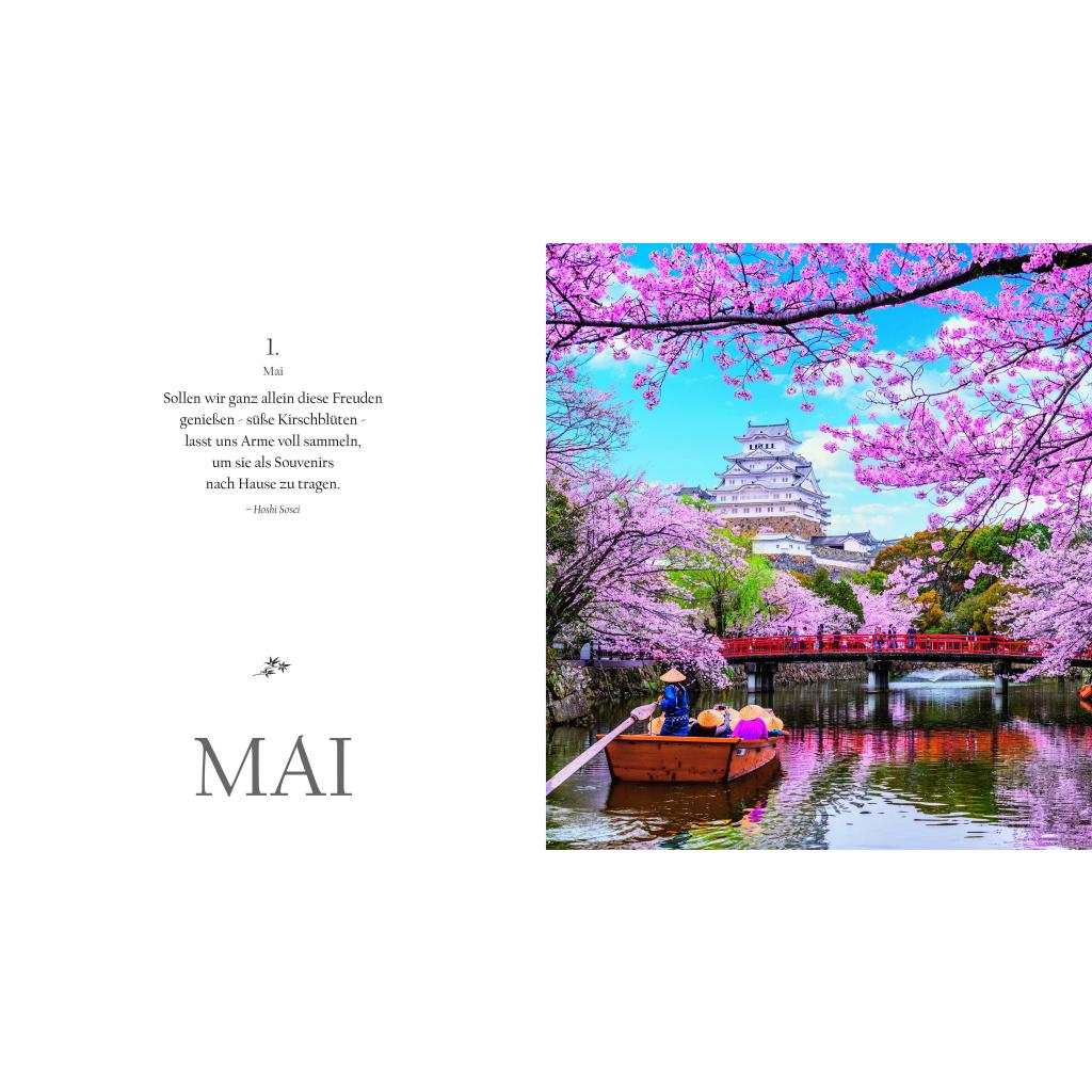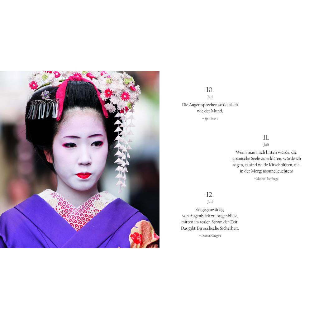 Sakura, die Zeit der zartrosa Zierkirschblüte. Festlich geschmückte Tempel. Kinder in Schuluniformen. Daibatsu, der große Buddha: In ganz besonderen Bildwelten erleben Sie in diesem Buchkalender den Geist und die elegante Ästhetik Japans. Von Januar bis Dezember begleiten Sie dazu die Gedanken und Maximen berühmter Vertreter der japanischen Kultur und Literatur. Ihre Sentenzen - Perlen der Weisheit und inneren Harmonie - vereinen Tradition und Moderne. In Neuanfang, Schönheit und Vergänglichkeit werfen Sie einen Blick in die japanische Seele. Dieser außergewöhnliche Sehnsuchtskalender im jahreszeitlichen Wandel der Natur beflügelt Sie jeden Tag.