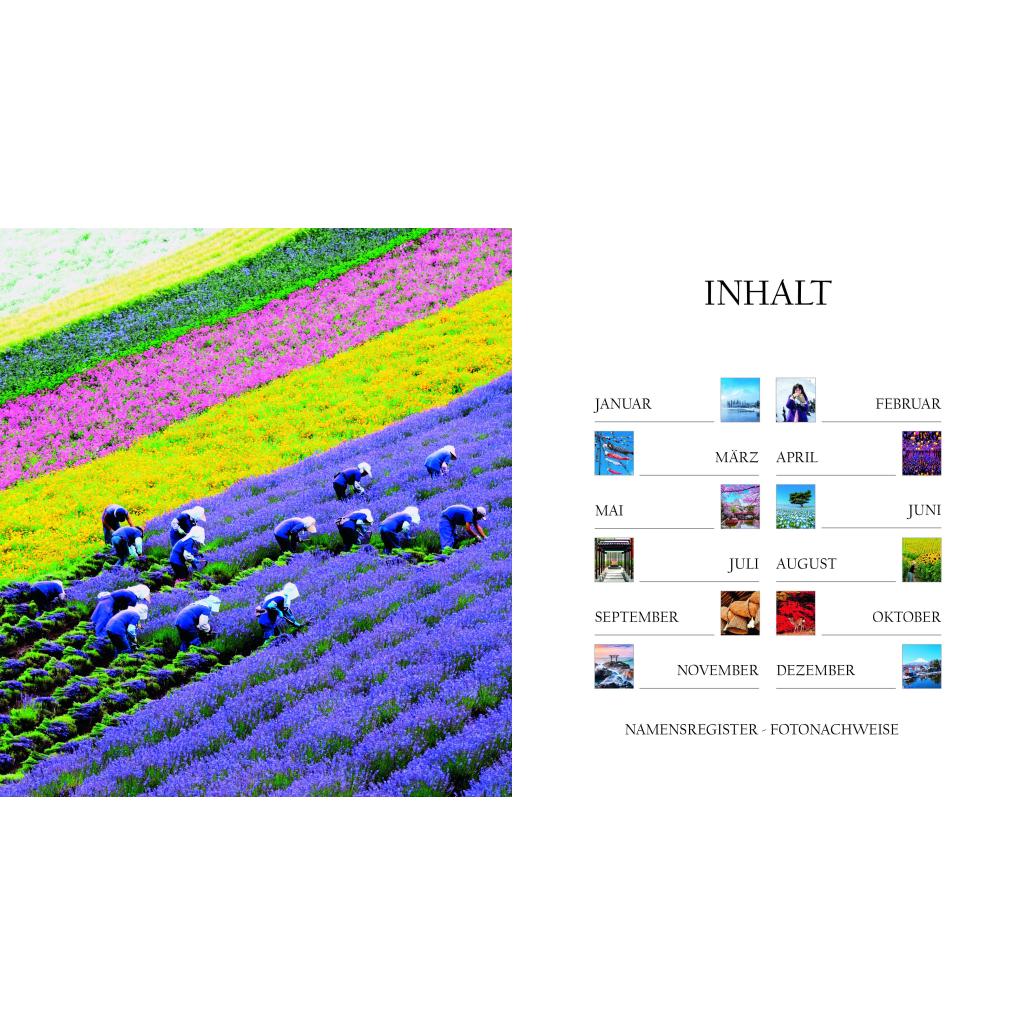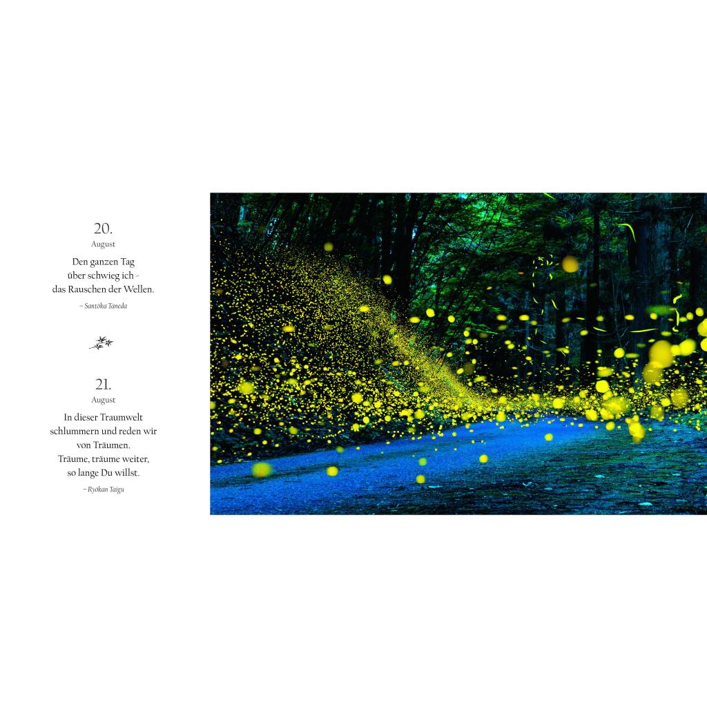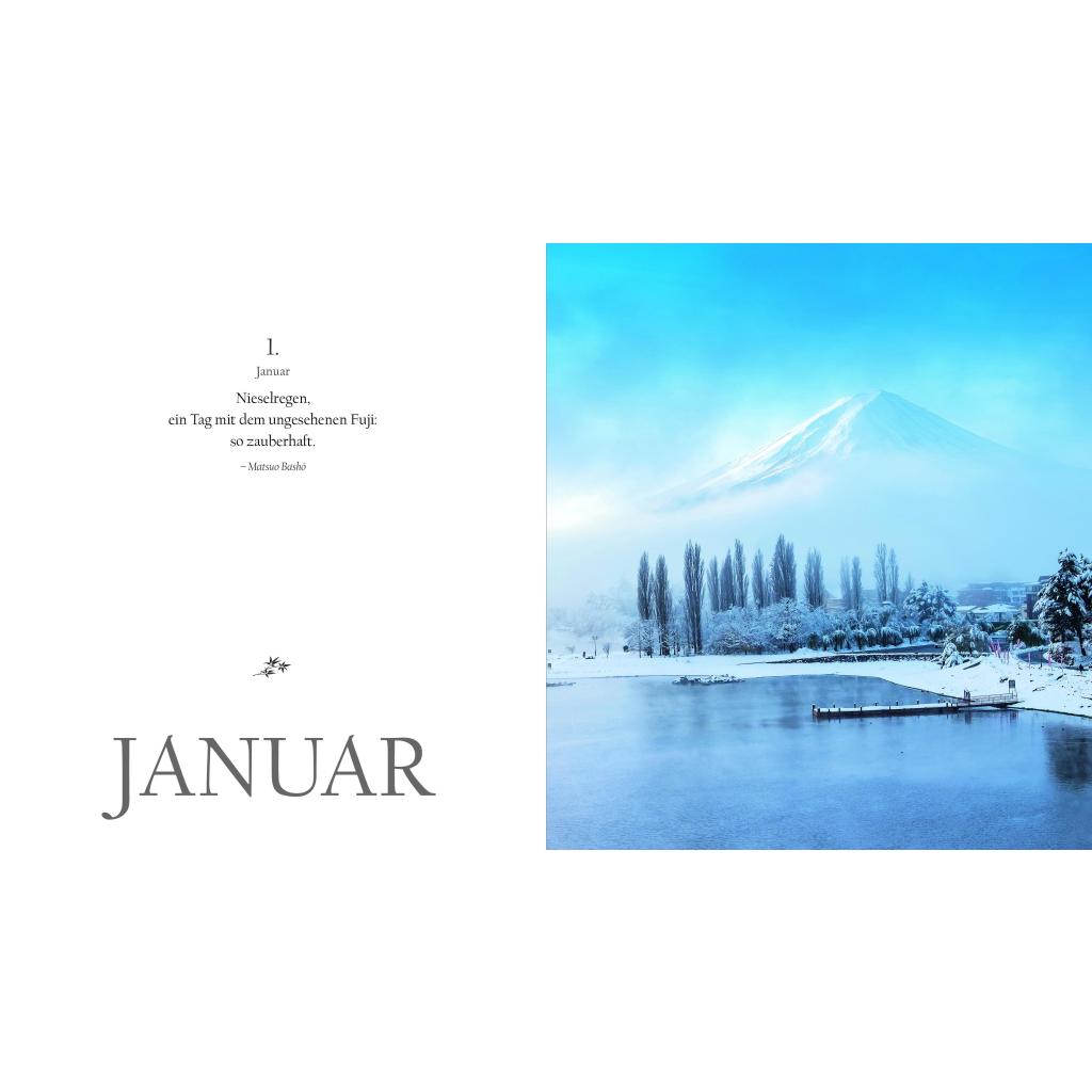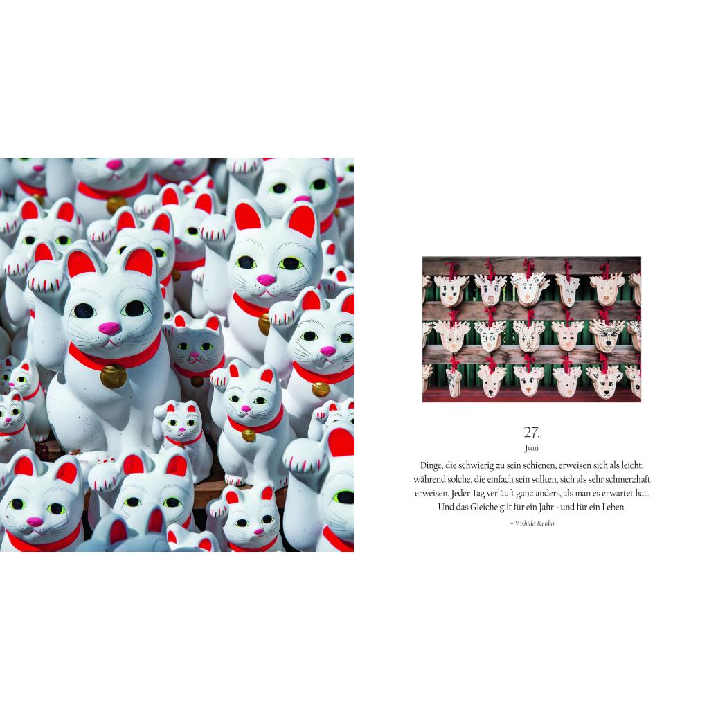 Sakura, die Zeit der zartrosa Zierkirschblüte. Festlich geschmückte Tempel. Kinder in Schuluniformen. Daibatsu, der große Buddha: In ganz besonderen Bildwelten erleben Sie in diesem Buchkalender den Geist und die elegante Ästhetik Japans. Von Januar bis Dezember begleiten Sie dazu die Gedanken und Maximen berühmter Vertreter der japanischen Kultur und Literatur. Ihre Sentenzen - Perlen der Weisheit und inneren Harmonie - vereinen Tradition und Moderne. In Neuanfang, Schönheit und Vergänglichkeit werfen Sie einen Blick in die japanische Seele. Dieser außergewöhnliche Sehnsuchtskalender im jahreszeitlichen Wandel der Natur beflügelt Sie jeden Tag.
