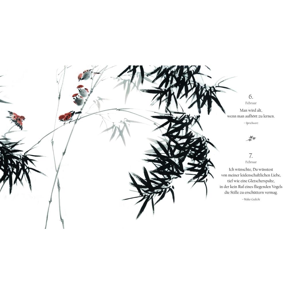 | Keyword: | Tageskalender; Jahreskalender; Fotokalender; Inspirierender Kalender; Japanische Weisheit; fernöstliche Weisheit; Lebensphilosophie; Achtsamkeit; Teekultur; Kirschblüte; Lebensweisheiten; Merksprüche; Sinnsprüche; stimmungsvolle Fotografie; Zitate; Zen-Buddhismus; Naturimpressionen; Geschenkidee |
