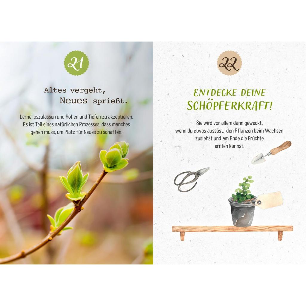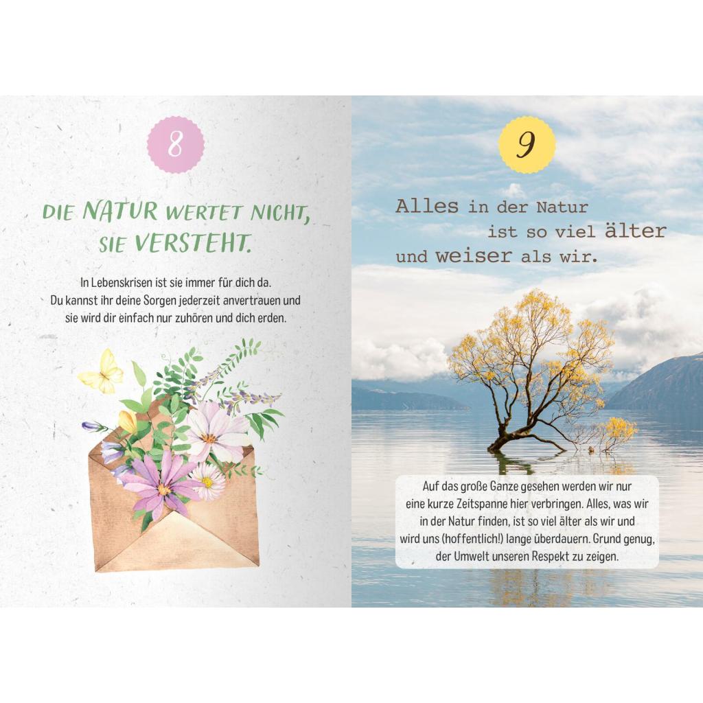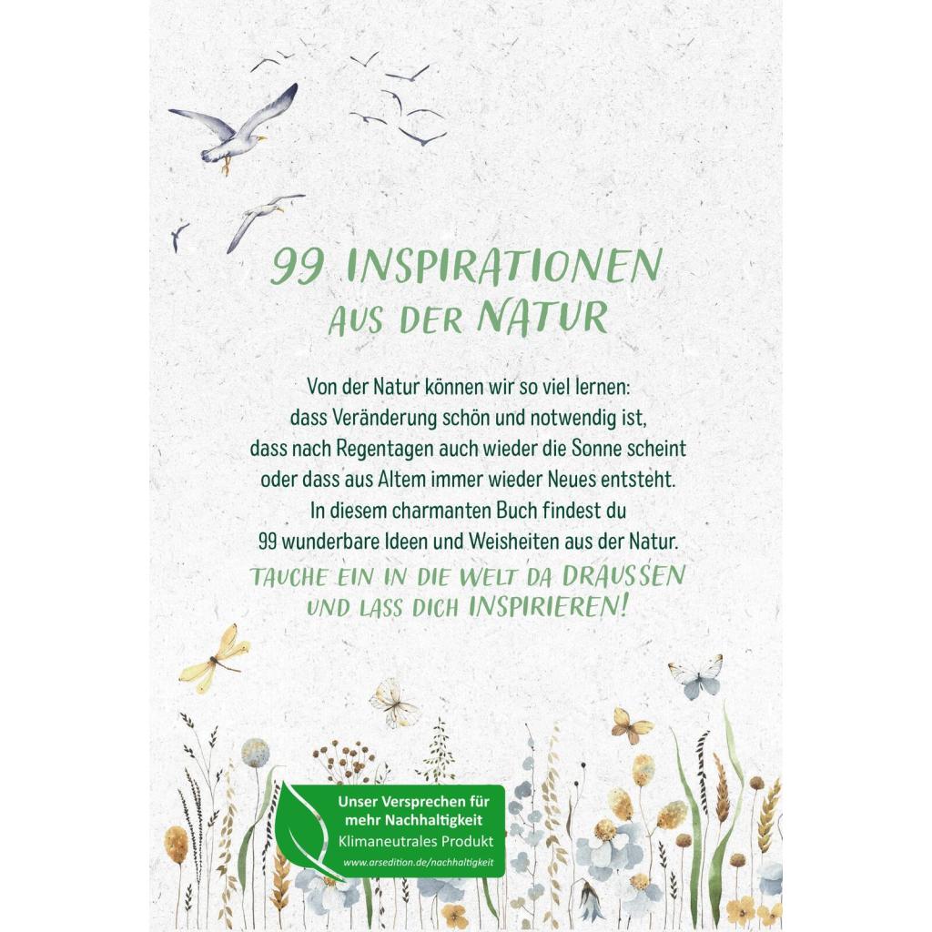 Achtsamkeit lernen aus der Natur Von der Natur können wir viel lernen: dass Veränderung schön und notwendig ist, dass nach Regentagen auch wieder die Sonne scheint und dass aus Altem immer wieder Neues entsteht. In diesem charmanten Buch findest du 99 wunderbare Inspirationen und Weisheiten aus der Natur. Auf jeder Seite wartet eine kleine Anregung für ein achtsames und geerdetes Leben auf dich, untermalt von wunderschönen Fotos und Illustrationen. Tauche ein in die Natur und lass dich inspirieren: Für mehr Nachhaltigkeit und mehr Wertschätzung der Umwelt gegenüber. Aus der beliebten 99-Dinge-Reihe: 96 Seiten voller Ideen und Inspirationen aus der Natur Praktisch: Der dekorative Ratgeber ist übersichtlich gestaltet und nummeriert Lieblingsmomente zum Mitnehmen: Das handliche und flexible Buch mit Softcover und Lesebändchen passt in jede Tasche und ist so immer mit dabei Hochwertig ausgestattet: Mit vielen stimmungsvollen Fotos und Natur-Illustrationen Tolle Anregungen, die nichts kosten: In dieser ganz besonderen Ideensammlung stehen nicht materielle Dinge im Vordergrund, sondern einzigartige Momente in der Natur Ein inspirierendes Geschenk: Für alle, die die Natur lieben, aus ihr lernen und ihr achtsam und aufmerksam begegnen möchten, aber auch eine schöne Aufmerksamkeit für dich selbst Entdecke deine Schöpferkraft! Dieses wunderbare Buch enthält 99 wunderbare Anregungen aus der Natur und begleitet dich liebevoll durch den Tag. Lass dich inspirieren und erden und und gönne einer lieben Person oder dir selbst ein paar achtsame Momente in der Natur.