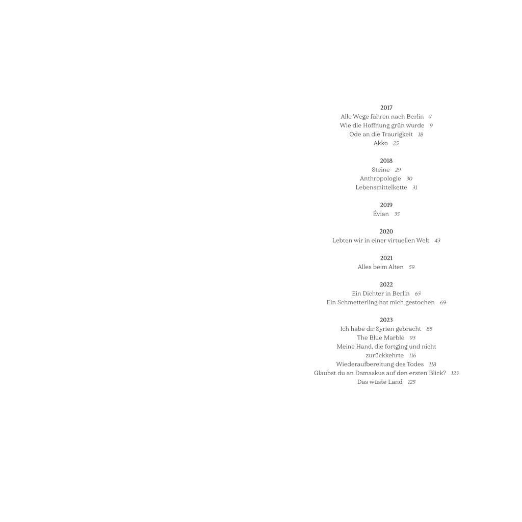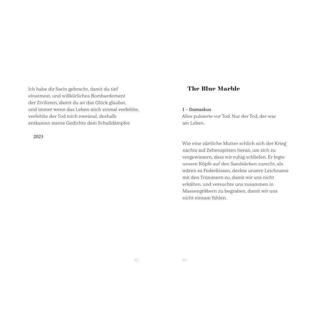 | Keyword: | Aktualität; Arche; Berlin; Gedicht; Hoffnung; Intensive Texte; Krieg; Liebe; Literatur; Lyrik; Naher Osten; Prosa; Schweden; Syrien; Trost; Weltempfänger Bestenliste; Wirklichkeit |