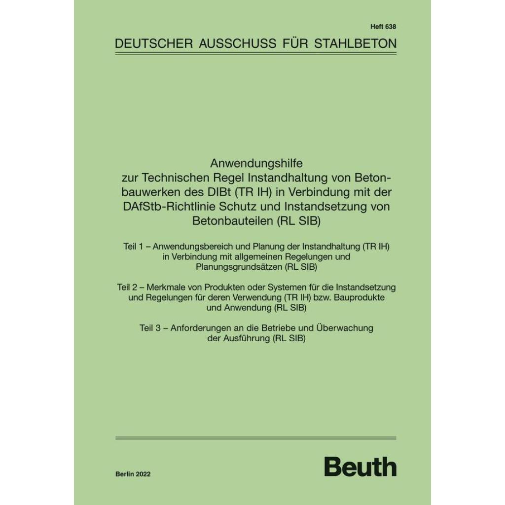 Die Anwendungshilfe vereint die gültigen Inhalte der Technischen Regel (DIBt) Instandhaltung von Betonbauwerken (TR IH), Stand Mai 2020, mit denen der DAfStb-Richtlinie - Schutz und Instandsetzung von Betonbauteilen (RL SIB), Stand Oktober 2001, inkl. der Berichtigungen 1, Januar 2002, und 3, September 2014, entsprechend der Muster-Verwaltungsvorschrift Technische Baubestimmungen (MVV TB) sowie den DIBt-Hinweisen zur Technischen Regel (DIBt) "Instandhaltung von Betonbauwerken (Mai 2020)". Diese Anwendungshilfe ermöglicht ein verlust- und widerspruchsfreies Lesen der aktuellen Regelwerke und erspart die Gegenüberstellung von acht einzelnen Dokumenten. Nicht mehr gültige Inhalte der RL SIB wurden ohne eine Ersatzanmerkung gestrichen. Gewisse Verweise zwischen den verschiedenen Teilen der Regelwerke untereinander wurden zum Zwecke der besseren Lesbarkeit rein redaktionell angepasst. Inhaltlich ist die Anwendungshilfe mit den eingeführten Technischen Regeln identisch. Als Ausgangsdokument für diese Anwendungshilfe wurde die TR IH des DIBt verwendet. In dieses wurden alle noch gültigen Inhalte der RL SIB eingefügt und grau hinterlegt. Teilweise wurden die Inhalte in bestehende Kapitel eingefügt, teilweise wurden - damit Verweise und Abschnittsnummern korrekt erhalten bleiben - neue Kapitel ("AH") erstellt. Die Anwendungshilfe umfasst drei Teile: Teil 1 - Anwendungsbereich und Planung der Instandhaltung (TR IH) in Verbindung mit allgemeinen Regelungen und Planungsgrundsätzen (RL SIB) Teil 2 - Merkmale von Produkten oder Systemen für die Instandsetzung und Regelungen für deren Verwendung (TR IH) bzw. Bauprodukte und Anwendung (RL SIB) Teil 3 - Anforderungen an die Betriebe und Überwachung der Ausführung (RL SIB) Die Anwendungshilfe wurde durch die Mitarbeiterinnen und Mitarbeiter des Technisches Ausschusses "Schutz und Instandsetzung von Betonbauteilen" geprüft. Dabei wurde festgestellt, dass der Inhalt richtig und vollständig wiedergegeben ist. Der Vorstand des DAfStb hat die Anwendungshilfe daraufhin zur Veröffentlichung freigegeben.