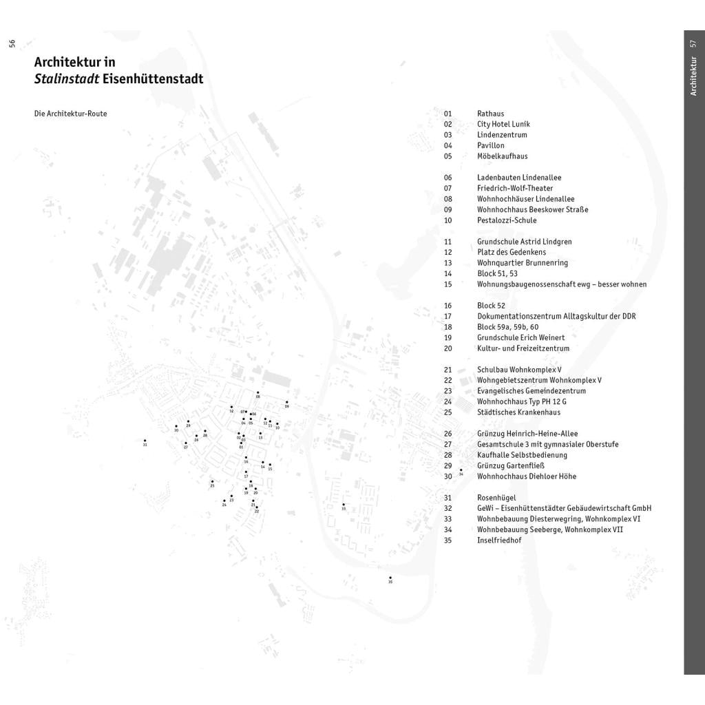 Eisenhüttenstadt - bis 1961 Stalinstadt - ist die erste gänzlich durchgeplante Stadtneugründung in Deutschland nach 1945. Ab 1950 wurde sie auf Beschluss der SED als 'sozialistische Wohnstadt' in Verbindung mit einem Stahlwerk westlich der Oder in unmittelbarer Nähe zur polnischen Grenze errichtet. In Eisenhüttenstadt wird die Geschichte von Architektur und Städtebau der DDR nachvollziehbar, ohne dass die Stadt zu einem nostalgischen Freilichtmuseum geworden ist. Von ihrer 70-jährigen Geschichte zeugen aber nicht nur die Gebäude, Straßen und Plätze, sondern auch viele Kunstwerke. Denn von Beginn an sind Architektur und Kunst in Eisenhüttenstadt eine Synthese eingegangen, die ihresgleichen sucht. Für diesen Architektur- und Kunstführer hat der Architekt und Fotograf Martin Maleschka 35 herausragende Bauten sowie 35 Kunstwerke dokumentiert - als Würdigung der einzigartigen Stadtanlage Eisenhüttenstadts sowie als ein Plädoyer für einen aufgeschlossenen Umgang mit dem bewahrenswerten baukulturellen und künstlerischen Erbe der DDR.