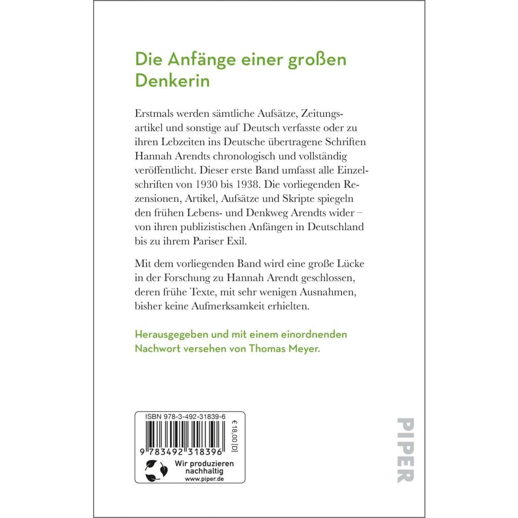 Die Anfänge einer großen Denkerin Erstmals werden sämtliche Aufsätze, Zeitungsartikel und sonstige auf Deutsch verfasste oder zu ihren Lebzeiten ins Deutsche übertragene Schriften Hannah Arendts chronologisch und vollständig veröffentlicht. Dieser erste Band umfasst alle Einzelschriften von 1930 bis 1938. Die vorliegenden Rezensionen, Artikel, Aufsätze und Skripte spiegeln den frühen Lebens- und Denkweg Arendts wider - von ihren publizistischen Anfängen in Deutschland bis zu ihrem Pariser Exil. Mit dem vorliegenden Band wird eine große Lücke in der Forschung zu Hannah Arendt geschlossen, deren frühe Texte, mit sehr wenigen Ausnahmen, bisher keine Aufmerksamkeit erhielten. Herausgegeben und mit einem einordnenden Nachwort versehen von Thomas Meyer.