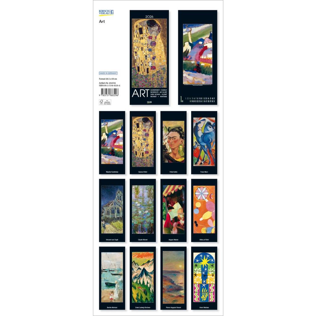 Der Kalender "Art" nimmt Sie mit auf eine Reise von den stimmungsvollen Darstellungen der Im-pressionisten Ende des 19. Jahrhunderts bis hin zum Beginn der abstrakten Malerei Anfang des 20. Jahrhunderts. Sorgfältig gewählte Ausschnitte lenken den Blick auf ausgesuchte Details der schöns-ten und bekanntesten Meisterwerke aus Impressionismus und Klassischer Moderne. Werke unter anderem von Monet, Renoir, Kandinsky und Klee bieten einen repräsentativen Querschnitt durch die Epochen. Kunstkalender groß im Hochformat Hervorragende Druckqualität bis ins Detail Neutrales Kalendarium für alle Länder FSC zertifiziertes Papier aus verantwortungsvollen Quellen Schickes passepartout Design für einen wertigen Anblick Ihres Wandkalenders Korsch Wandkalender Entdecke die vielseitigen Einsatzmöglichkeiten für unseren Kalender, sei es im Büro, in der Küche, im Wohn- oder Schlafzimmer. Dieser Wandkalender ist nicht nur ein optisches Highlight, sondern auch ein praktischer Begleiter durch das Jahr. Er begeistert mit wechselnden, einzigartigen Motiven für jede Jahreszeit. Korsch Kalender zeichnen sich durch eine herausragende Druckqualität, eine stabile Spiralbindung und hochwertiges Papier aus. Dies gewährleistet ein müheloses Umblättern der Seiten sowie eine stilvolle Dekoration deiner Räume. Wähle aus verschiedenen Formaten unserer Poster-Kalender aus, um das passende Deko-Element für deine Wand zu finden!