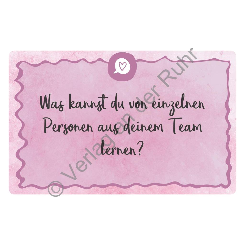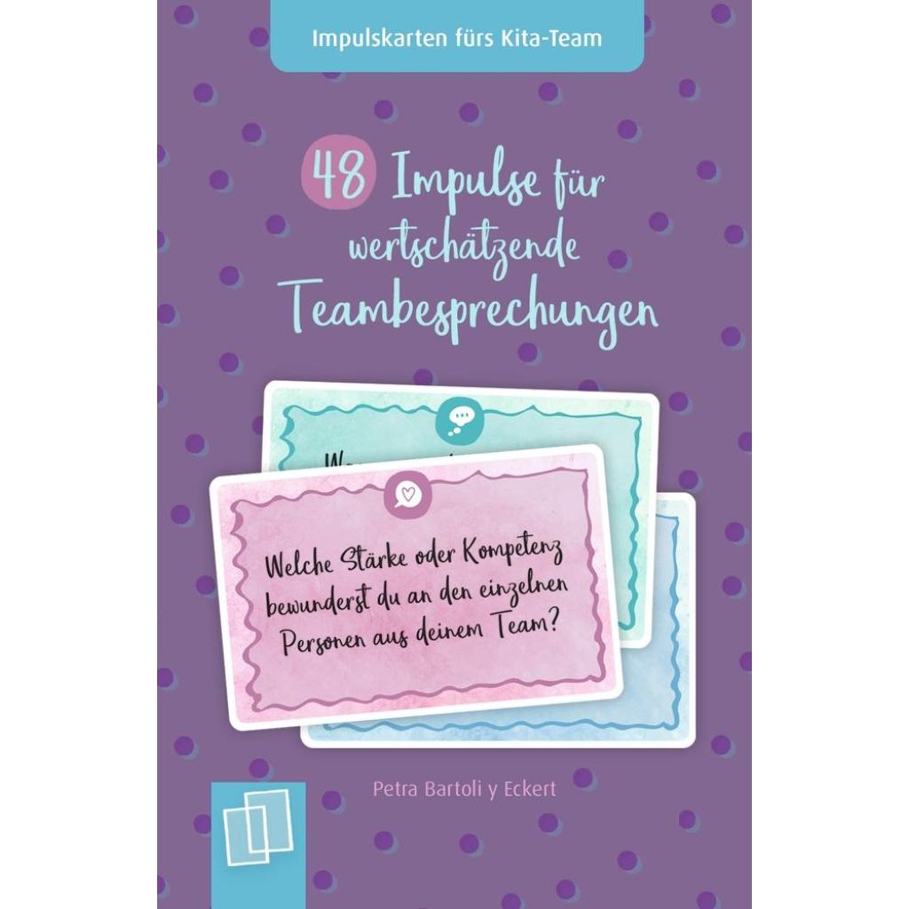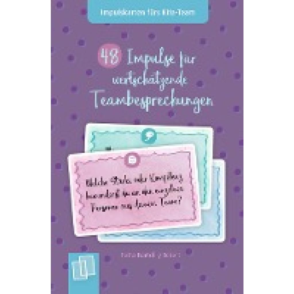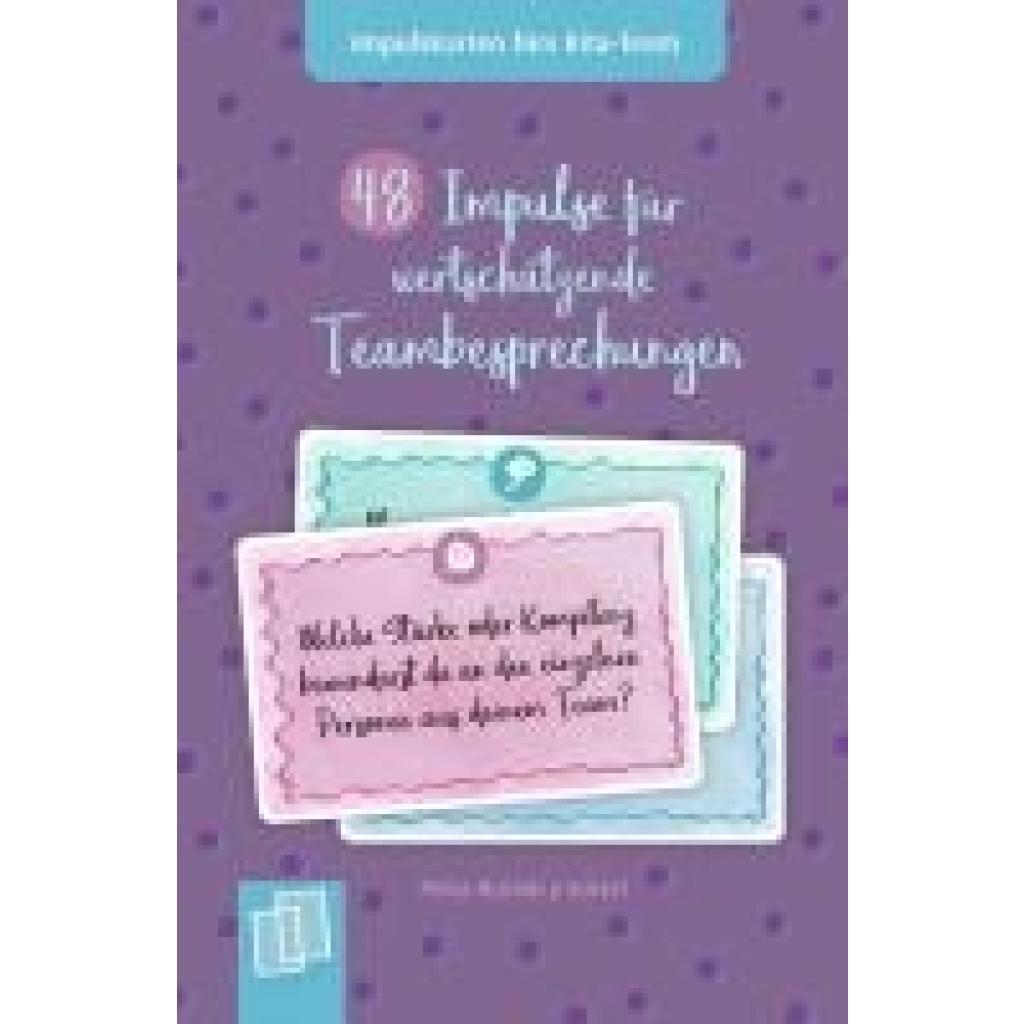| Keyword: | Antworten; Effektvolle Komunikation; Fragen; Gesprächsöffner; Gute Teambesprechungen; Impulse für Teambesprechungen; Karteikarten; Karten für die Teambesprechung; Kita-Team; Klima im Team fördern; Kommunikation; Nachdenken; Offene Kommunikation; Organisationshilfen; Planung von Teambesprechungen; Praxisratgeber; Selbstreflexion; Sitzungen; Team; Teamentwicklung; Verlag an der Ruhr Impulskarten; Verlag an der Ruhr Teambesprechungen; Visionen; Wertschätzung; Wertschätzung Kita-Team |