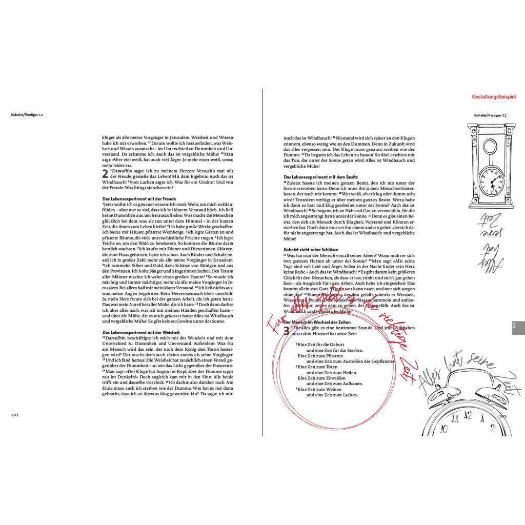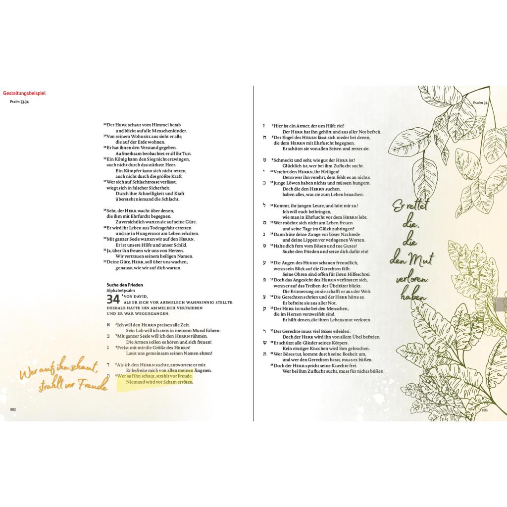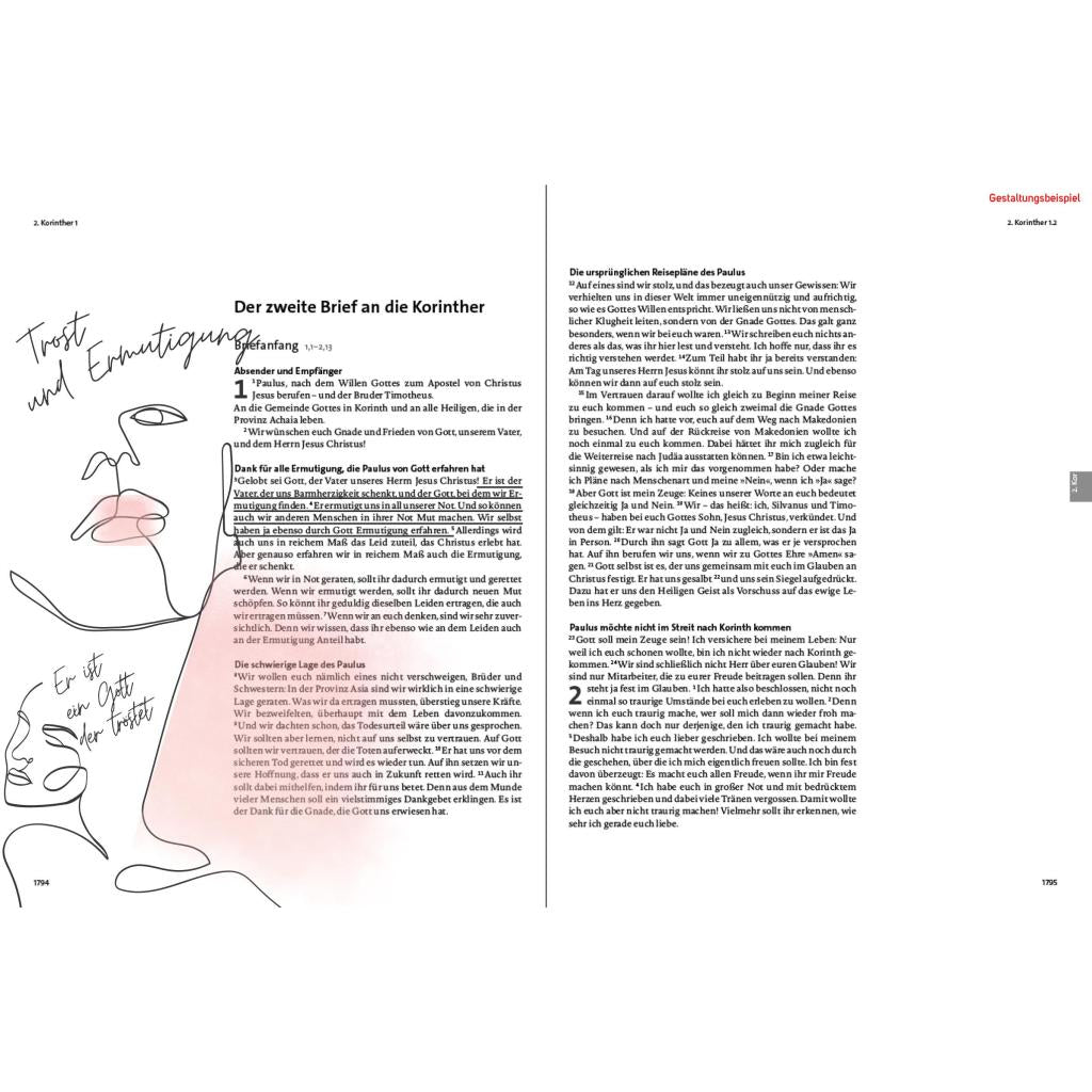 Für alle mit Freude an Kreativität: Die Bibel in der Art-Journaling-Ausgabe Skizzen, Collagen und Notizen: Diese Ausgabe der Basisbibel bietet Ihnen viel Freiraum für eine ganz individuelle Begegnung mit dem Wort Gottes. Die moderne Übersetzung der Heiligen Schrift in der Kreativ-Edition zeugt wie ein Tagebuch von eigenen Erinnerungen und Erfahrungen. Mit Zitaten, Liedtexten, Gedichten und Ausschnitten entsteht nach und nach eine schöne Bibel mit eigener Note - ein Bibeltagebuch, eine Bibel zum Selbstgestalten, eine Bibel für junge Leute und für alle, die kreativ mit der Bibel arbeiten wollen! - Persönlich und kreativ: die Bibel lesen und intuitiv mit eigenem künstlerischem Ausdruck gestalten - Viel Platz für eigene Texte und Bilder: Bibel im Großformat mit Schreibrand - Festes Dünndruckpapier für ein gutes Schreiben, Collagieren oder Zeichnen und Malen mit Buntstiften, Bleistiften, Kugelschreibern - Der große Trend Bible Art Journaling, Bible Lettering und Bible Journaling auf Deutsch Mehr Verbundenheit mit der Bibel durch eigene künstlerische Gestaltung Ob Trauer, Freude oder Wut, eine ungewöhnliche Begegnung oder eine Erfahrung, die nachhängt: In der Art-Journaling-Edition der BasisBibel findet Ihr kreativer Ausdruck seinen Platz. Gefühle und Gedanken verbinden sich in Bildern und Texten mit Bibelstellen, Bibelverse mit Alltagserlebnissen und der Lieblings-Psalm mit den eigenen Emotionen und Sehnsüchten. Mit der Zeit entsteht so Ihre ganz persönlich gestaltete Bibel mit allen Ideen, Sprüchen und Farben, die Ihr Leben mit Gottes Wort spiegelt.