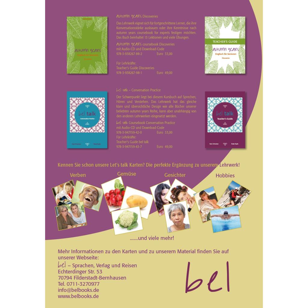 | Keyword: | 50 plus; Arbeitsbuch; Besser englisch lernen; Best Agers; Easy learning; Englisch; Englisch für Senioren; Senioren; Sprache lernen; Sprachenschule; Sprachkurse; Volkshochschule; Workbook; bel Konzept; bel verlag; belverlag |
