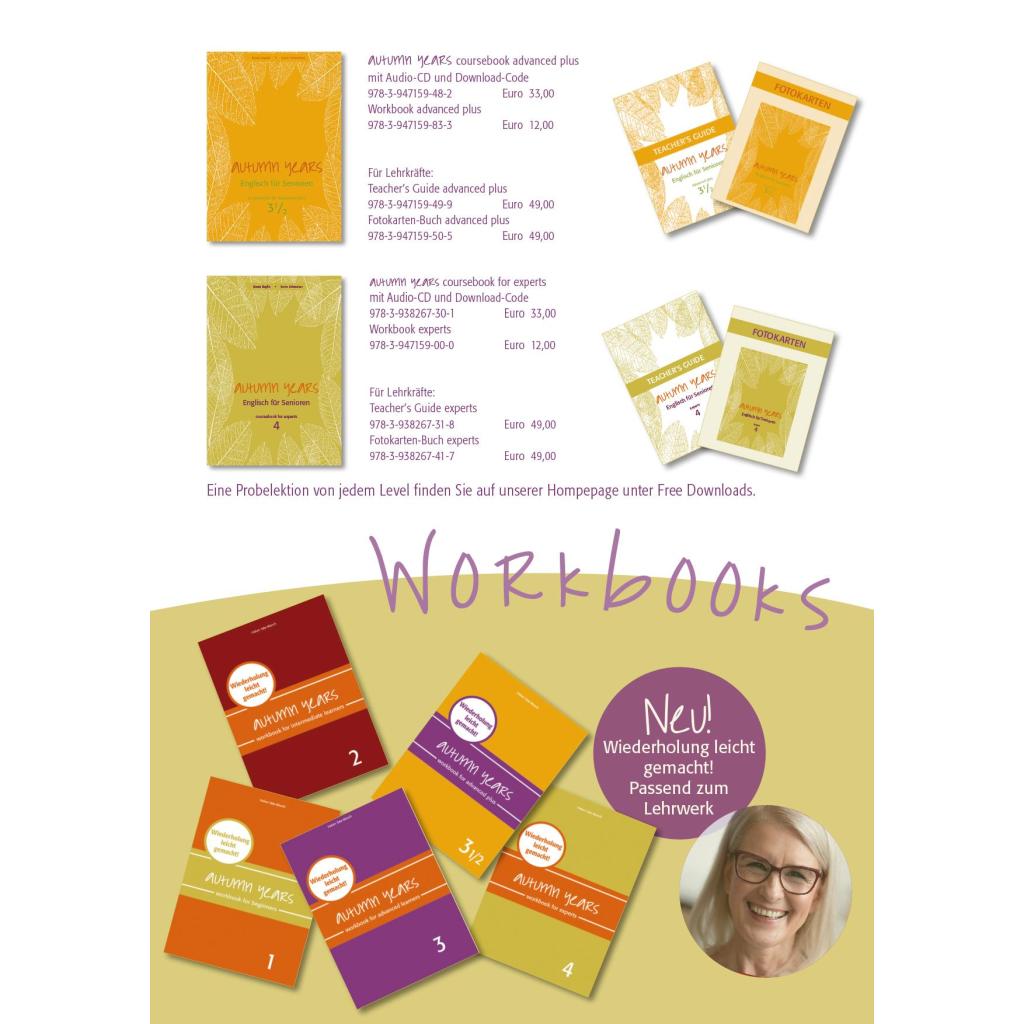 Sprechen und sich verständlich ausdrücken lernen ohne Hemmungen und dabei Spaß in der Gruppe und im Alltag haben - das ist das Motto, und genau danach entstand das etablierte und gleichzeitig aktuelle Lehrwerk für Junggebliebene aus dem bel Verlag "Autumn Years- Englisch für Senioren". Auf Schritt und Tritt begegnen sie uns: englische Worte und Sätze. Ob beim Einkauf im Supermarkt, beim Bestellen im Internet, in den sozialen Medien - überall dort, wo wir unterwegs sind. Und gleichgültig ob Sie Ihre Enkelin in England besuchen, gerne Reisen, sich im oft englischsprachigen Internet zurecht finden wollen, sich einfach und schnell im Alltag verständlich machen wollen oder sich mit Spaß geistig fit halten wollen: Englisch lernen mit "Autumn Years" ist ideal für Sie! "Autumn Years" ist Grundlage für ein unterhaltsames Lernen in entspannter Atmosphäre und gleichzeitig die Essenz der langjährigen und vielfältigen praktischen Arbeit der Autorinnen. Die Grammatik wird einfach und ohne viele Fachausdrücke erklärt und angewendet, zu jedem Thema gibt es viele ausführliche Beispiele mit praktischen Übungen. Alle verwendeten Vokabeln müssen nicht gepaukt werden, sondern werden im Zusammenhang erklärt und angewendet. Der Schwerpunkt liegt auf Sprechen, Hören und Verstehen. In diesem Lehrwerk begleiten Sie Anja und John auf Ihrer Reise in die USA. Die beiden verbringen schöne Tage in Johns Heimatland. Die Schüler erweitern spielerisch Ihren Wortschatz. Die Themen sind unter anderem: USA - Reisen - Formalitäten - Sehenswürdigkeiten in den USA - Phrasal verbs. Grammatikthemen sind unter anderem: Some/Any - Adverb/Adjective - pronouns - Simple past - will Future - going to future - present perfect - active/passive - prepositions - Flughafen. Autumn Years for advanced plus learners eignet sich für fortgeschrittene Lernende. Das Buch beinhaltet 13 Lektionen und viele Übungen. Wir empfehlen für das Lehrwerk ein ganzes Schuljahr einzuplanen. Autumn Years for advanced plus learners zeichnet sich aus durch viele Bilder und Sprechanlässe, wahre Geschichten, verständliche Grammatik, übersichtliche Gestaltung und lesefreundlichen Schrift. Zusätzlich erhalten Sie mit diesem Buch eine Audio-CD mit allen Dialogen und Texten, gesprochen von geschulten Sprechern - mit klarer und deutlicher Aussprache.
