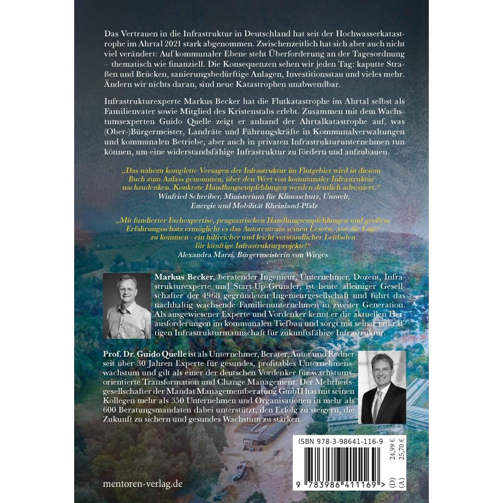 Das Vertrauen in die Infrastruktur in Deutschland hat seit der Hochwasserkatastrophe im Ahrtal 2021 stark abgenommen. Zwischenzeitlich hat sich aber auch nicht viel verändert: Auf kommunaler Ebene steht Überforderung an der Tagesordnung - thematisch wie finanziell. Die Konsequenzen sehen wir jeden Tag: kaputte Straßen und Brücken, sanierungsbedürftige Anlagen, Investitionsstau und vieles mehr. Ändern wir nichts daran, sind neue Katastrophen unabwendbar. Infrastrukturexperte Markus Becker hat die Flutkatastrophe im Ahrtal selbst als Familienvater sowie Mitglied des Kristenstabs erlebt. Zusammen mit dem Wachstumsexperten Guido Quelle zeigt er anhand der Ahrtalkatastrophe auf, was (Ober-)Bürgermeister, Landräte und Führungskräfte in Kommunalverwaltungen und kommunalen Betriebe, aber auch in privaten Infrastrukturunternehmen tun können, um eine widerstandsfähige Infrastruktur zu fördern und aufzubauen.