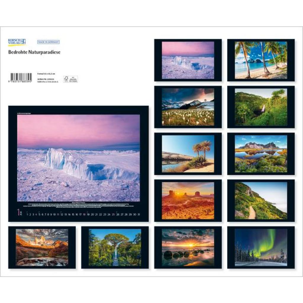 Atemberaubende Gletscher, faszinierende Wüsten- und Wasserlandschaften, Bergwelten und Regenwälder - allesamt einzigartige Ökosysteme, die durch den Klimawandel und menschliche Eingriffe in Gefahr sind. Mit großartigen Aufnahmen und spannenden Kurztexten ist dieser Kalender nicht nur ein toller Wandschmuck, sondern auch ein Plädoyer für den Schutz der letzten unberührten Naturparadiese der Erde. Klimaneutral hergestellt auf nachhaltig produziertem Papier. Hervorragende Druckqualität bis ins Detail Neutrales Kalendarium für alle Länder FSC zertifiziertes Papier aus verantwortungsvollen Quellen Schickes passepartout Design für einen wertigen Anblick Ihres Wandkalenders Korsch Wandkalender Entdecke die vielseitigen Einsatzmöglichkeiten für unseren Kalender, sei es im Büro, in der Küche, im Wohn- oder Schlafzimmer. Dieser Wandkalender ist nicht nur ein optisches Highlight, sondern auch ein praktischer Begleiter durch das Jahr. Er begeistert mit wechselnden, einzigartigen Motiven für jede Jahreszeit. Korsch Kalender zeichnen sich durch eine herausragende Druckqualität, eine stabile Spiralbindung und hochwertiges Papier aus. Dies gewährleistet ein müheloses Umblättern der Seiten sowie eine stilvolle Dekoration deiner Räume. Wähle aus verschiedenen Formaten unserer Poster-Kalender aus, um das passende Deko-Element für deine Wand zu finden!