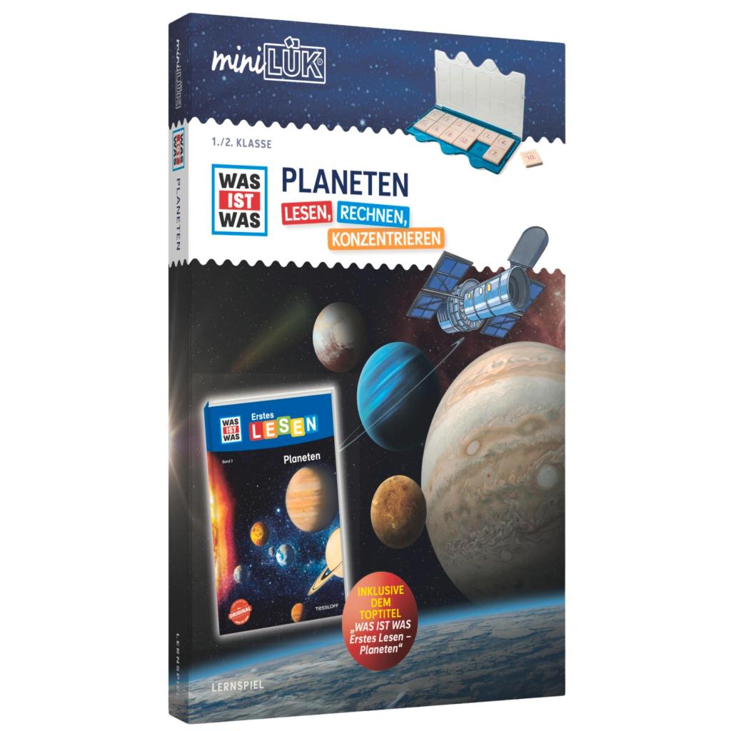 Im miniLÜK-Set " WAS IST WAS PLANETEN " wartet Weltraumwissen zum Staunen! Wie lange dauert ein Winter auf dem Uranus? Worin besteht der Unterschied zwischen Gas- und Gesteinsplanet? Was ist die Milchstraße? Während der Toptitel "WAS IST WAS Erstes Lesen ? Planeten" in kurzen Texten zum Selberlesen Wissenswertes vermittelt, sorgt das miniLÜK-Übungsheft für das nachhaltige Festigen der Fakten auf die LÜK-typisch spielerische Weise. Mithilfe von Sternenkonstellationen werden Matheaufgaben gelöst, nahezu mit Lichtgeschwindigkeit Lesen geübt und UFOs dank logischem Denkvermögen gesichtet. Abwechslungsreiche miniLÜK-Expeditionen rund um unser Universum vermitteln Sach- und Fachwissen auf die typisch spielerische Art und Weise. 3... 2... 1... Auf die Plättchen, fertig, los! Im Set enthalten sind: ein blaues miniLÜK-Kontrollgerät das Übungsheft "WAS IST WAS PLANETEN - Lesen, Rechnen, Konzentrieren" das Buch "WAS IST WAS Erstes Lesen! Planeten"
