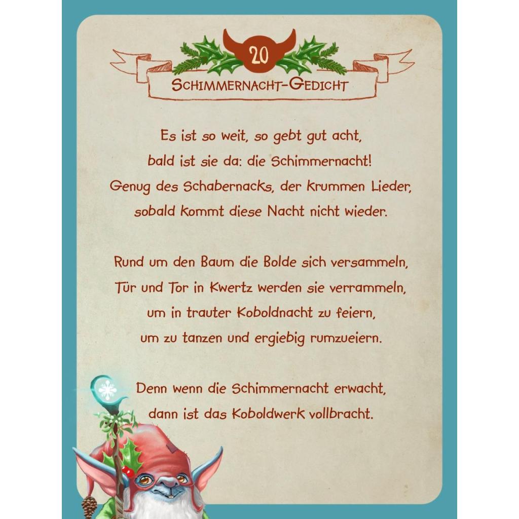 Mit den Kobolden durch den Advent Ihr werdet es mir vermutlich nicht glauben, aber auch in Kwertz wird Weihnachten gefeiert: Einige Traditionen bei der Koboldfest-Variante sind ziemlich gleich, andere Bräuche wiederum waren mir vorher eher unbekannt - wobei ich mir echt nicht sicher bin, ob die Kobolde sie von uns Menschen kopiert oder wir sie von den Kobolden übernommen haben ... Da ist zum Beispiel das Datum. Weihnachten wird in Kwertz schon am 21.12. gefeiert. In Blendheim, der Menschenwelt, findet da die Wintersonnenwende statt. Und die Sache mit den Tannenbäumen erst ... Aber ich will ja nicht spoilern! Bis zu eurem Fest könnt ihr euch auf jeden Fall die Zeit mit diesen 21 Umschlägen vertreiben (und für die fehlenden Tage bis Weihnachten gibt's hier noch drei Bonus-Umschläge). Ja, nur einen Umschlag am Tag öffnen, sonst zieht ihr euch den berühmt-berüchtigten Koboldzorn auf euch. Und der ist zu Weihnachten besonders heftig! Also dann, habt eine ruhige Vorweihnachtszeit! Euer Dario (mit knorkigen Grüßen auch von Rumpel) KoboldKroniken Adventskalender: Ein cooler Adventskalender ohne Schokolade Der ultimative KoboldKroniken-Adventskalender: Hochwertige Adventskalender-Box mit Rumpel, Dario, dem Ümpf und den Weihnachtswichteln für Kinder ab 9 Jahren. Eintauchen in die Welt der Kobolde: Alles über die magische Welt von Kwertz und ihre einzigartigen Weihnachtstraditionen. Adventlicher Rätsel- und Beschäftigungsspaß: Mit 24 Kärtchen inkl. Umschlägen voller Rätsel und kreativer Ideen wird jeder Tag zu einem koboldigen Abenteuer. Tolles Geschenk: Ein cooler Begleiter durch die Adventszeit und eine tolle Alternative zum herkömmlichen Schokoladenkalender. So wird die Wartezeit auf Weihnachten unterhaltsam verkürzt!