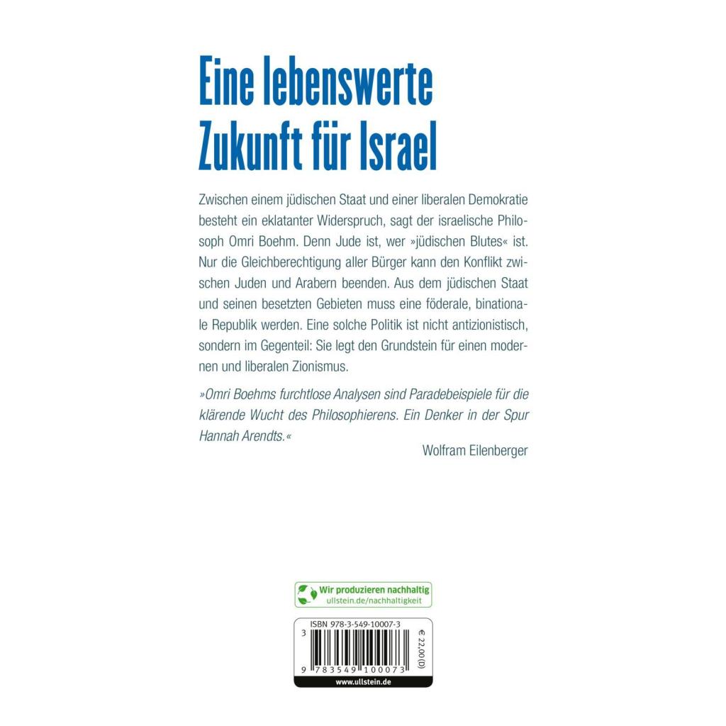 Eine lebenswerte Zukunft für Israel Zwischen einem jüdischen Staat und einer liberalen Demokratie besteht ein eklatanter Widerspruch, sagt der israelische Philosoph Omri Boehm. Denn Jude ist, wer 'jüdischen Blutes' ist. Nur die Gleichberechtigung aller Bürger kann den Konflikt zwischen Juden und Arabern beenden. Aus dem jüdischen Staat und seinen besetzten Gebieten muss eine föderale, binationale Republik werden. Eine solche Politik ist nicht antizionistisch, sondern im Gegenteil: Sie legt den Grundstein für einen modernen und liberalen Zionismus. 'Omri Boehms furchtlose Analysen sind Paradebeispiele für die klärende Wucht des Philosophierens. Ein Denker in der Spur Hannah Arendts.' Wolfram Eilenberger