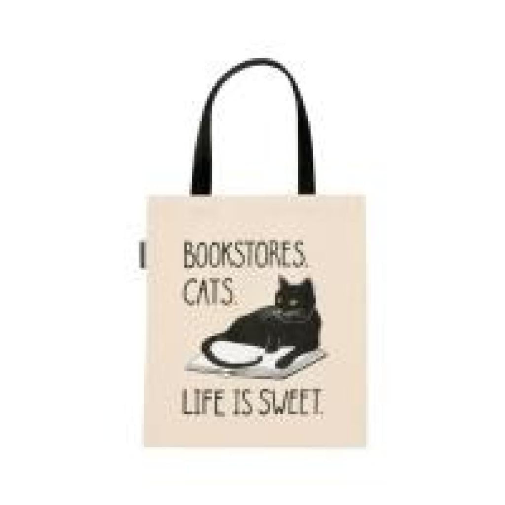 "Bookstores. Cats. Life is sweet." tote bag Product Details ¿ 100% cotton canvas ¿ Inner pocket ¿ Flat tote ¿ 15" w x 17" h ¿ 11" strap (hanging) ¿ Made in the USA