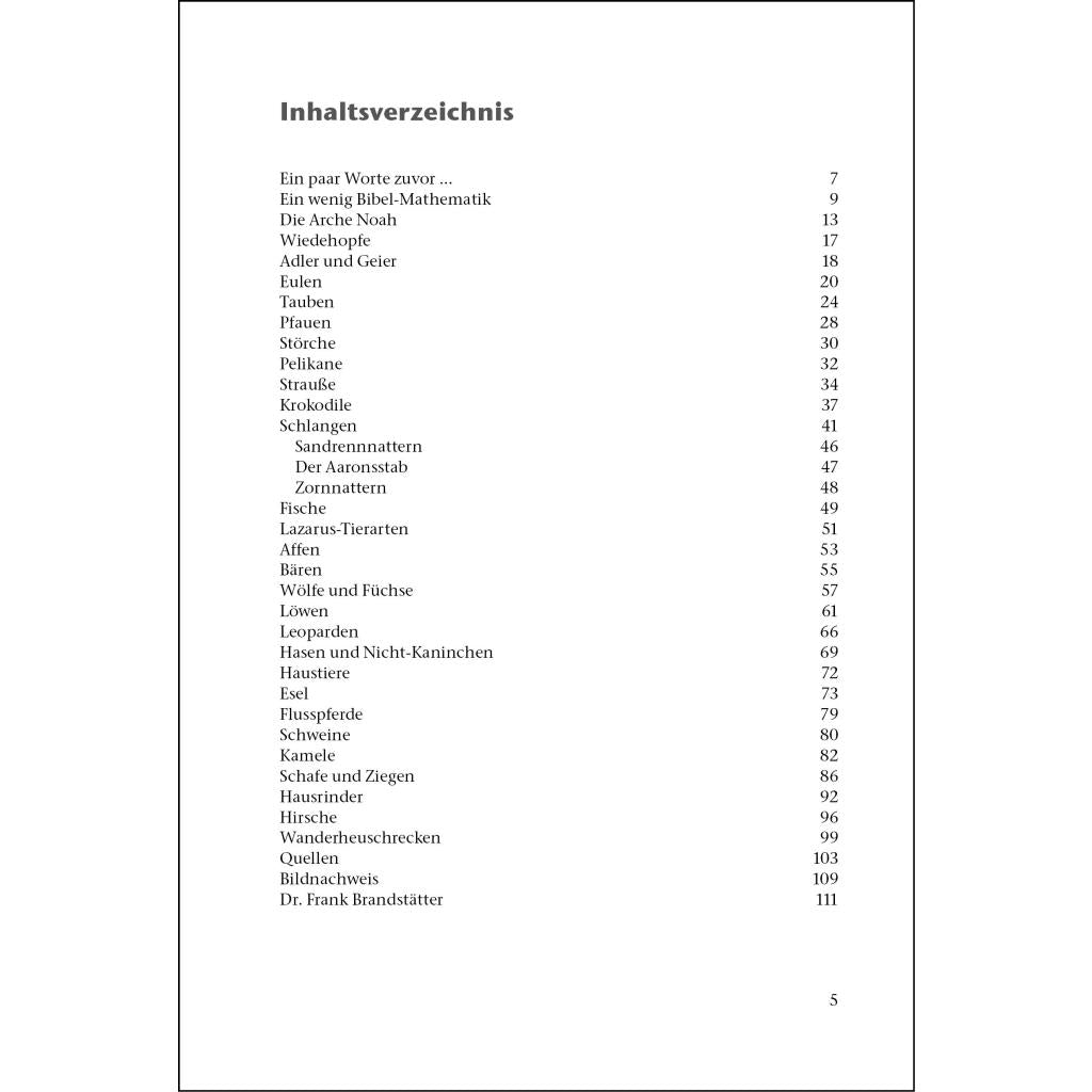 Die Bibel als Tierlexikon Heuschrecken, Schlangen, Esel - einige Tierarten sind untrennbar mit biblischen Geschichten verbunden. Aber hätten Sie gewusst, dass in der christlichen Überlieferung auch Wiedehopf und Pelikan vorkommen? Und was macht eigentlich das Flusspferd in der Heiligen Schrift? Dr. Frank Brandstätter, Direktor des Dortmunder Zoos, befasst sich seit 20 Jahren mit den Tieren der Bibel. In diesem Buch nimmt er Bibelpassagen mit zoologischen Bezügen akribisch unter die Lupe und zeigt, wie präzise die Autoren der Heiligen Schrift in ihren Beschreibungen der Fauna waren. Dazu liefert er spannende Fakten über die Lebensweisen der Tiere und verrät unter anderem, warum das Kamel nur ungern durchs Nadelöhr geht. Wissenschaft trifft religiöse Überlieferung - das muss kein Widerspruch sein!