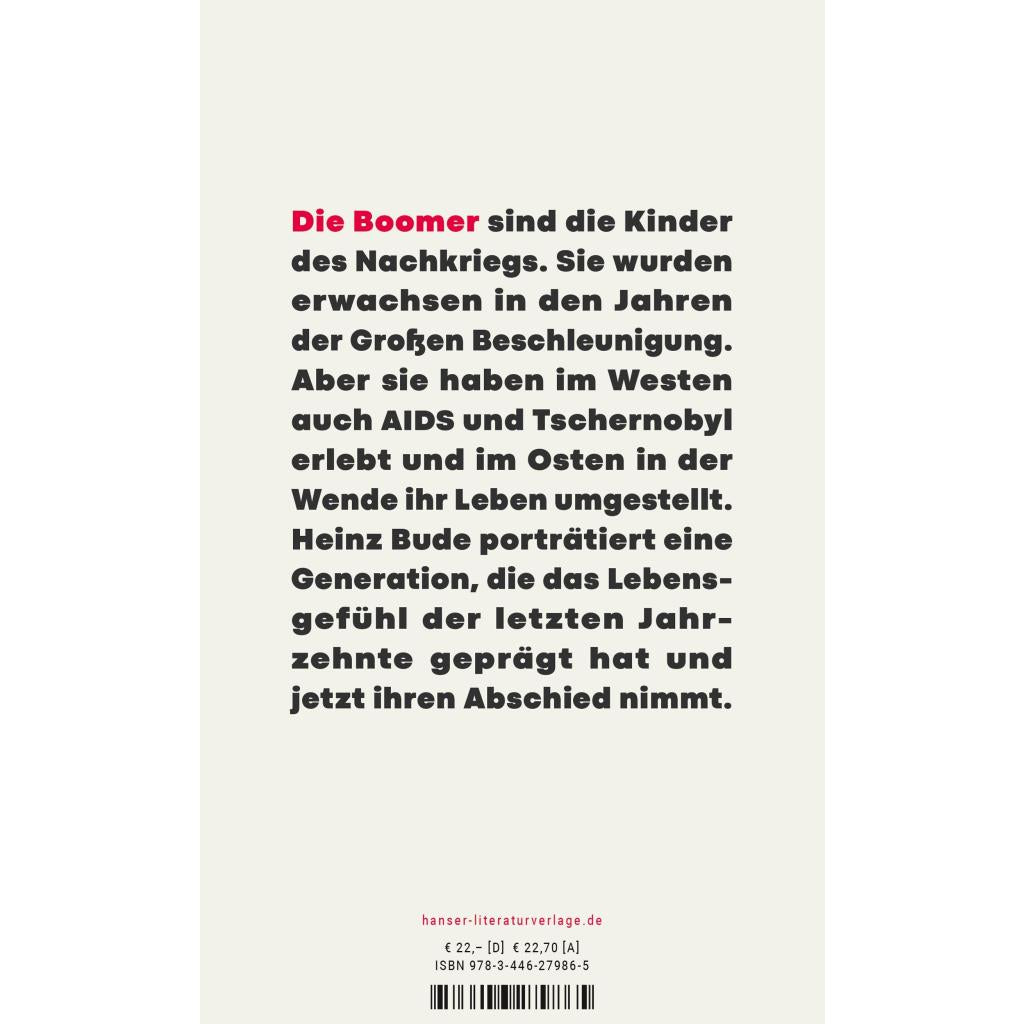 Bye, bye, Boomer! Das Portrait einer Generation und ihrer inneren Widersprüche von Heinz Bude Die Boomer nehmen Abschied. Wer zwischen 1955 und 1970 in der Zeit der geburtenstarken Jahrgänge zur Welt gekommen ist, hat den Ruhestand erreicht oder zählt zu den Älteren, die nach und nach ihre Posten freimachen. Die Boomer verbindet das Gefühl, dass es zu viele von ihnen gibt, das spürten sie schon in überfüllten Klassenzimmern und später auf dem Arbeitsmarkt. Daraus resultierte eine Haltung der Skepsis, und die Erfahrung von AIDS und Tschernobyl hat sie in einer entscheidenden Phase ihrer Biografie gelehrt, dass nichts gesichert und gar nichts garantiert ist. Heinz Bude, ein früher Boomer, beschreibt, wie sich mit dieser Generation auch ein Lebensgefühl verabschiedet, das unsere Gesellschaft über Jahrzehnte geprägt hat.