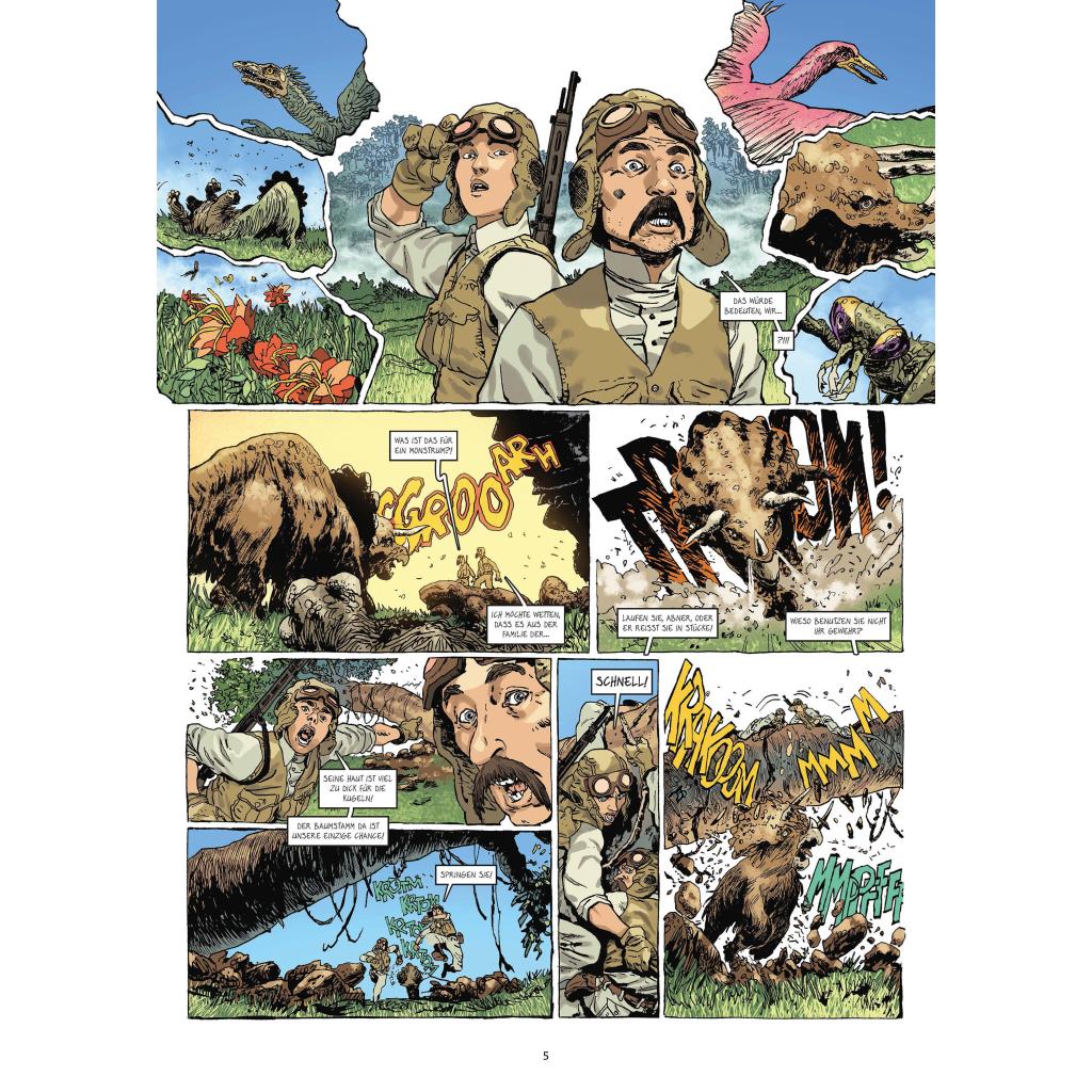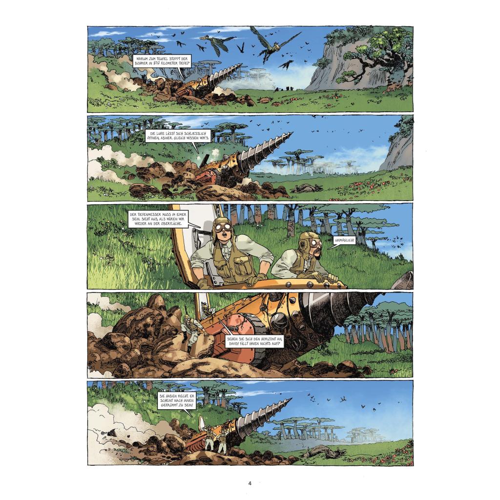Nichts hätte den Prospektor David Innes und den Erfinder Abner Perry darauf vorbereiten können, was sie zu Gesicht bekommen, nachdem sie sich mit ihrem revolutionären Tunnelfahrzeug tief ins Innere der Erde gebohrt haben: Einen neuen Kontinent, denn die Erde ist offenkundig hohl! Dieses Land, das sie Pellucidar taufen, ist von üppiger Vegetation überwuchert und wird von prähistorischen Tieren bewohnt sowie von primitiven Humanoiden, die mal mehr, mal weniger menschlich wirken. Pellucidar kennt keine Nacht, denn die rätselhafte Sonne dieser Welt steht ewig still in ihrem Zentrum. Aber bei allen Unterschieden gilt ein Gesetz des Lebens im Erdkern ebenso wie auf der Oberfläche: Die Starken herrschen und die Schwachen leiden. Innes und Abner jedoch sind wild entschlossen, diesem Recht des Stärkeren im Geiste der Aufklärung entgegenzutreten... Edgar Rice Burroughs ist heutzutage vor allem als Schöpfer von 'Tarzan' bekannt. Dabei war er auch ein Vorreiter der Science Fiction, speziell des Genres der Planet Opera: Ob romantisch in 'Die Prinzessin vom Mars', monströs in 'Das vergessene Land' oder geologisch in 'Am Mittelpunkt der Erde' - Burroughs versteht es, Abenteuer und Wissenschaft meisterlich zu verbinden. Jean-David Morvan erweckt ein zentrales Werk in dieser Sammlung abgeschlossener Graphic Novels getreu den Originalvorlagen und souverän illustriert zu neuem Leben.