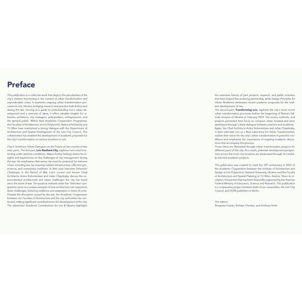 The city of Lviv in western Ukraine has been undergoing a process of transformation for several years aimed at modernising its infrastructure and promoting urban development. The challenges the city faced reached an unprecedented level following Russia's full scale invasion in February 2022. Lviv quickly became a critical hub for hundreds of thousands of people fleeing the war-torn regions of eastern Ukraine. The city was tasked with mitigating the immediate effects of the war while developing resilient structures to sustain this role in the short, medium, and long term. Even before the war, the city fostered smart dialogue between research and practice in local and international contexts. Through their Academic Cooperation Programme, the Faculties of Architecture at Lviv Polytechnic National University and TU Wien contribute to this continuous dialogue. This book discusses practical and academic proposals for the urban transformation of Lviv, particularly during the ongoing crisis. It thereby offers valuable insights for urbanists, architects, city managers, policy makers, entrepreneurs, and the general public.